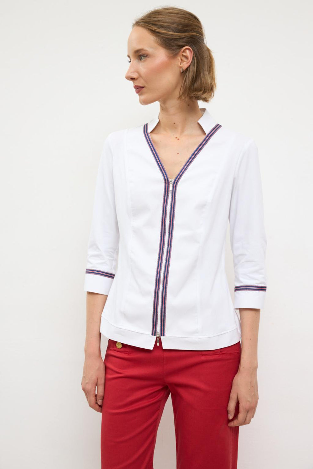 Three-quarter sleeve shirt. Open mandarin collar. Tricolor piping detail at neckline and cuffs. V-neck. Front zip fastening and straight hem. 96% cotton