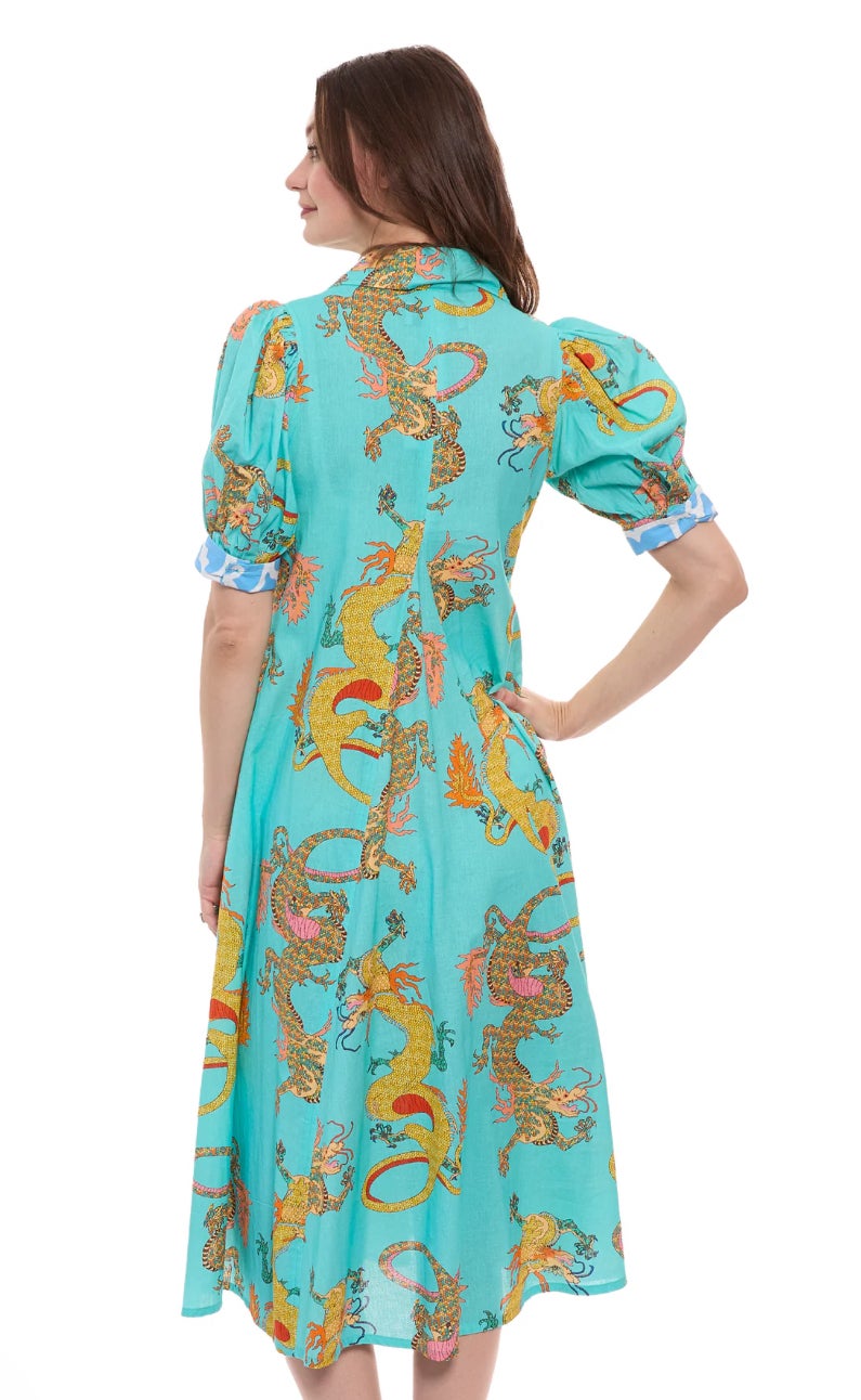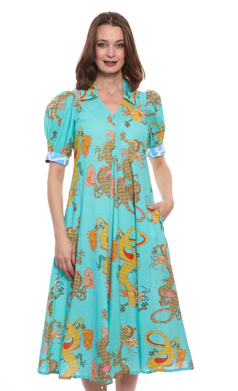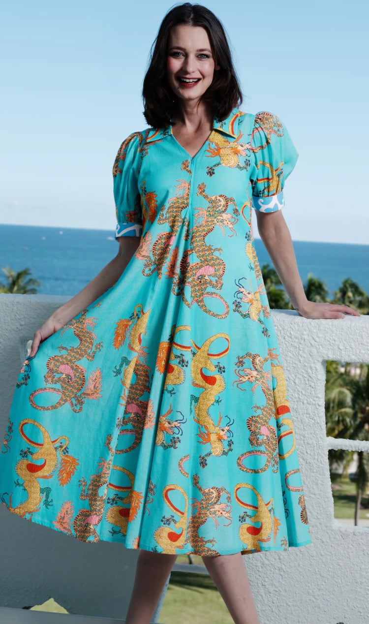 Discover the Montauk Dress, a stunning blend of linen and cotton in a vibrant turquoise adorned with an eye-catching dragon print. This dress offers breathable comfort while showcasing a unique style perfect for any occasion. Ideal for sunny days or casual gatherings, the Montauk Dress makes a bold fashion statement. Embrace the chic design and add this standout piece to your wardrobe for an unforgettable look.