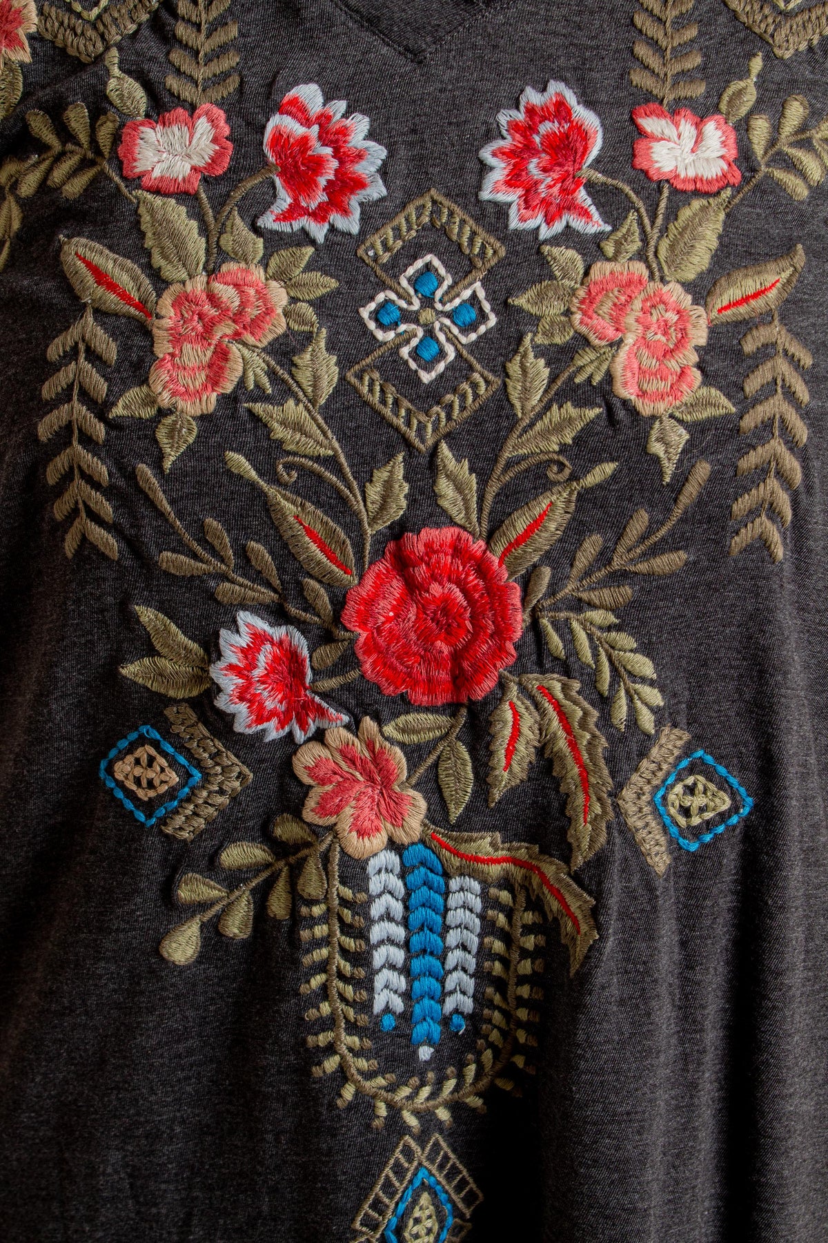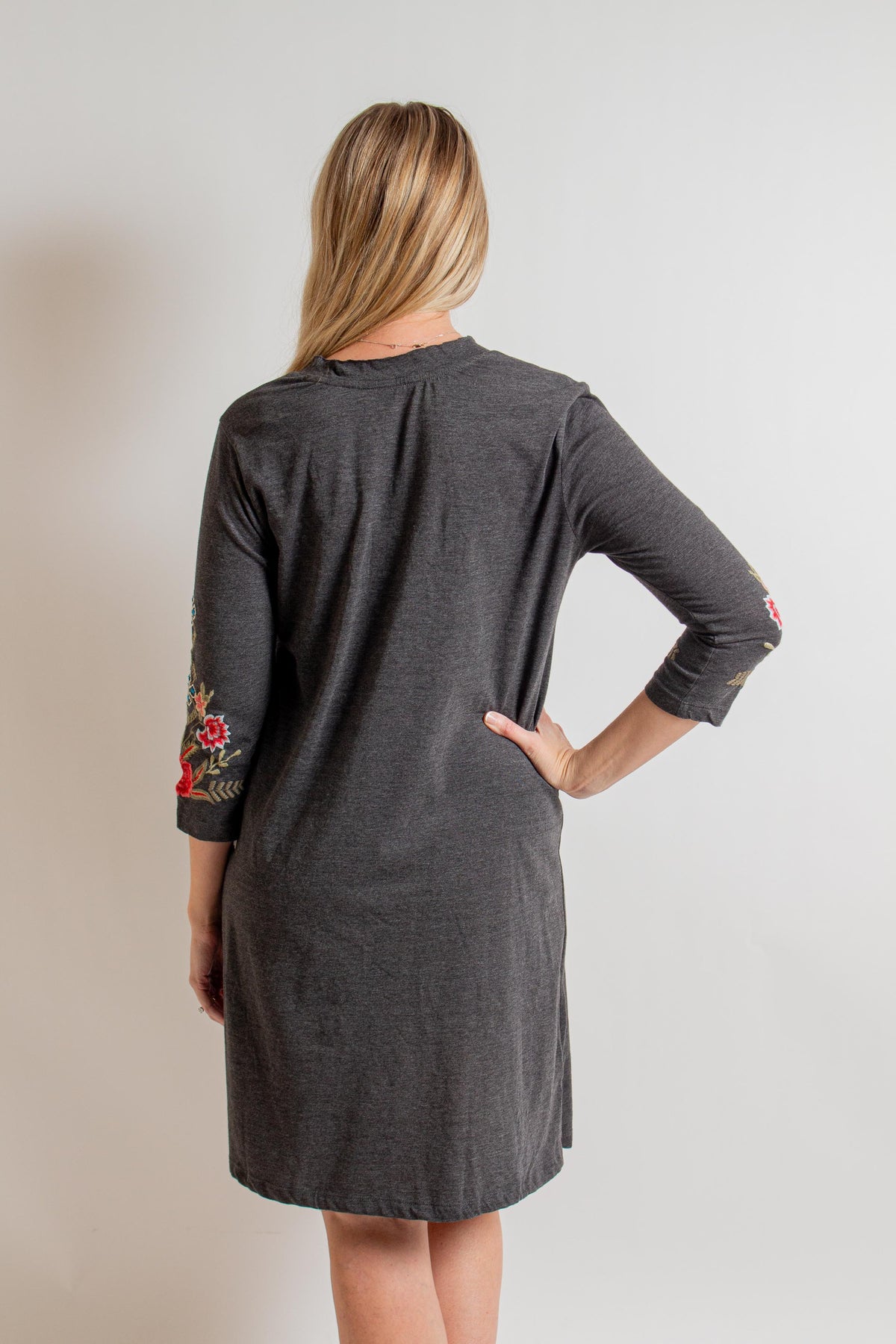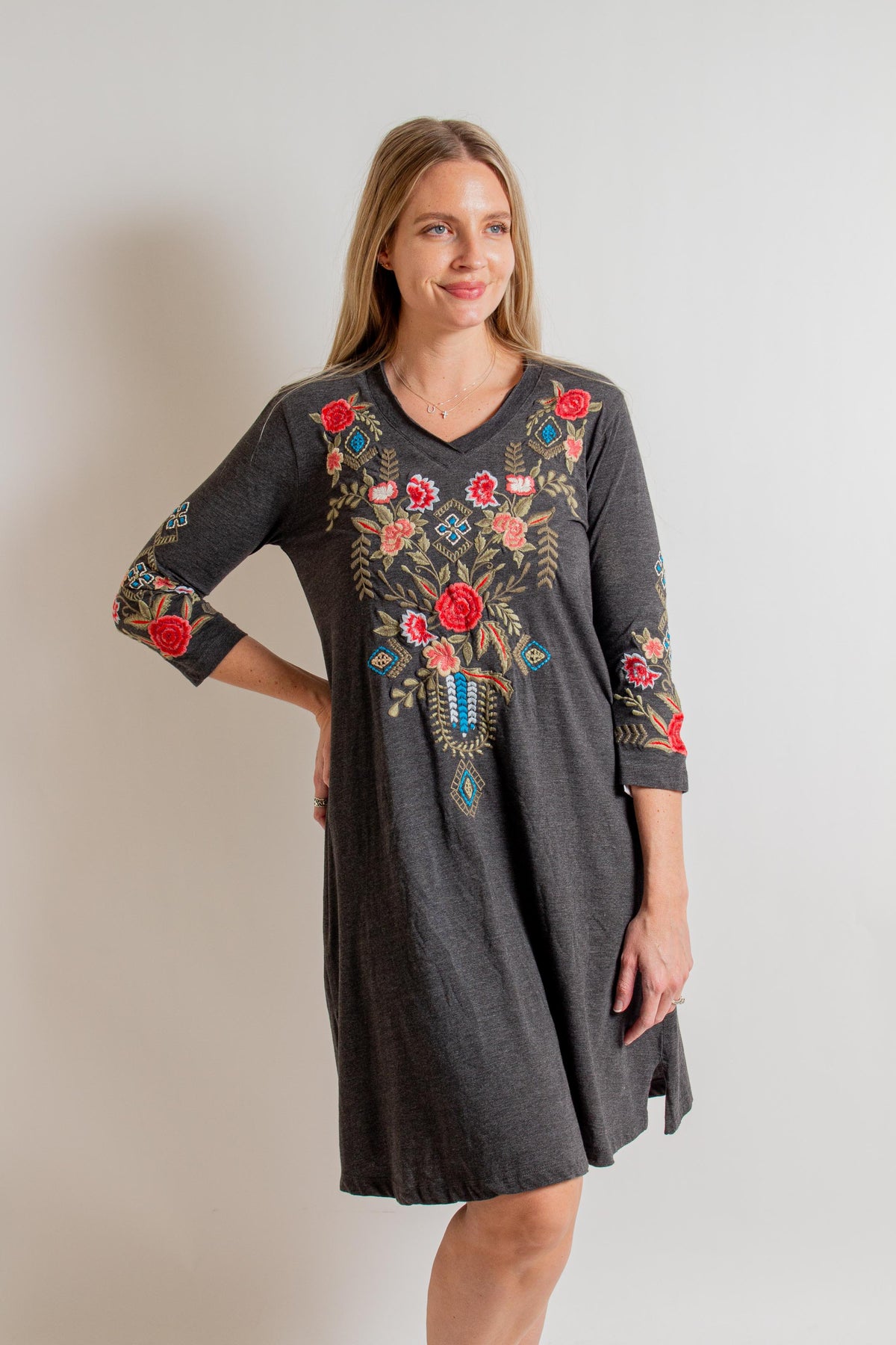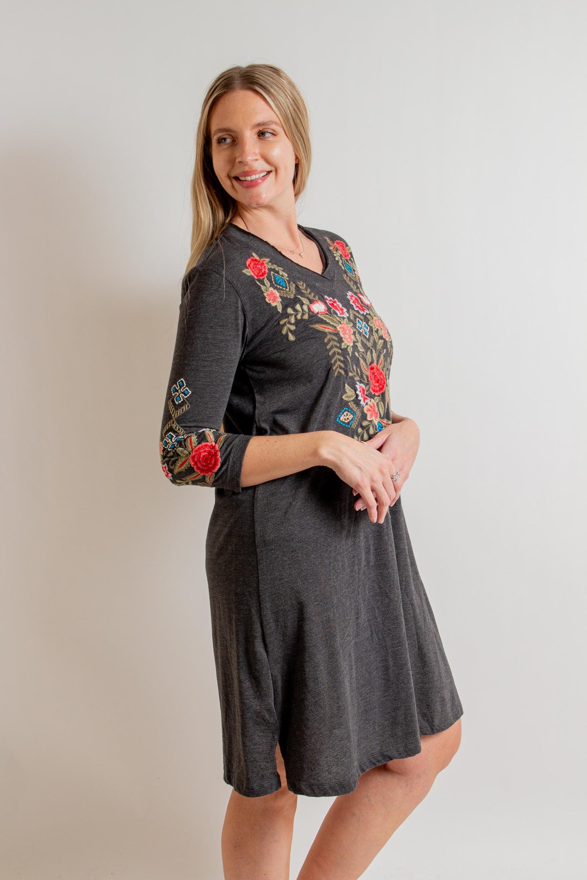 "Lisette" Dark Heather Grey Midi Dress with 3/4 Sleeves, V-Neck and Multicolor Floral Embroidery.