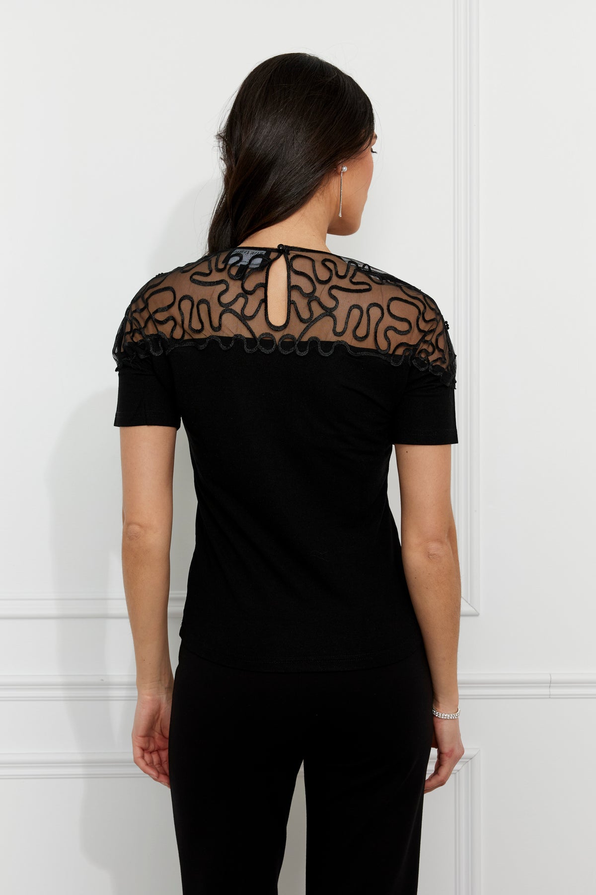 Black Short Sleeve Top with Mesh Beaded Neck and Button Closure at Back of Neck. Fabric: 70% Rayon, 6% Elastane