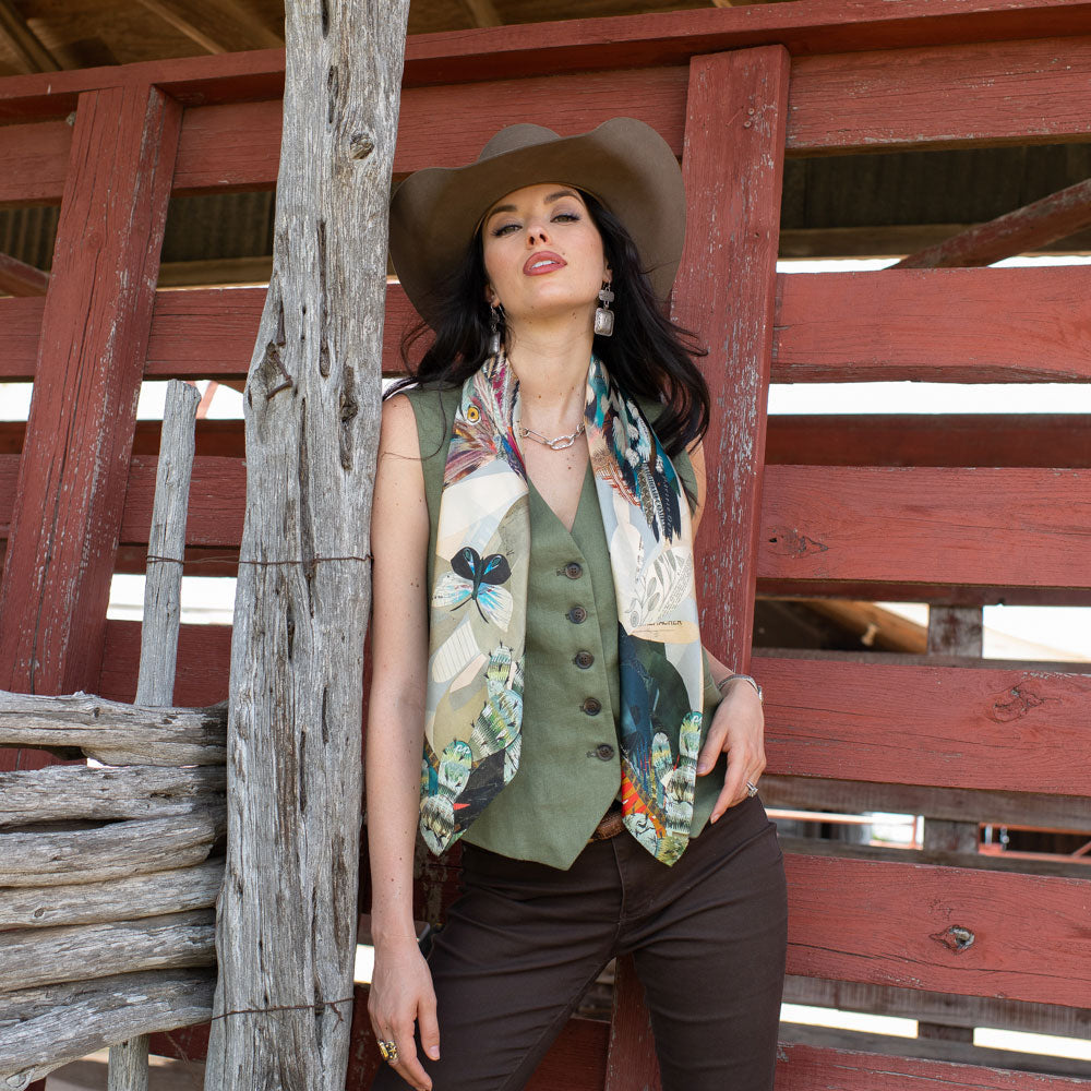 Indigo Morning is a new wild rag in our Artist Collection by Dolan Geiman. Dolan first appeared in our Artist Corner last season, his line quickly became a best seller. Dolan is a Nationally Recognized Mixed Media Artist known for his unique and beautiful interpretations of the iconic West.