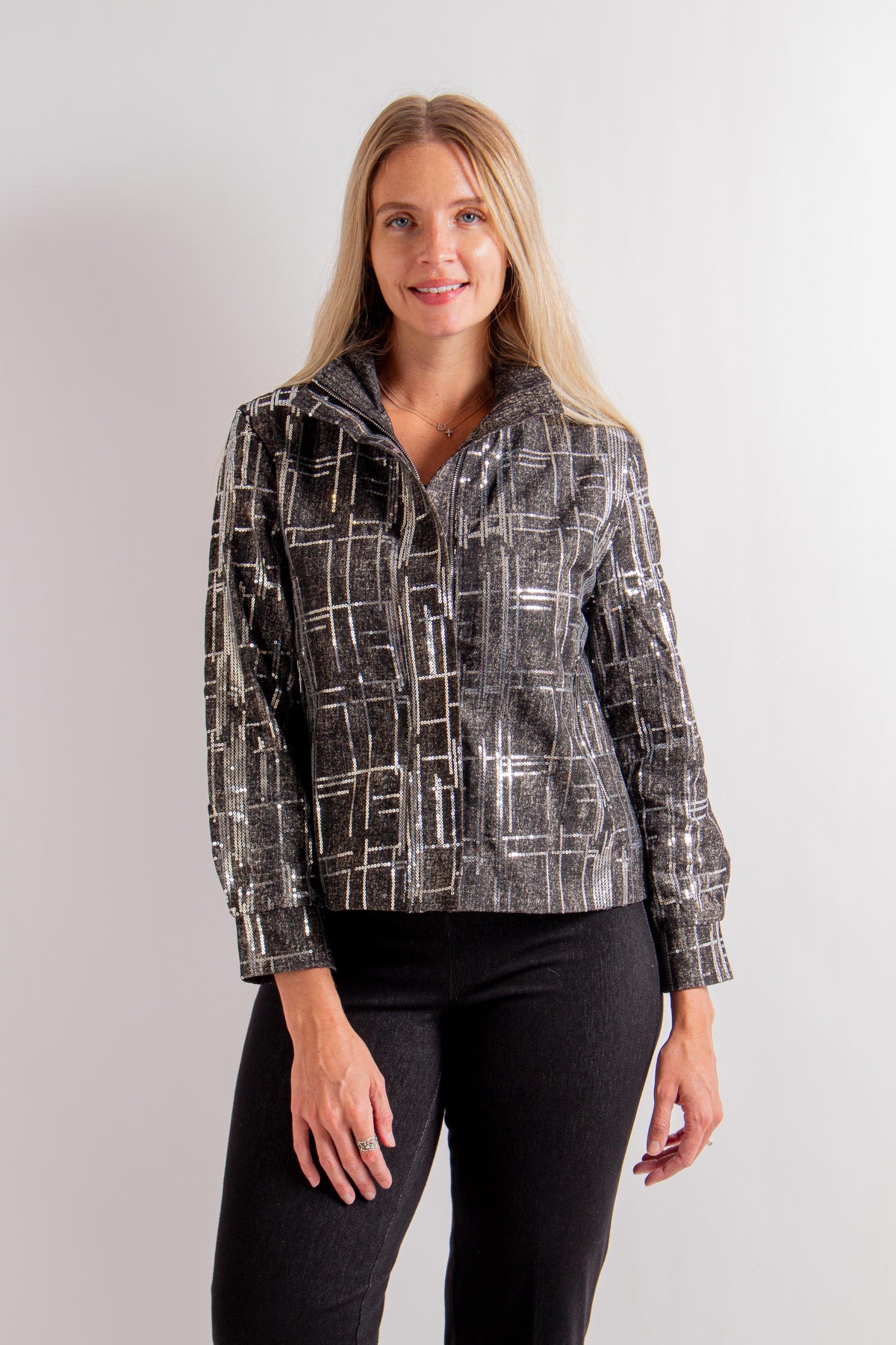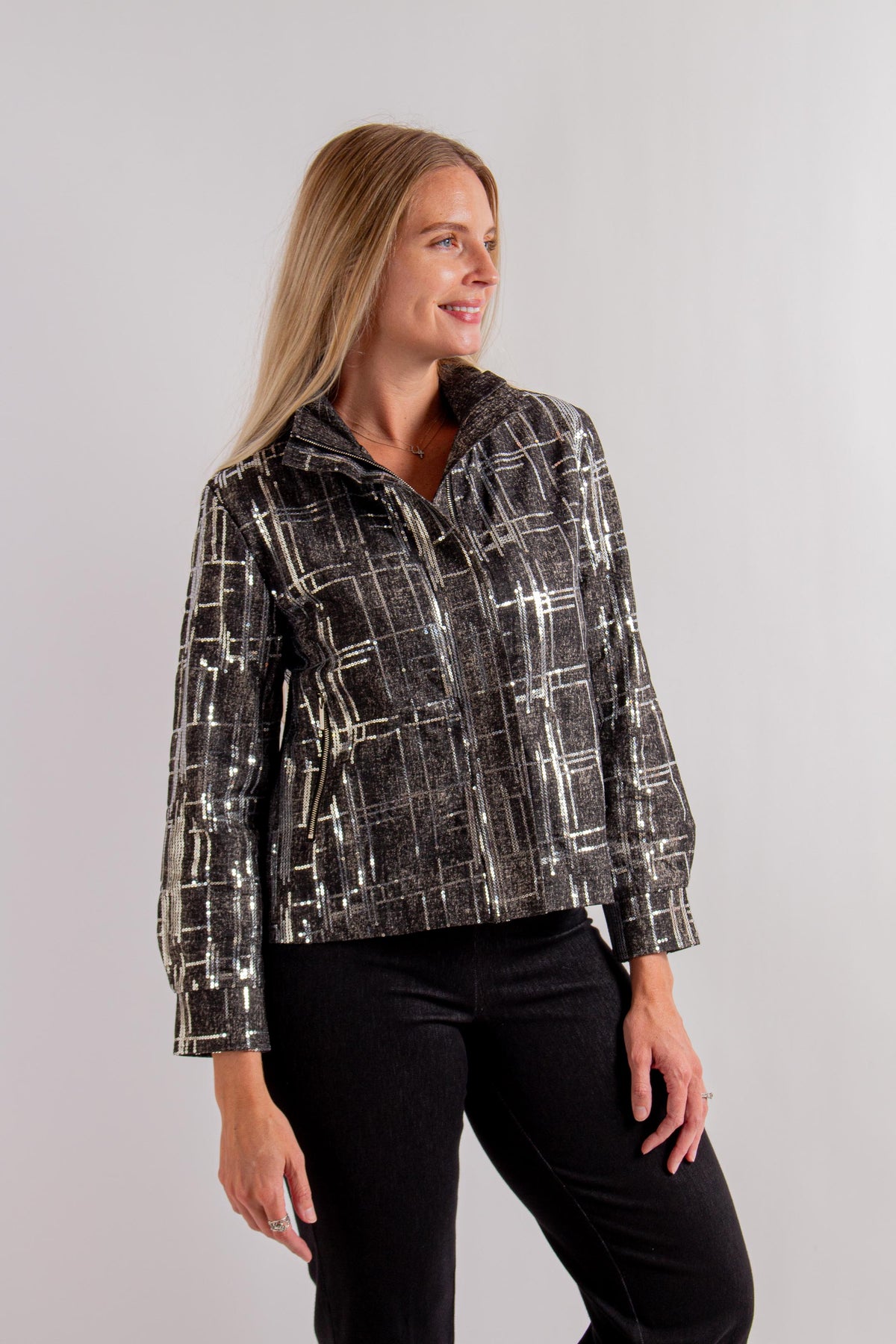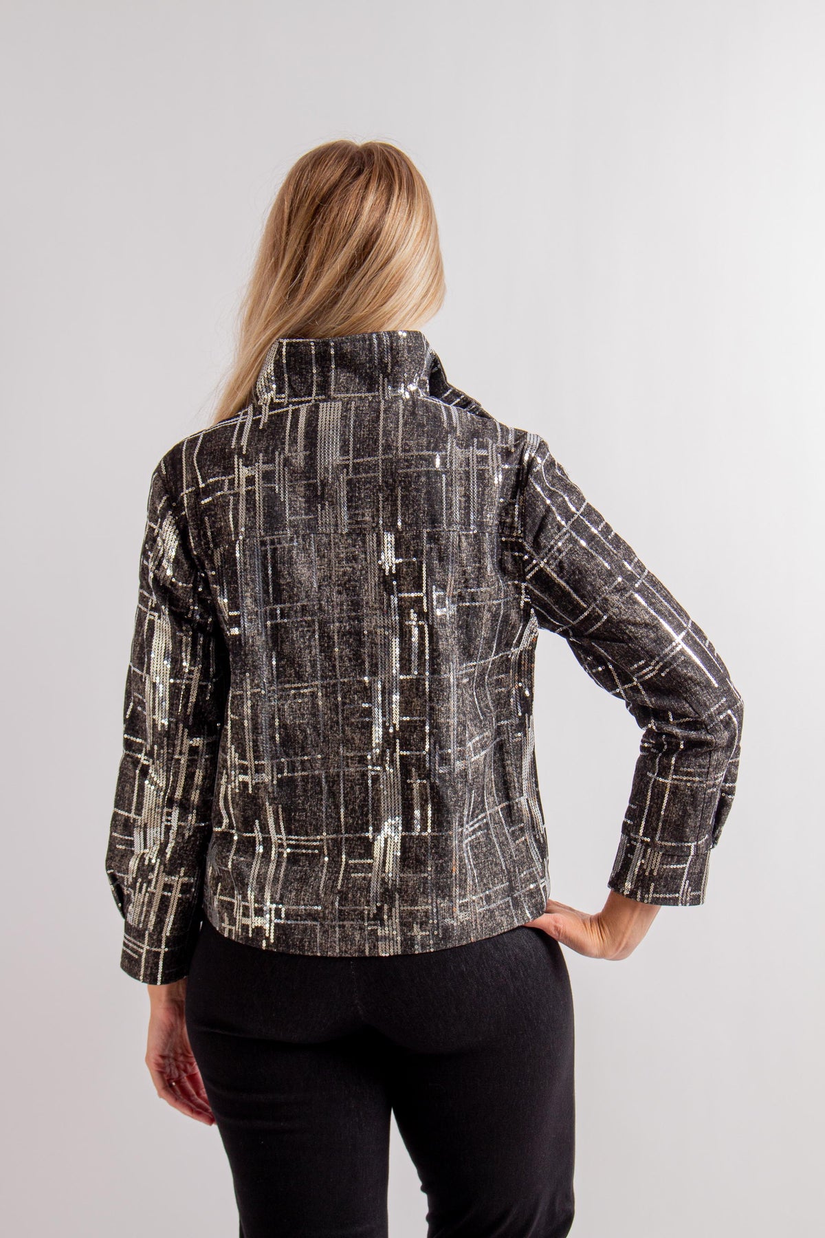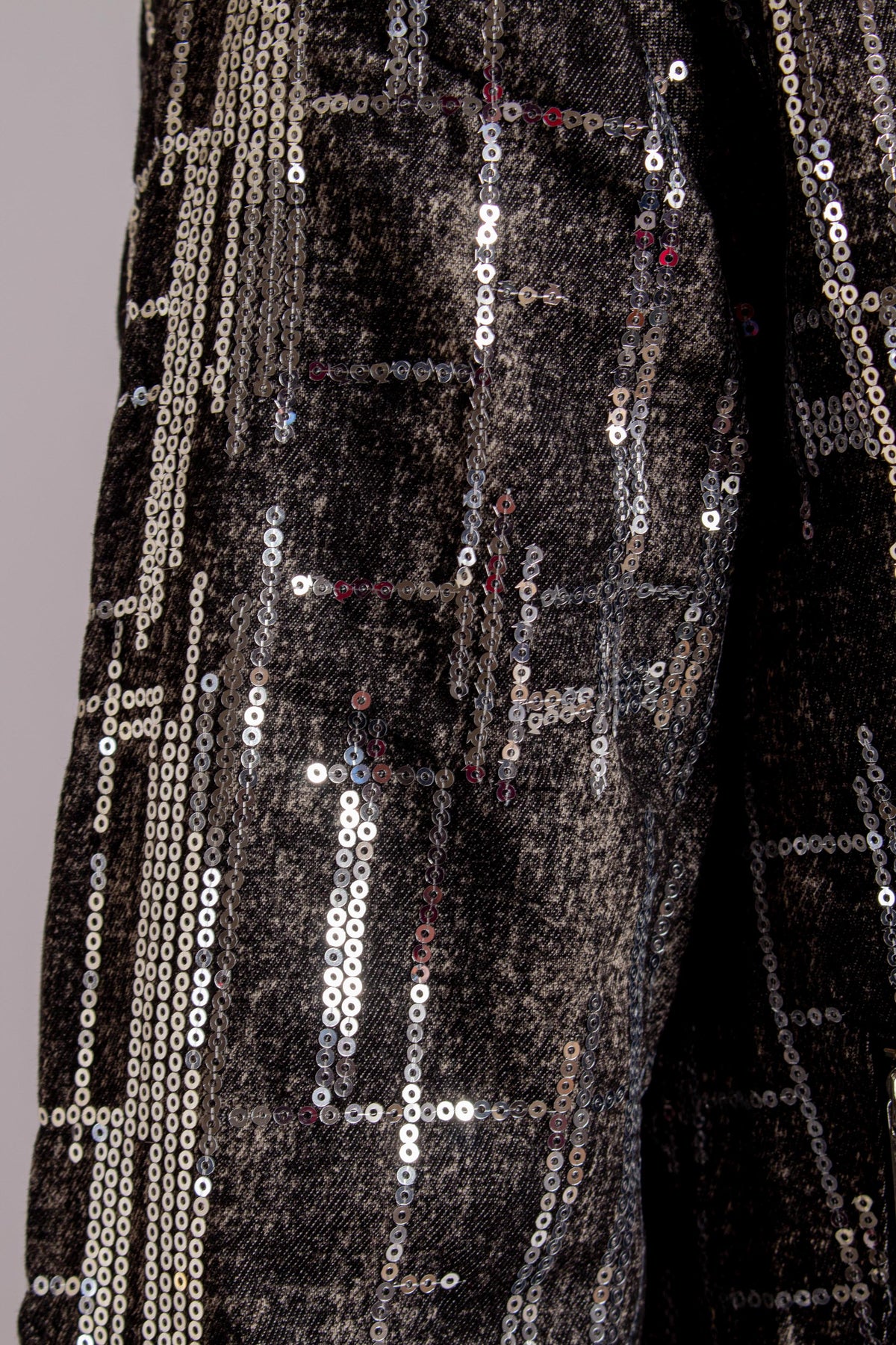 Black and Silver Sequined Denim Biker Jacket with Front Zip Closure and Zip Pockets. Fabric: 100% Polyester