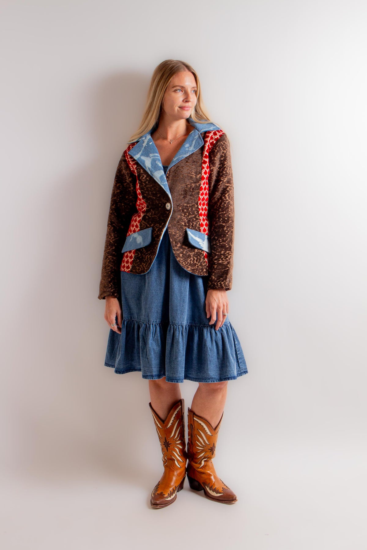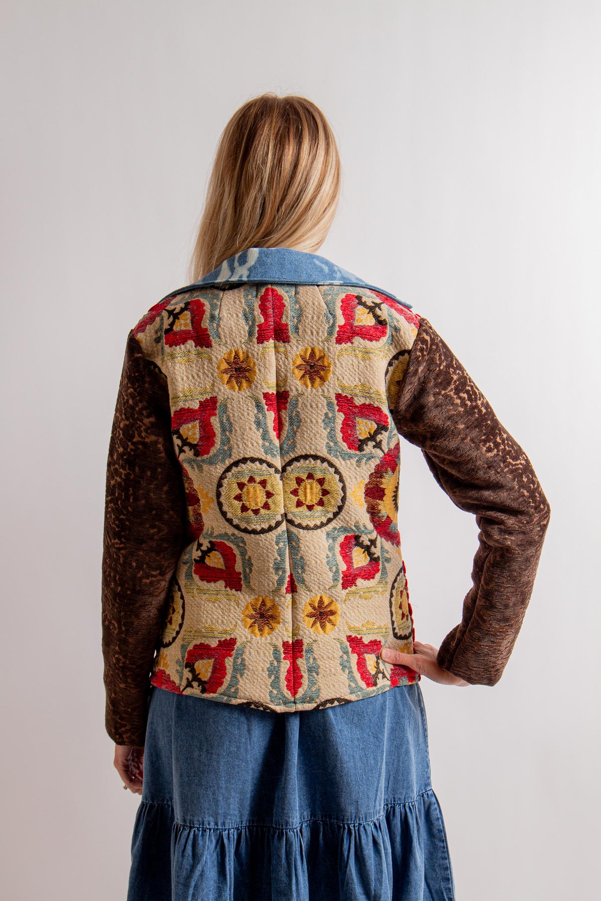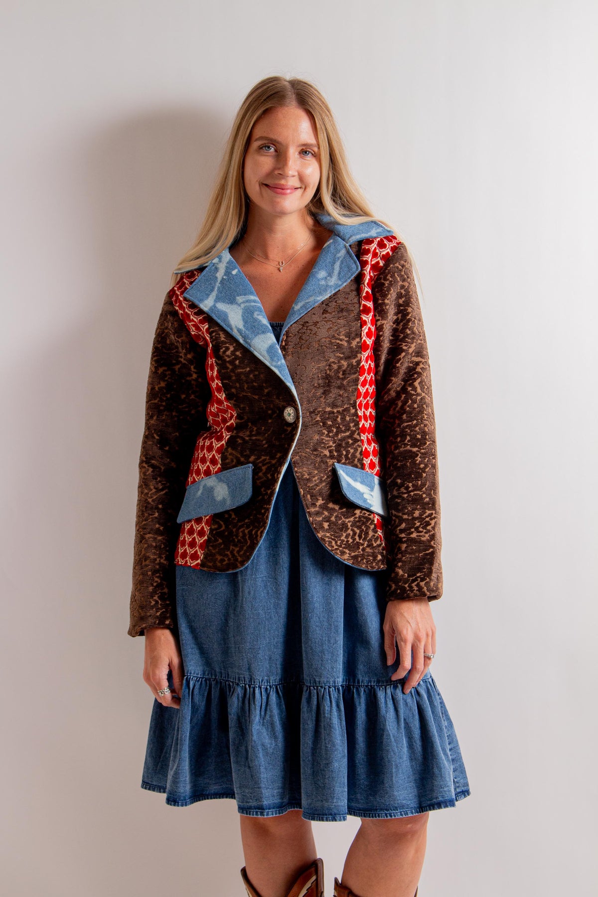 "Carye" Indian Outlaw Brown, Blue & Red Jacket with Print at Back.