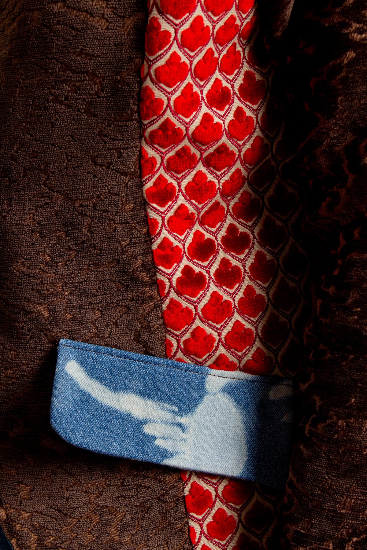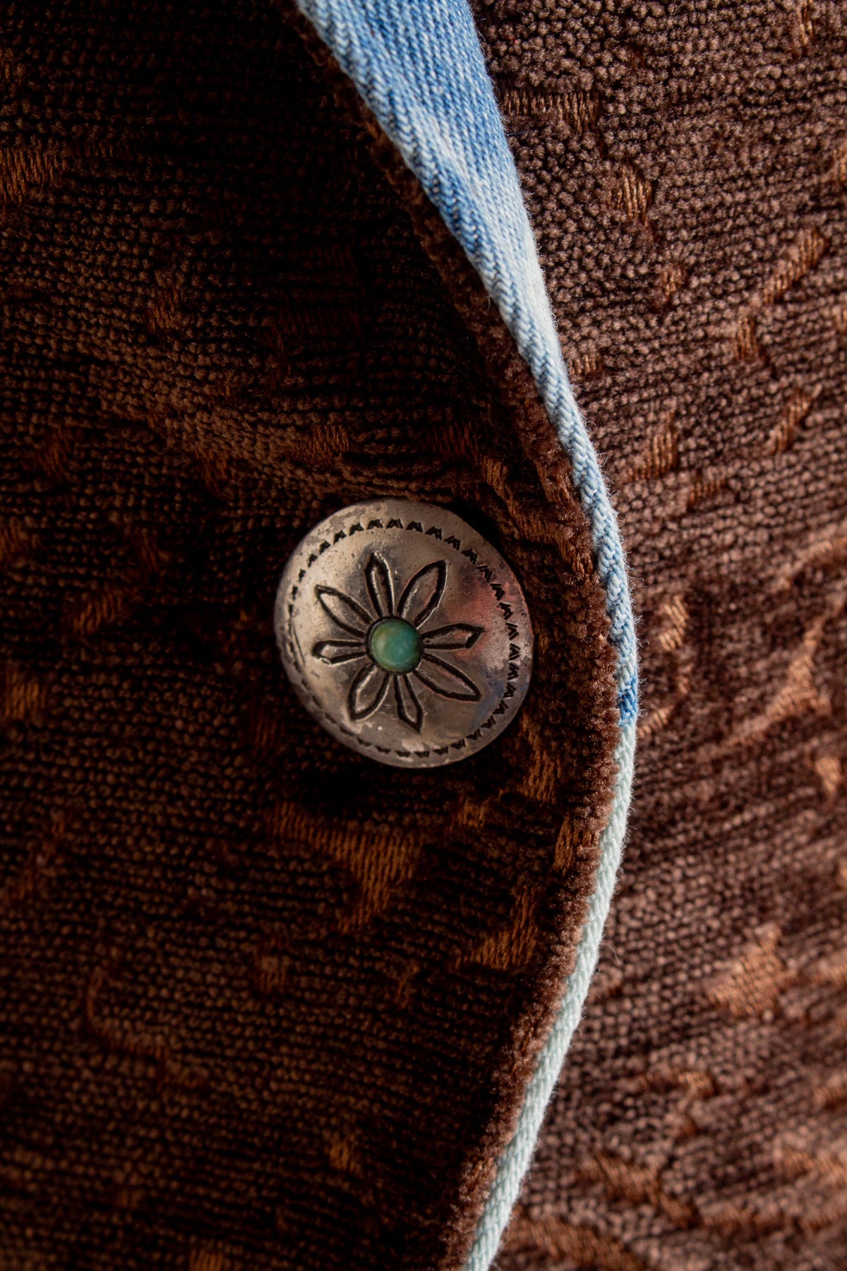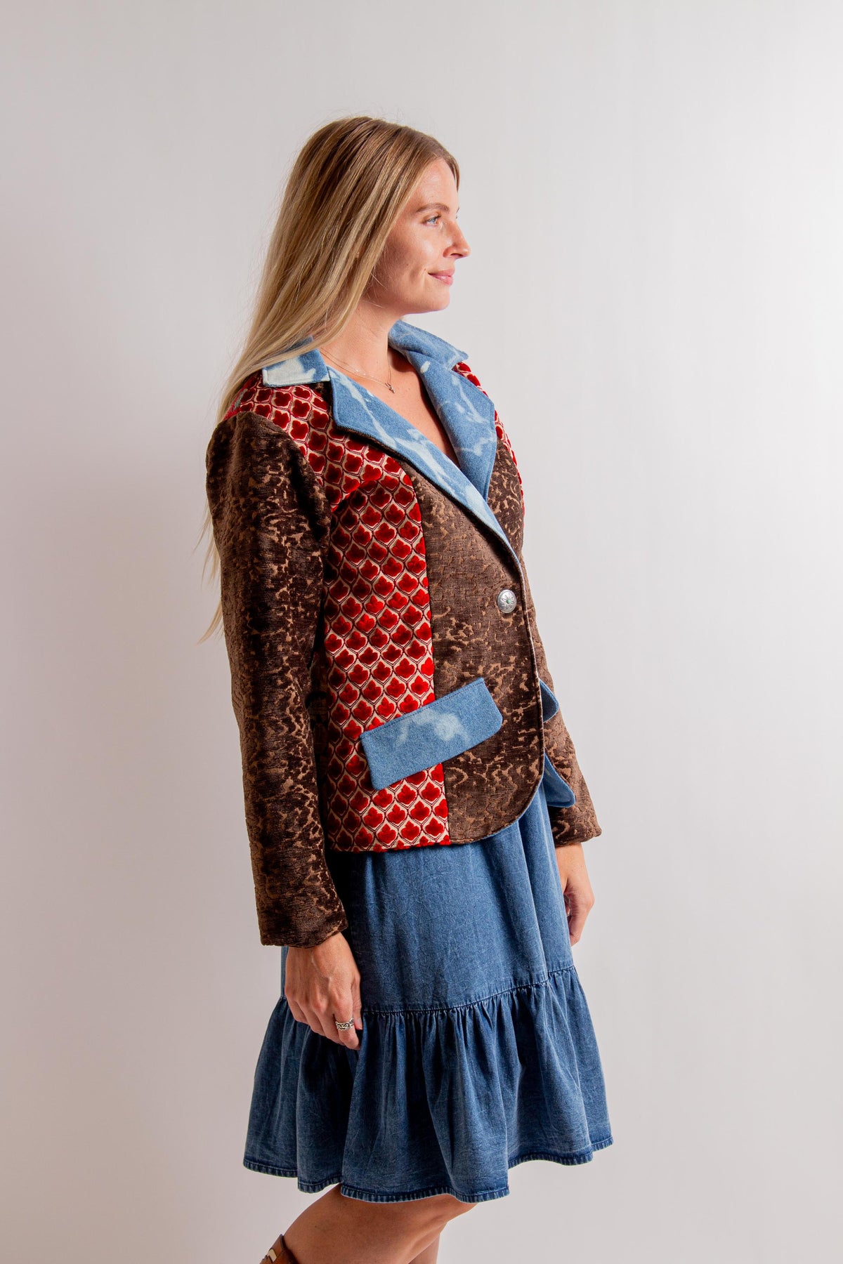 "Carye" Indian Outlaw Brown, Blue & Red Jacket with Print at Back.