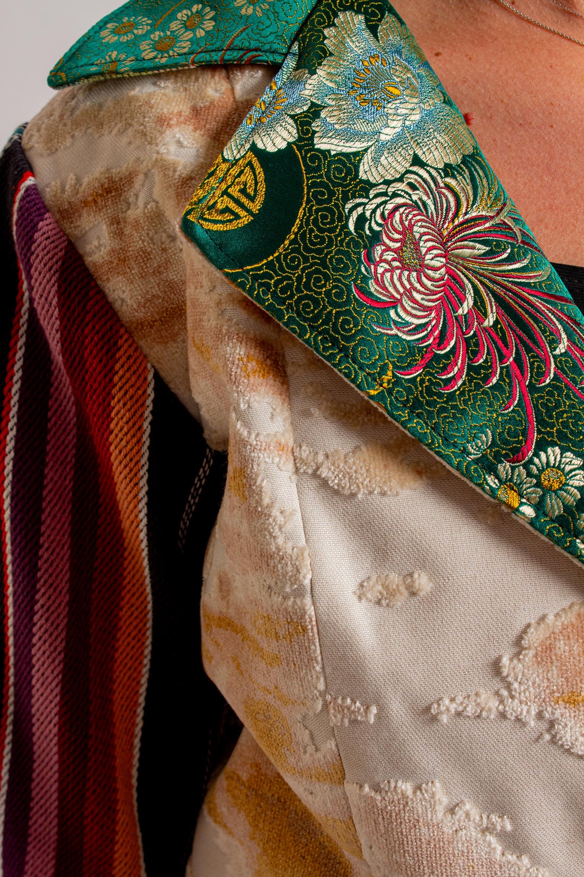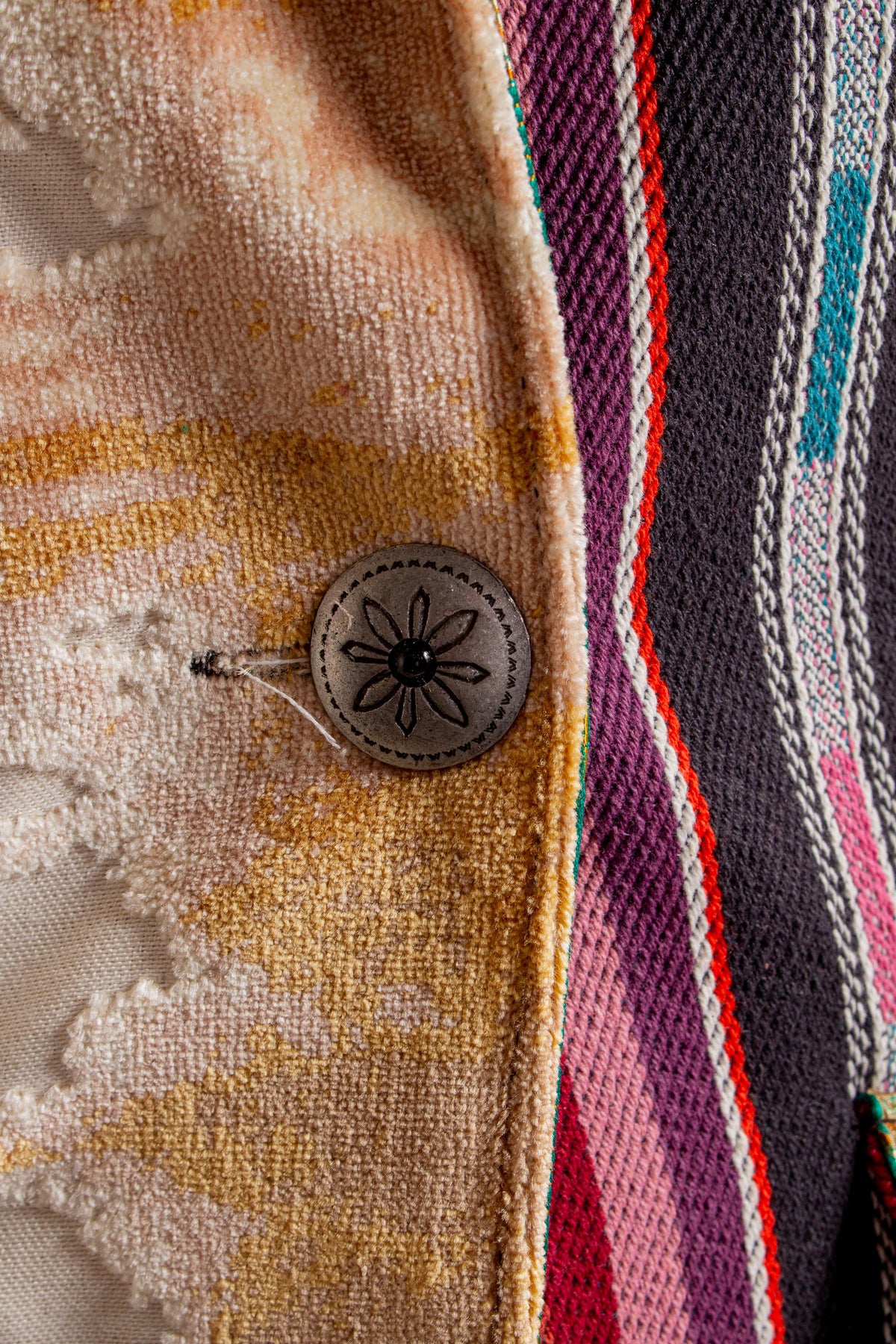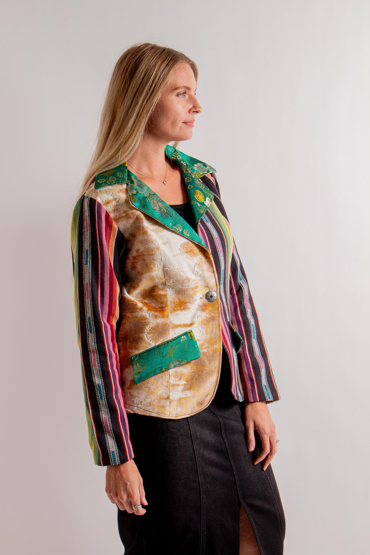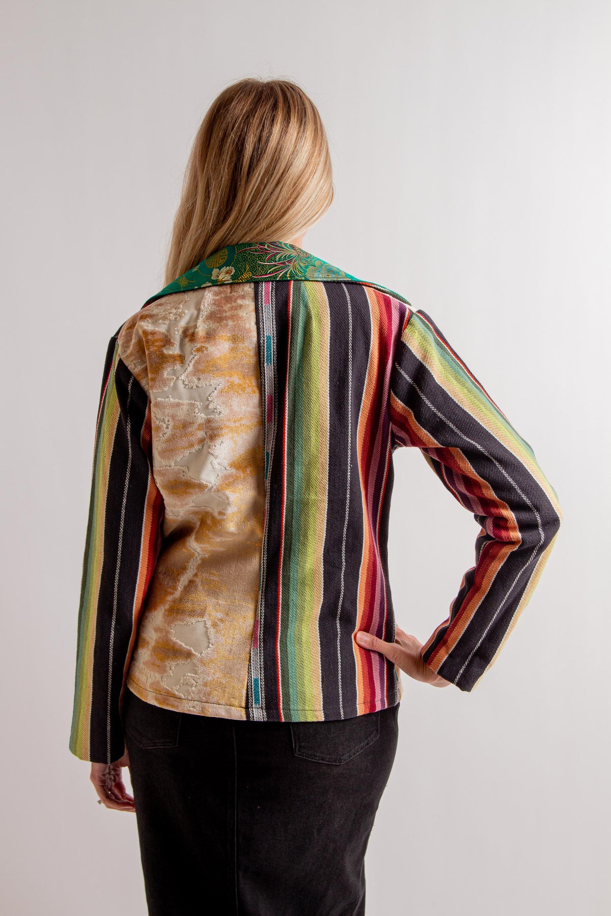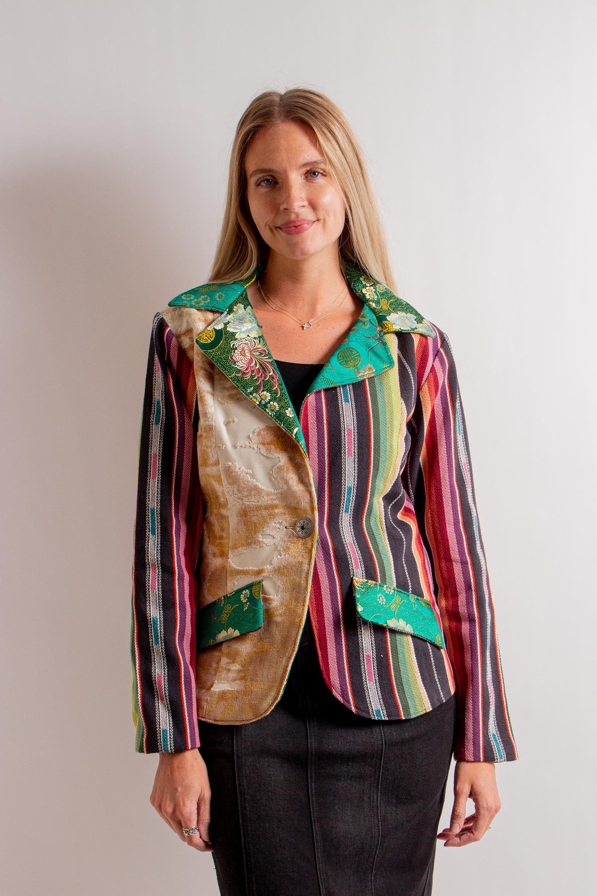 "Carye" Rose Garden Abstract Print Striped Jacket with Front Button Closure.
