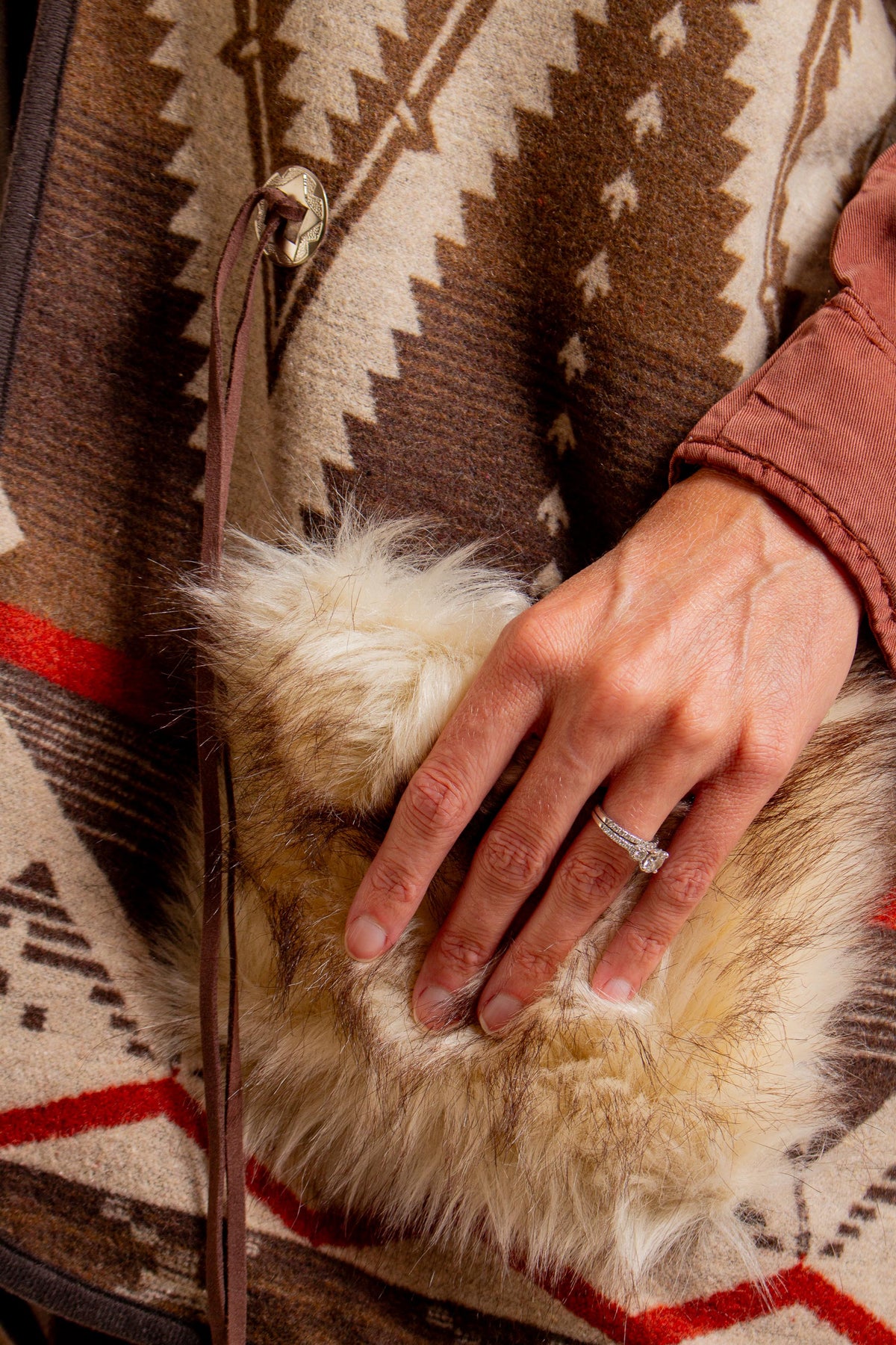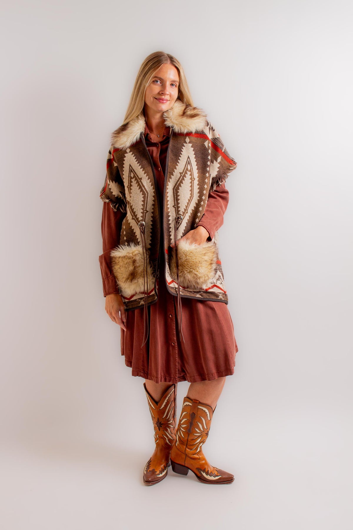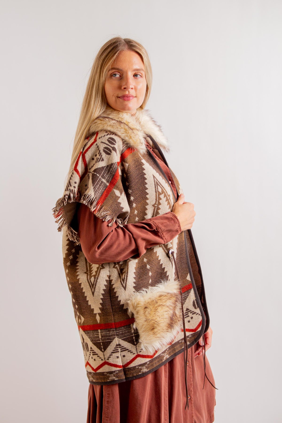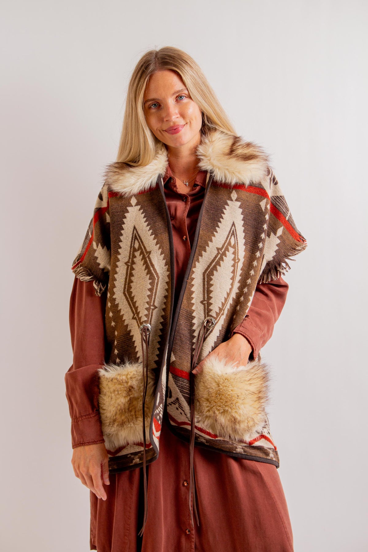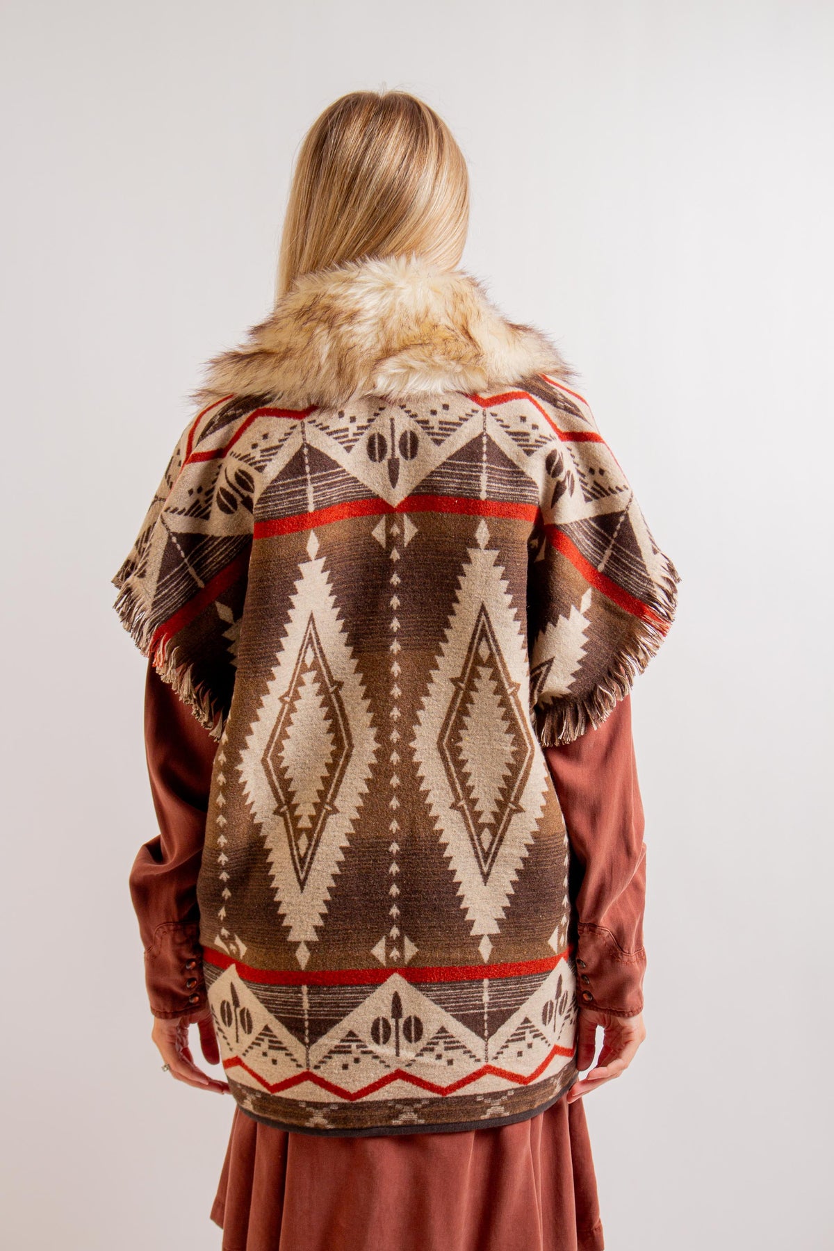 Brown Aztec Print Fur Blanket Jacket with Short Sleeves, Fur Accents at Collar and Front Pockets, Fringe Accents at Side and Front Tie Closure.