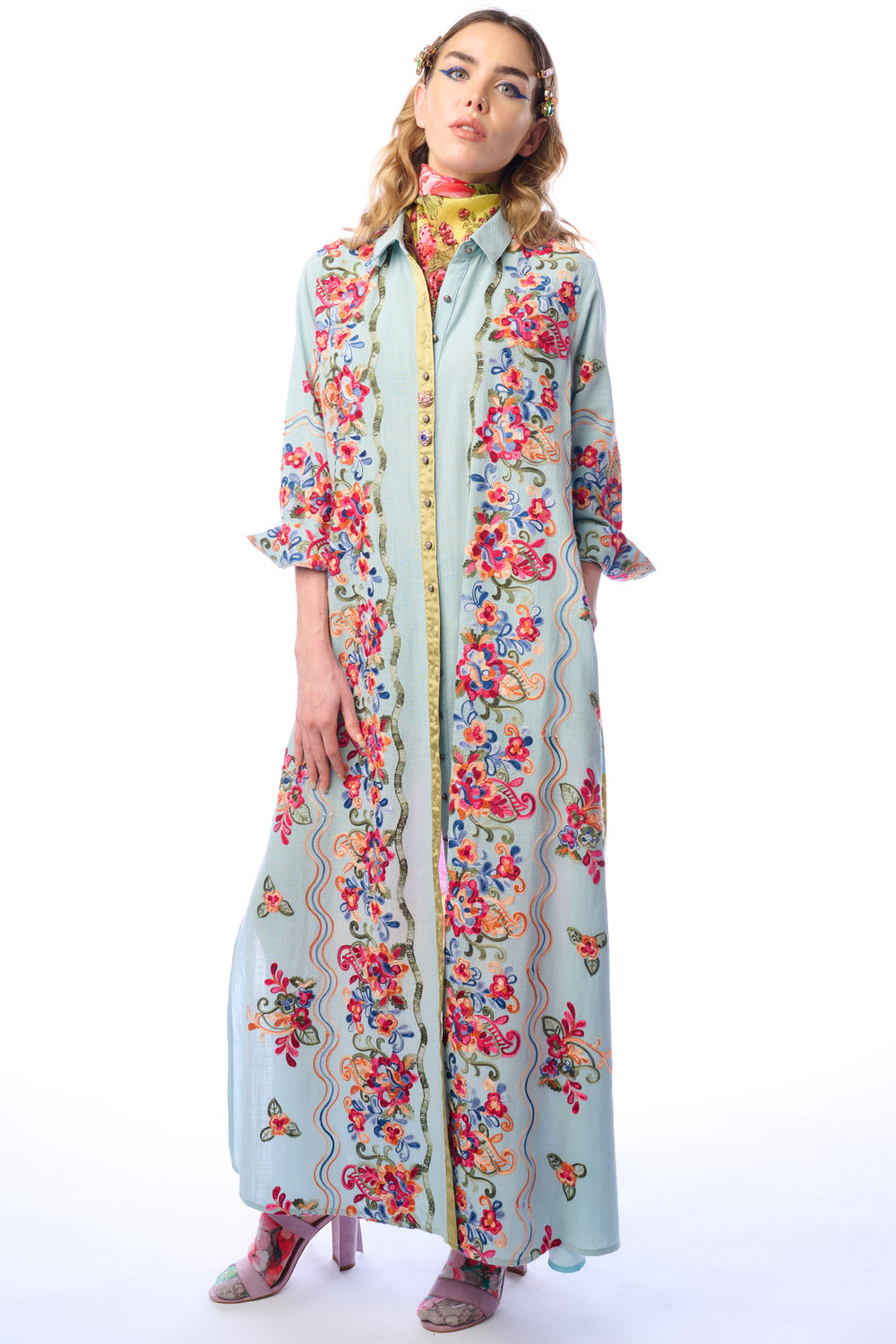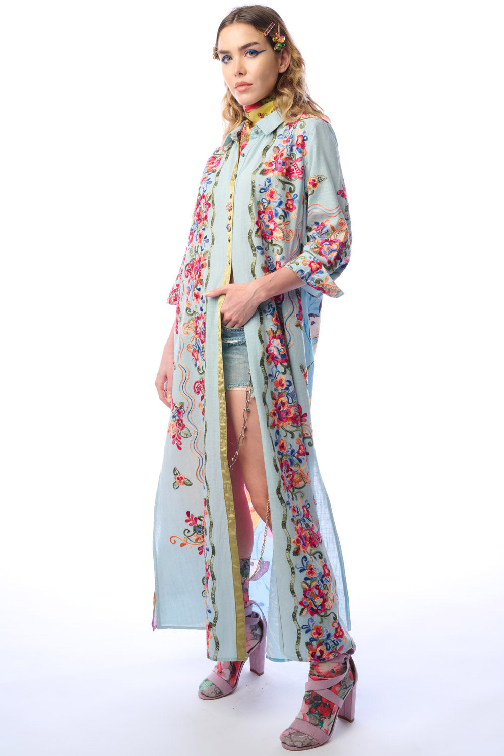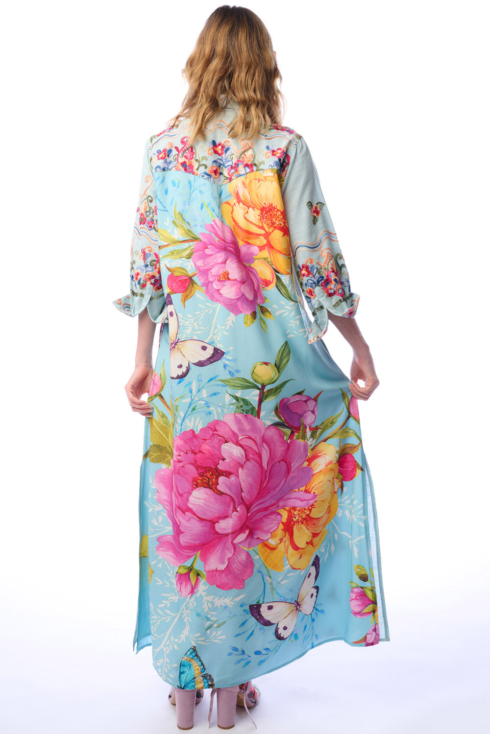 Embroidered button-up duster with butterfly floral print on the back, 2 side pockets, 2 crystal buttons attached to CF placket, side slits
