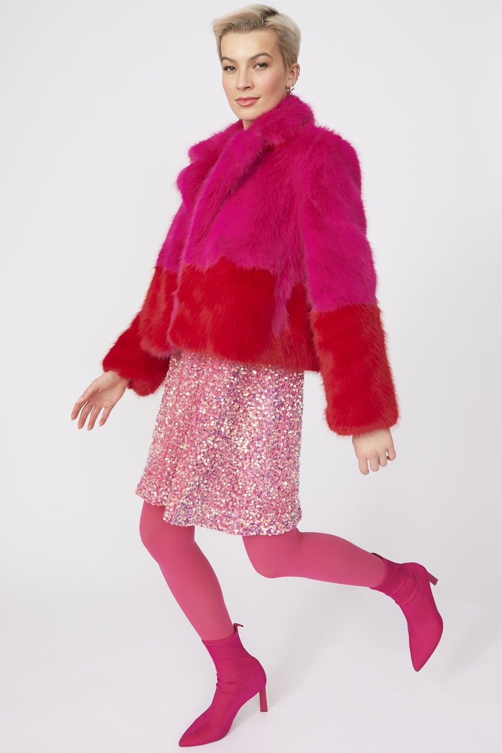 Pink Short Faux Fur Jacket with Contrasting Red Hem. Fabric: 15% Acrylic, 29% Bamboo, 56% Modacrylic. Lining: 100% Viscose