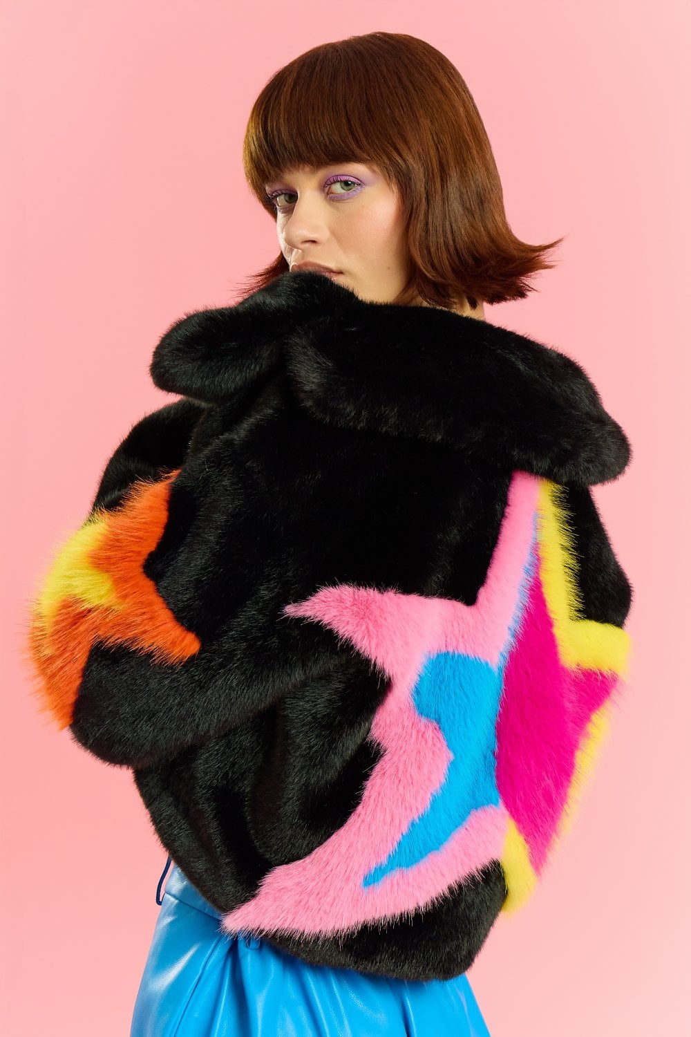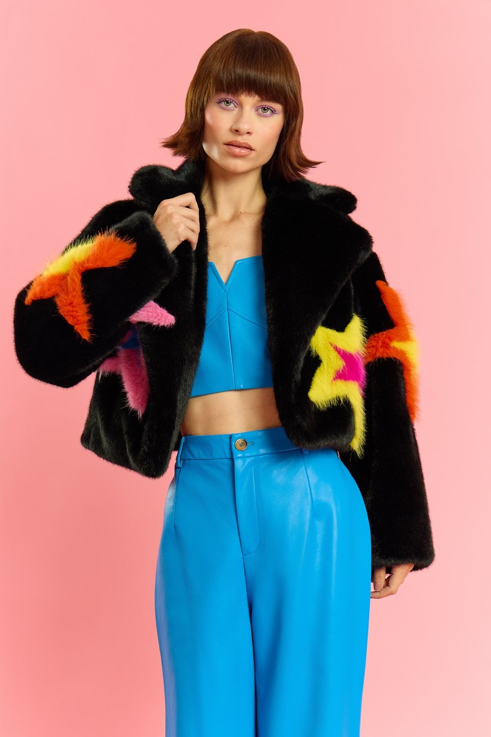 Handmade Black Multicolor Star Bamboo Faux Fur Jacket. Fabric: 15% Tencel, 29% Bamboo, 56% Modacrylic. Lining: 100% Viscose