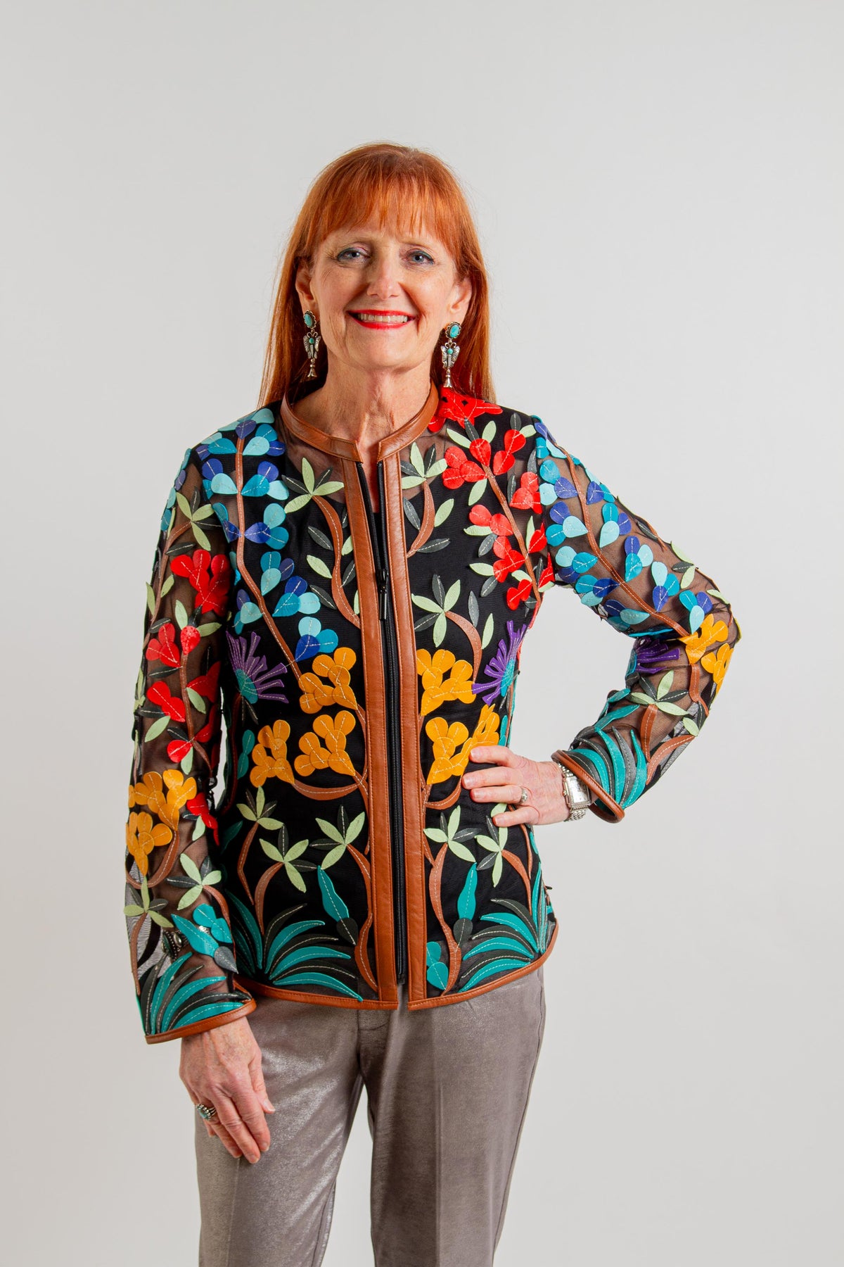 Short Multi Floral Leather Jacket with Brown Lining and Front Zip Closure.