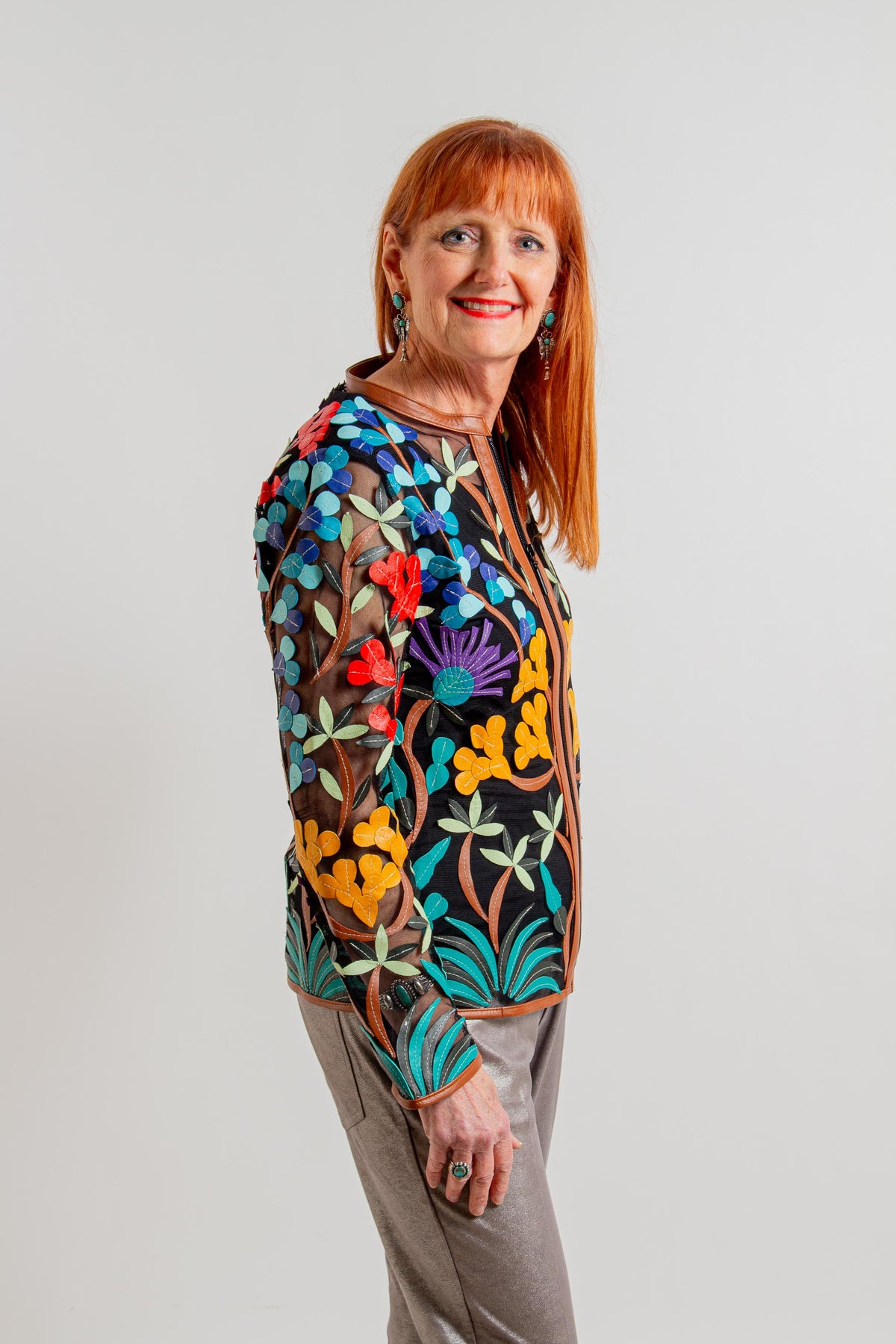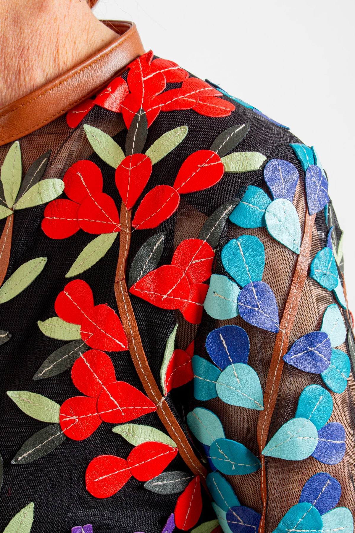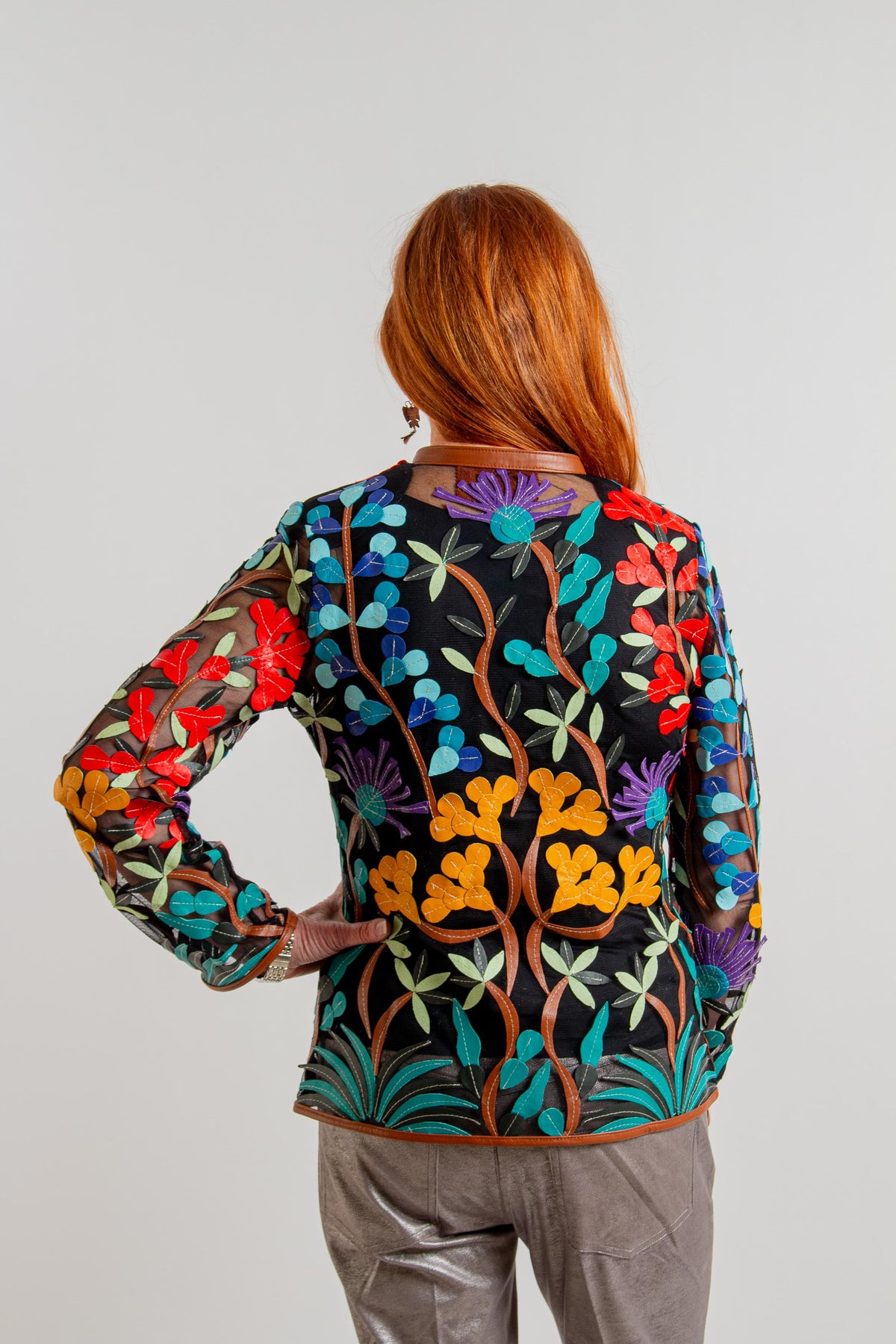 Short Multi Floral Brown Leather Jacket
