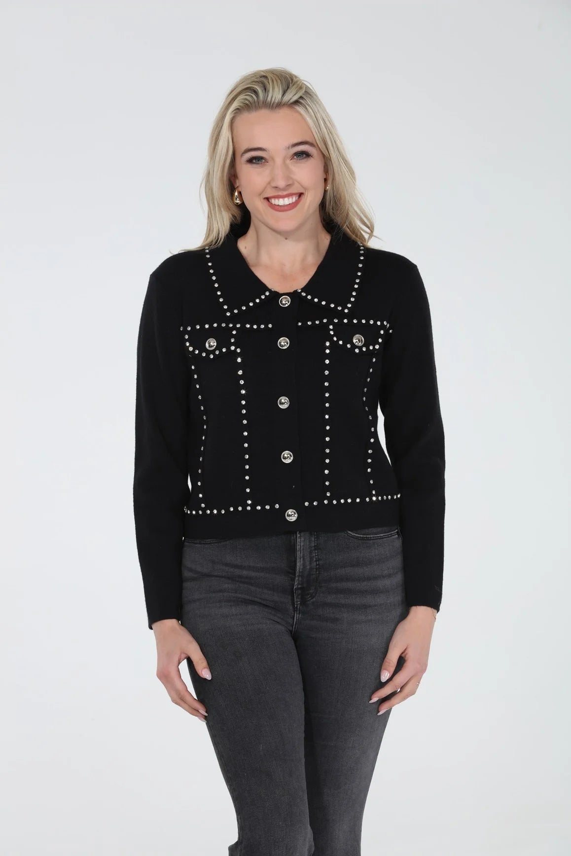 The Clover Jacket: This chic jacket features diamond embellishments, functional pockets, and a button-up collar for a stylish touch