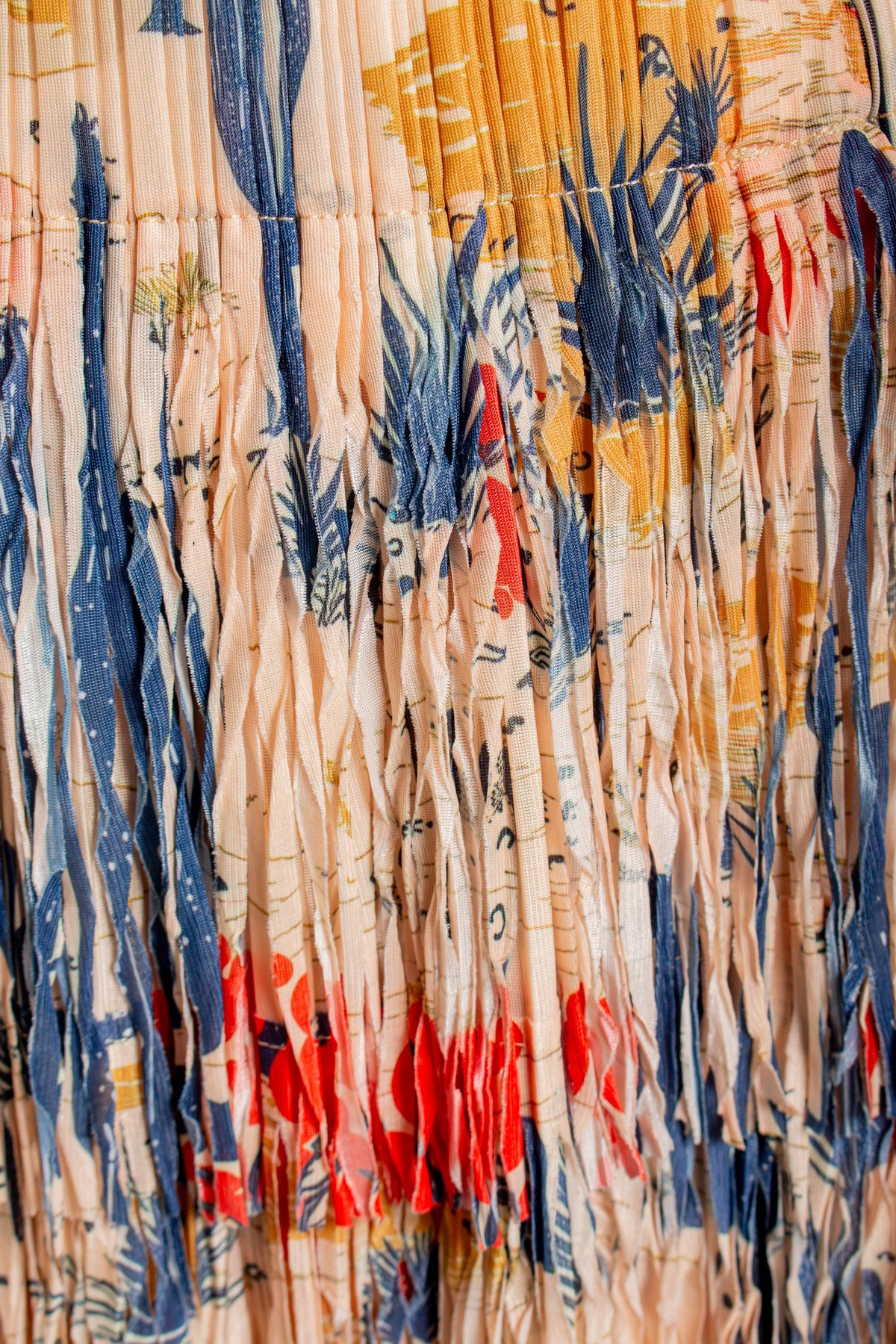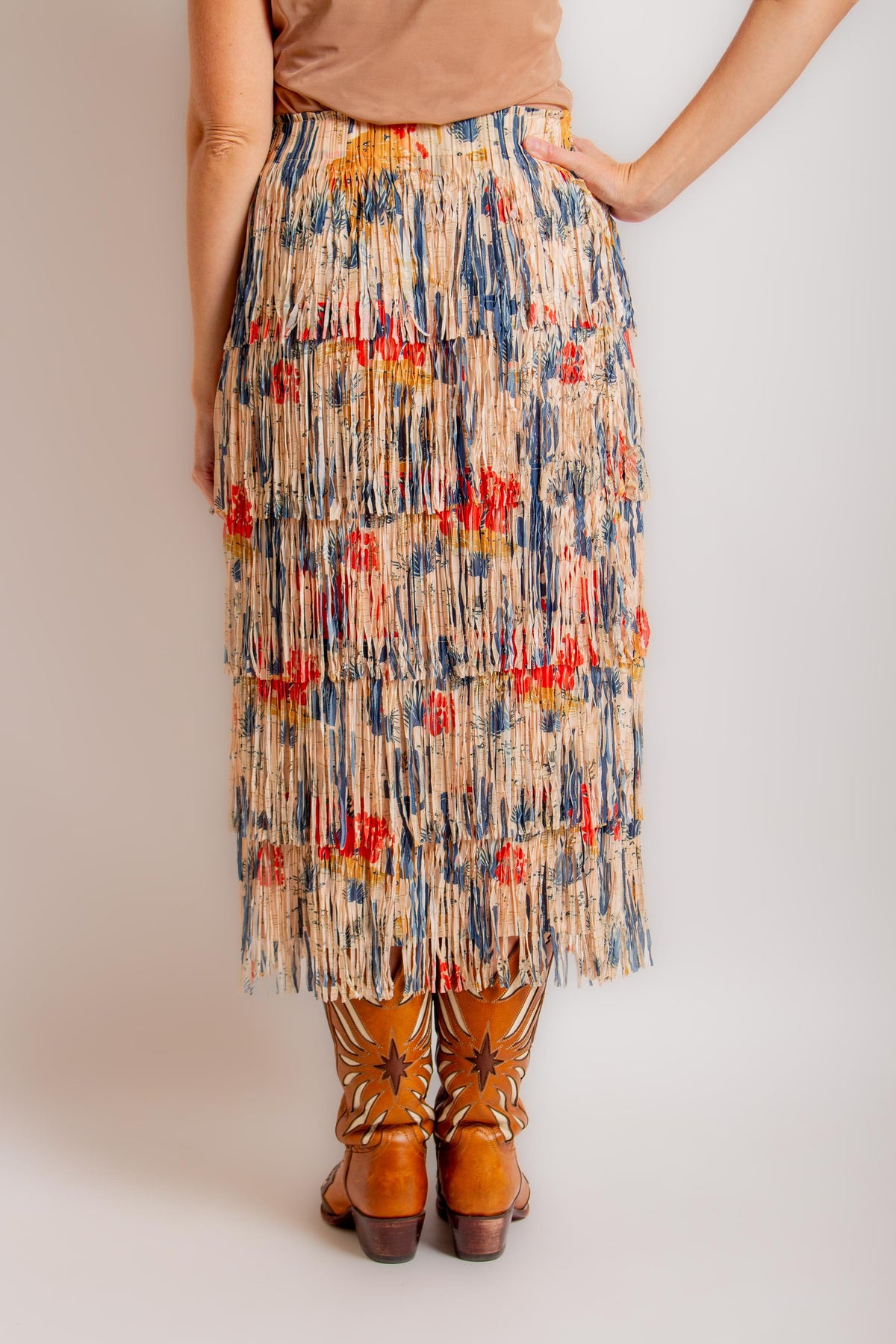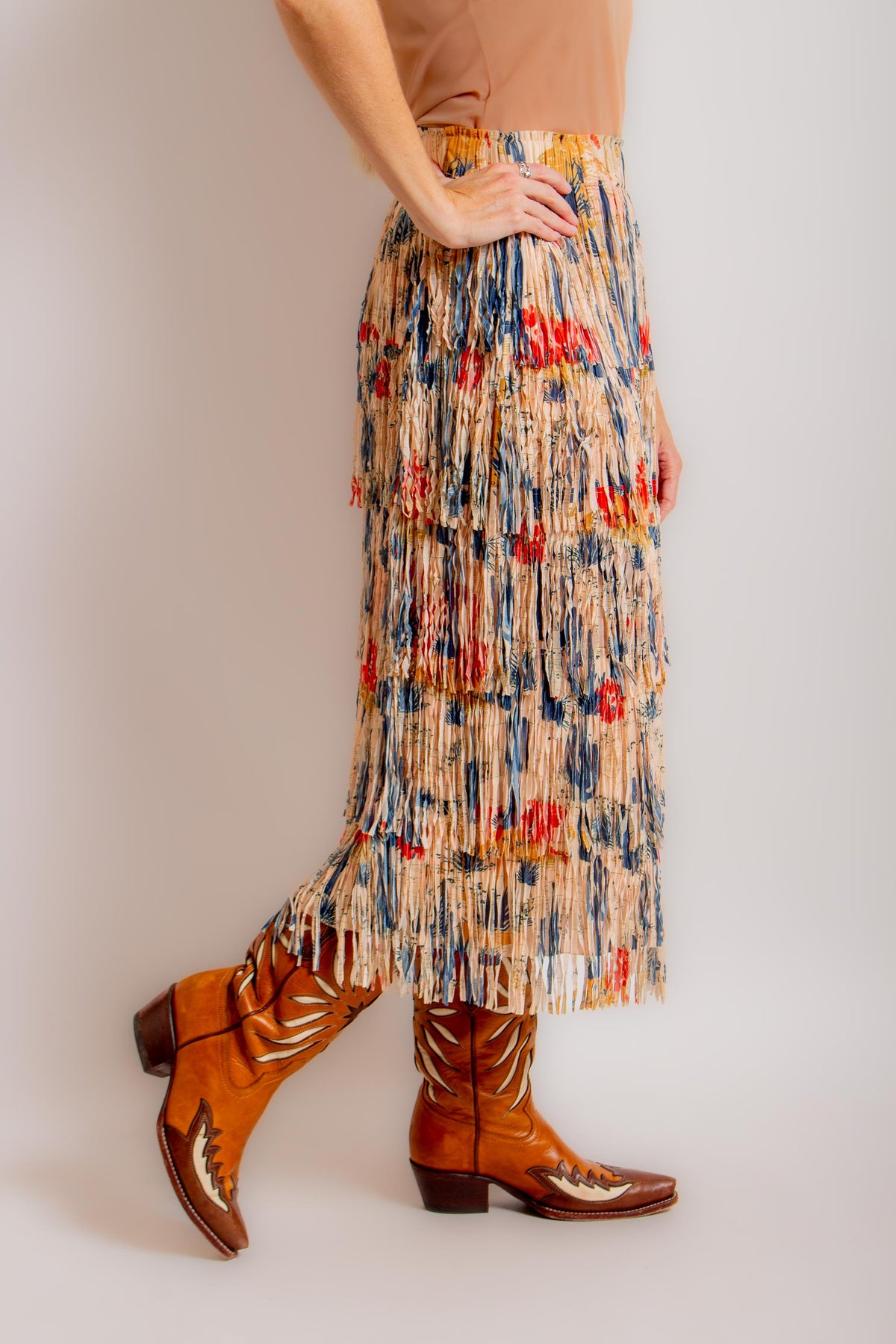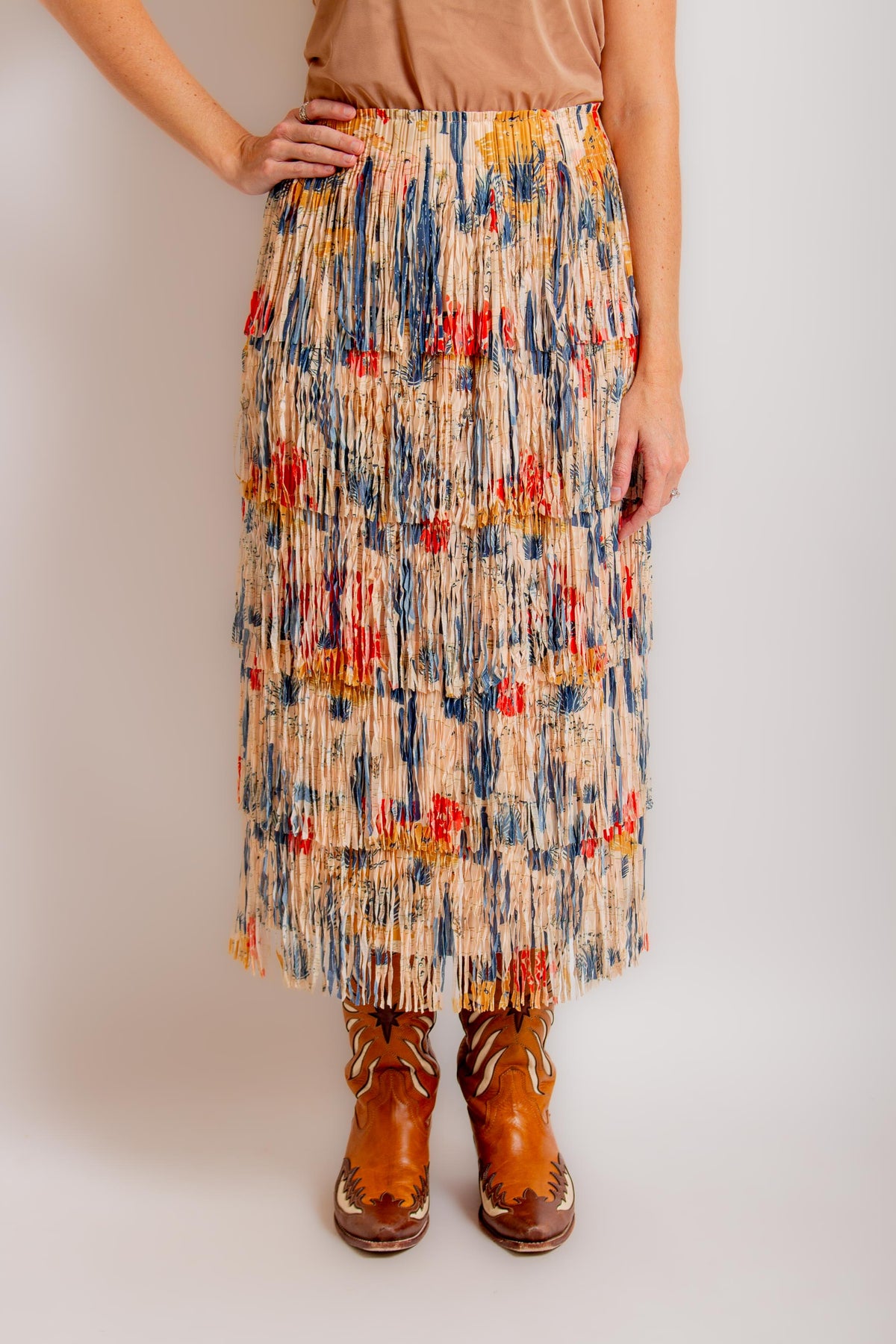 Printed Mesh Maxi Fringe Skirt with Elastic Waist. Fabric: 100% Polyester