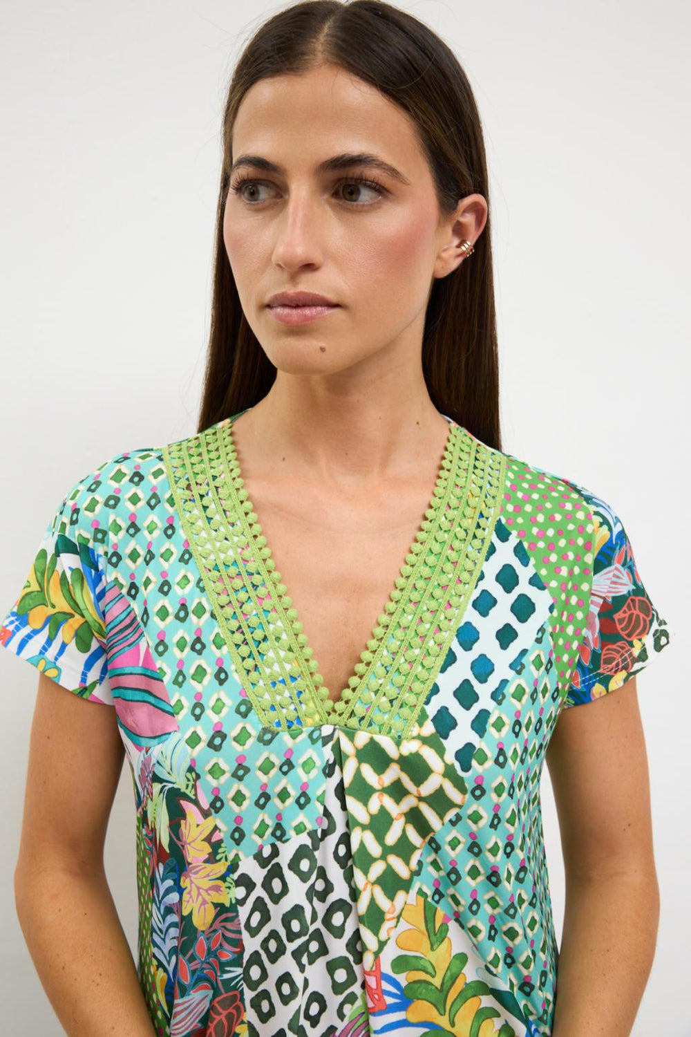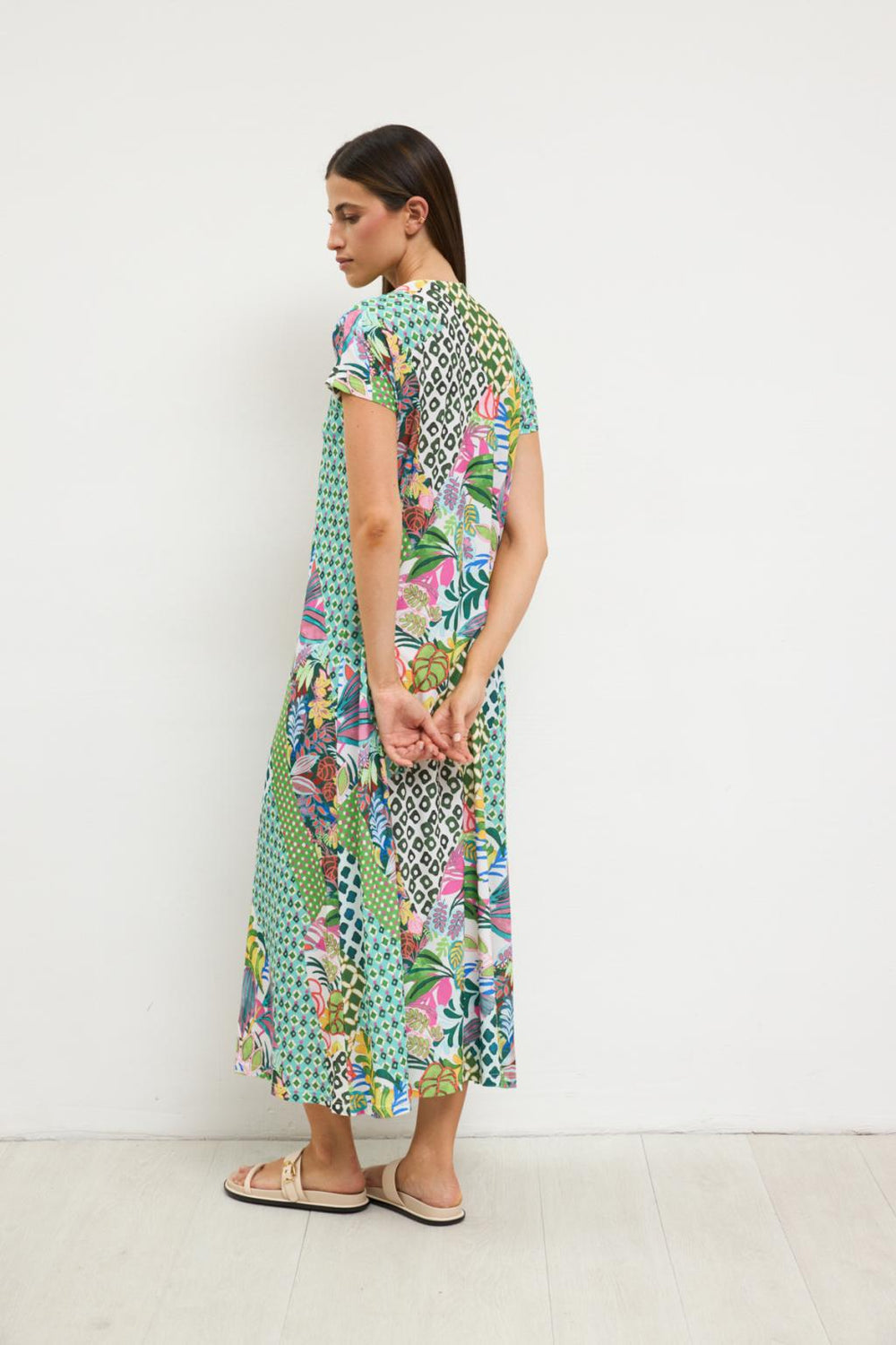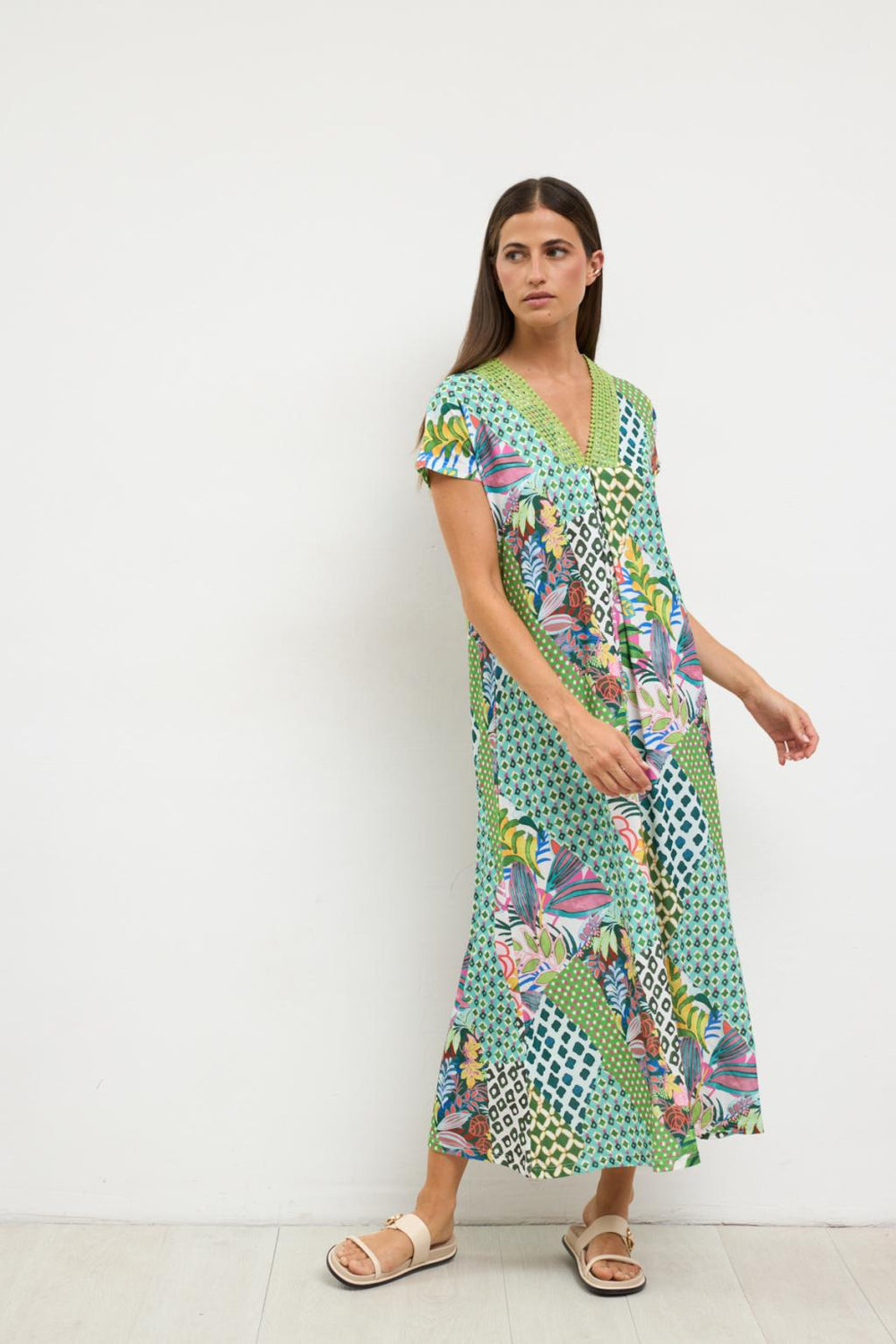 "Madeline" Lima Print Midi Dress with V-Neck and Short Sleeves. Fabric: 95% Polyester, 5% Elastane