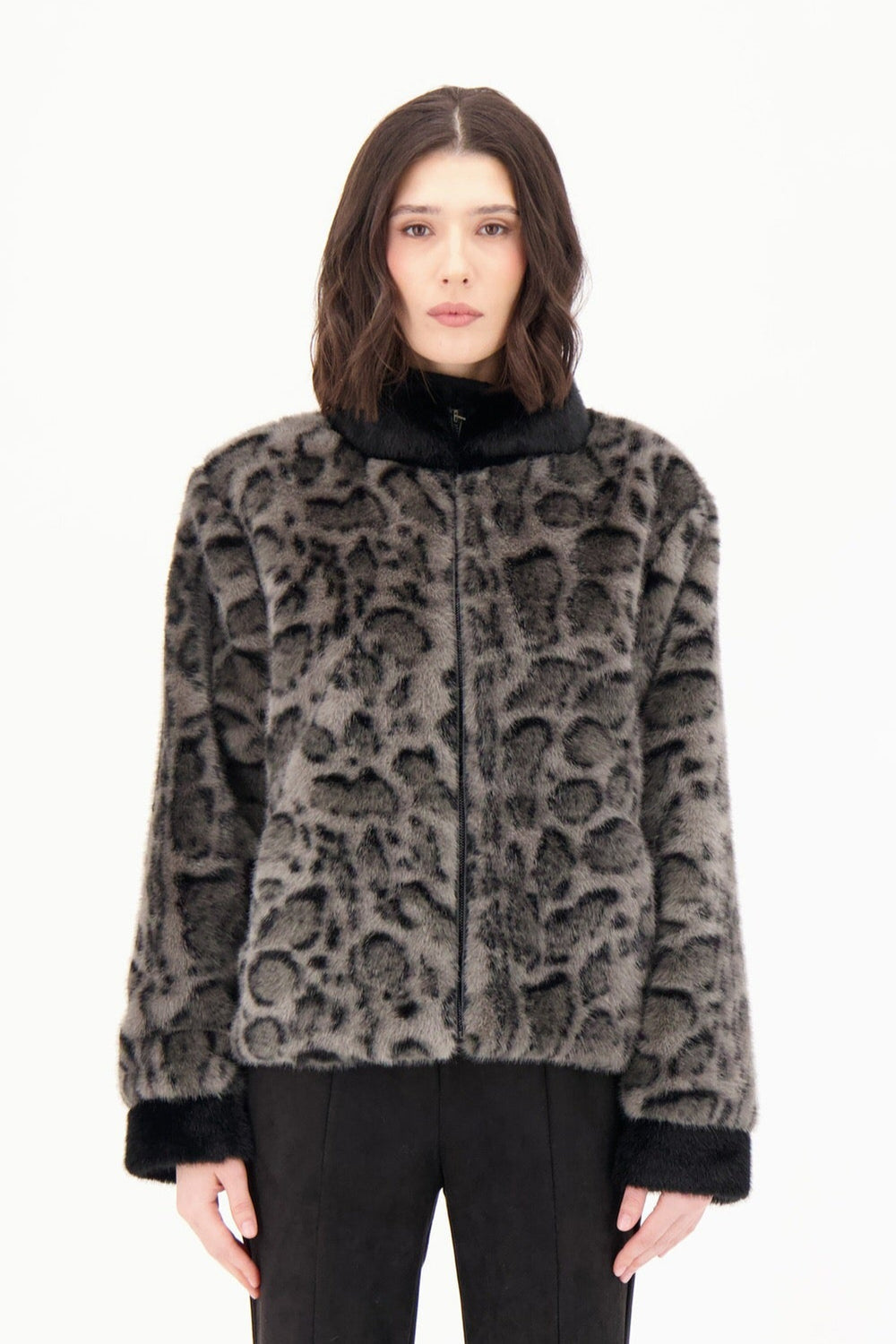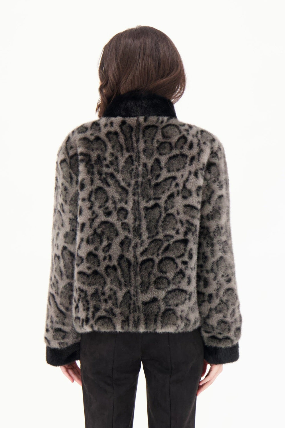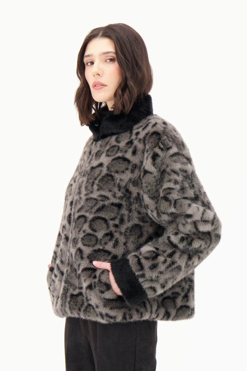 Leopard Print Faux Fur Bomber Jacket with Front Zip Closure. Fabric: 100% Polyester