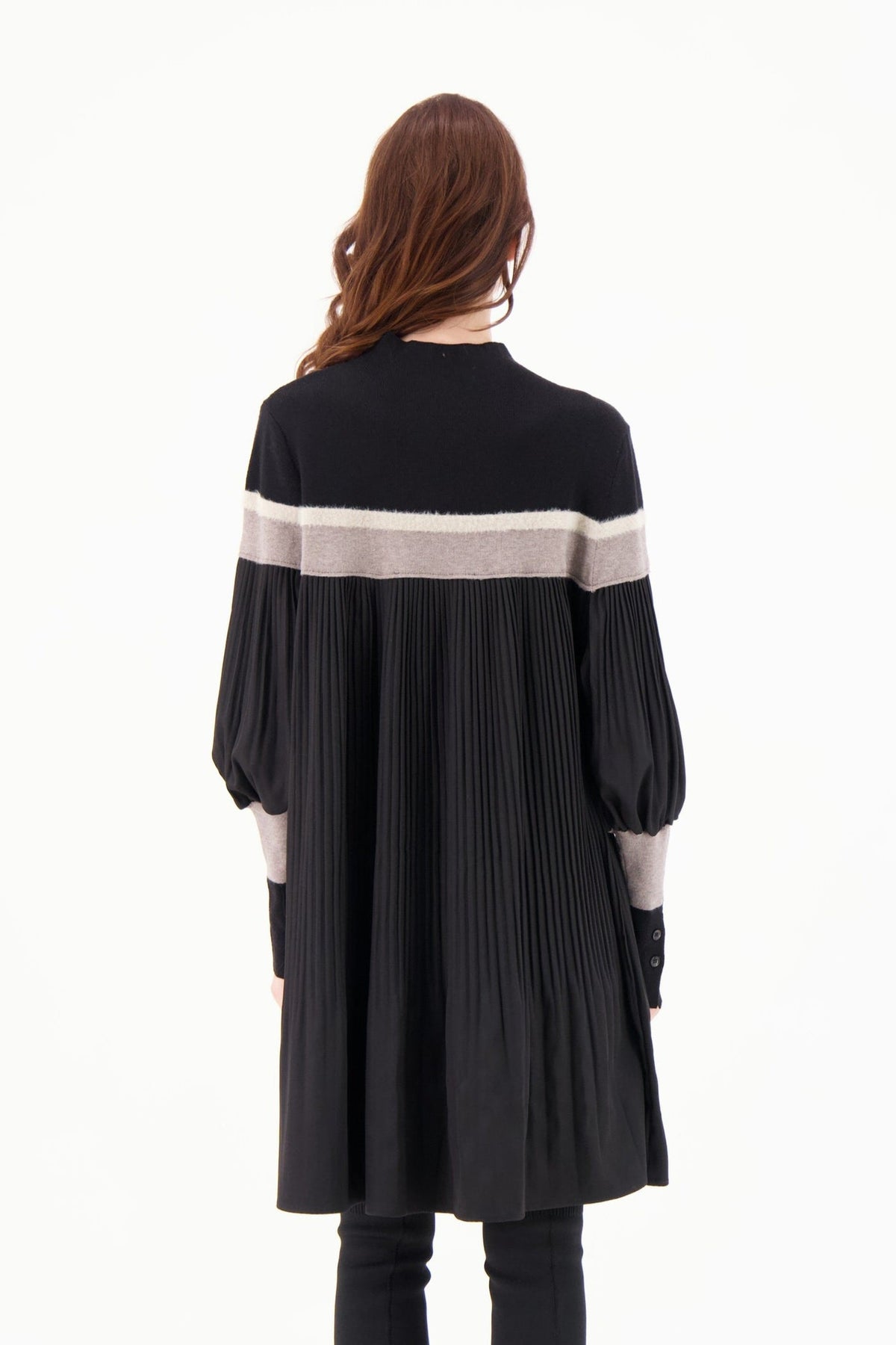 Black Striped Woven Pleated Buttoned Sleeve Tunic Dress with High Neck. Fabric: 28% Polyester, 22% Nylon, 50% Rayon
