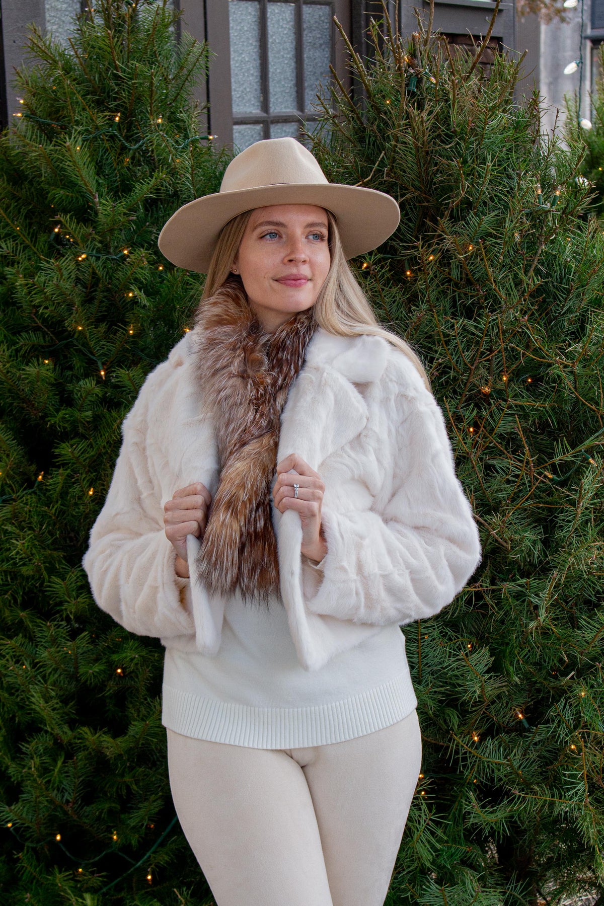 White Faux Fur Cropped Jacket. Fabric: 15% Acrylic, 85% Modacrylic