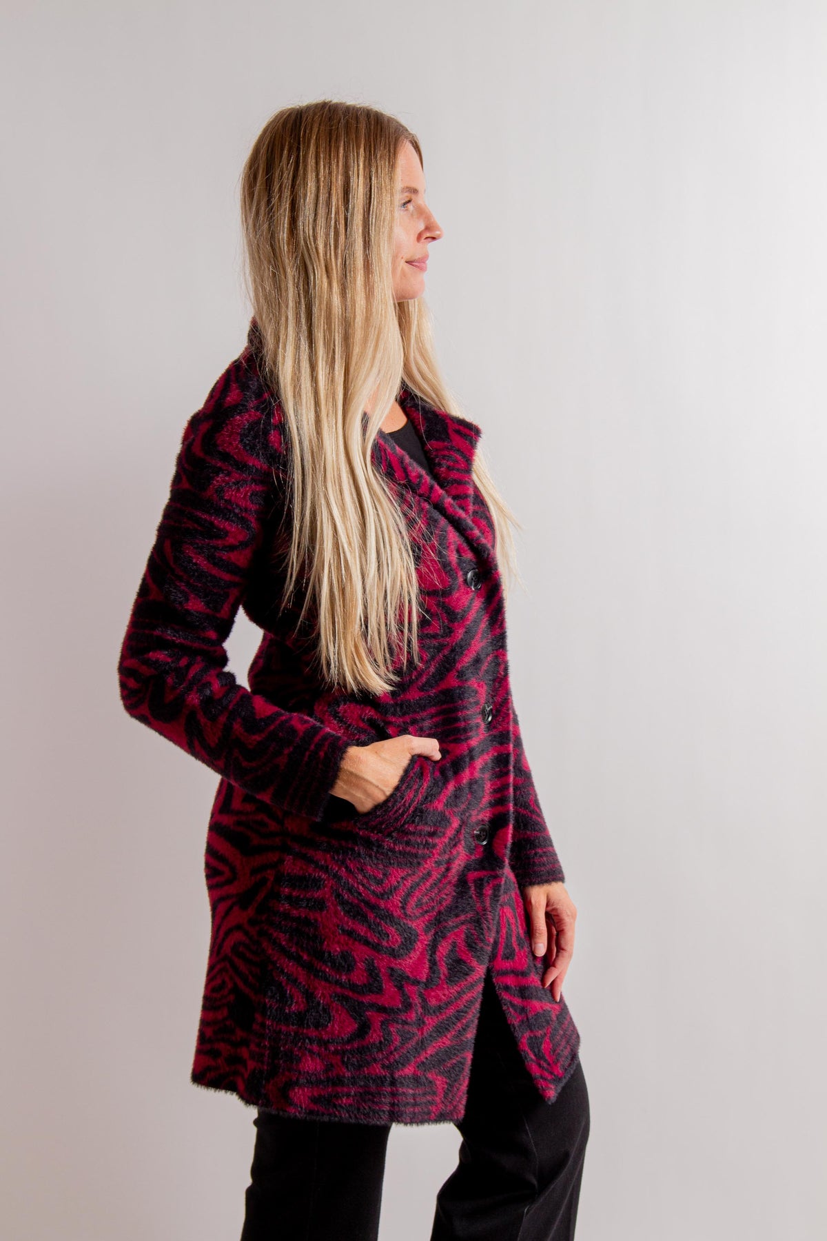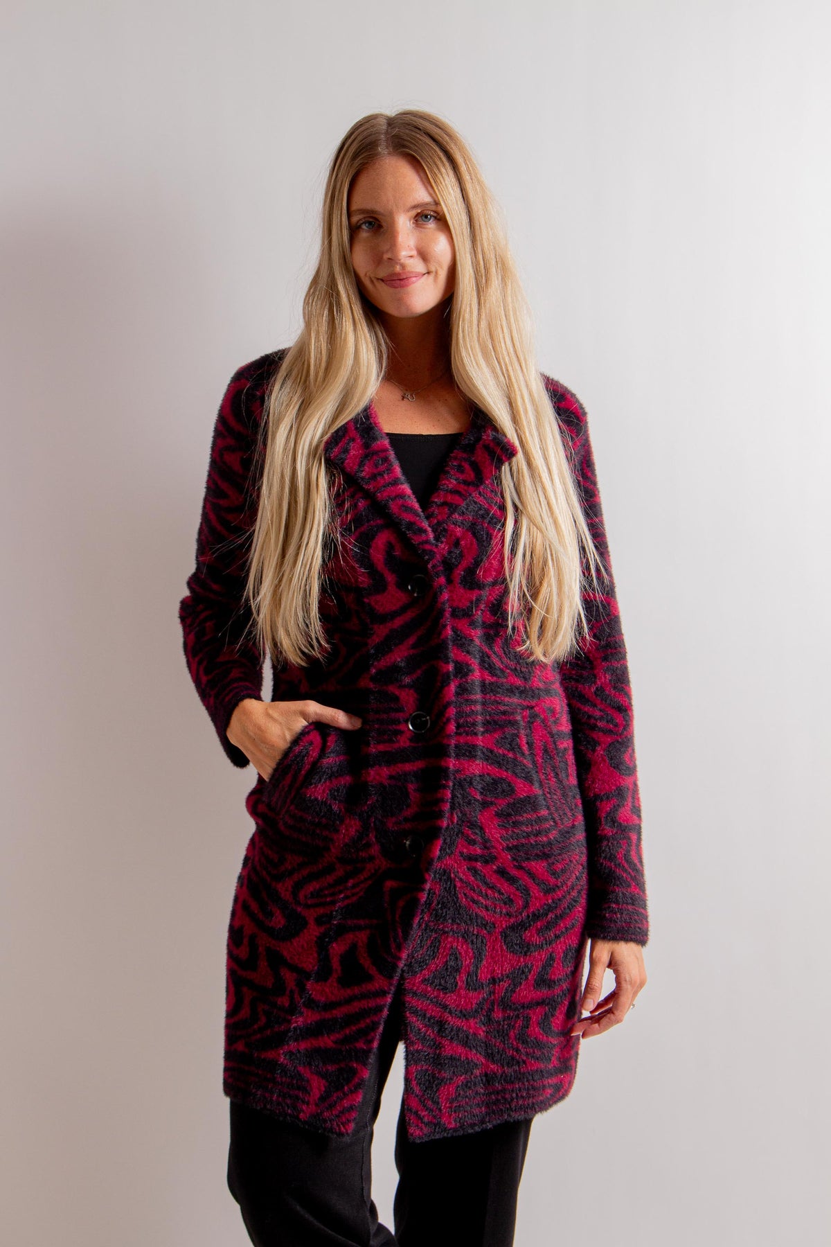Boysenberry/ Black Single Breasted Plush Abstract Cozy Coat