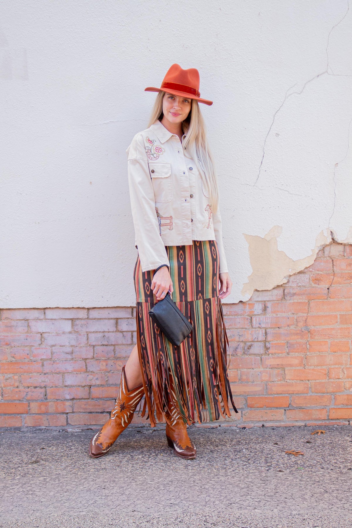 Crafted from sturdy, comfortable 100% cotton stretch canvas, this utility-style shirt jacket features intricate allover embroidery inspired by classic western iconography. It has dropped shoulders, a straight back yoke, and two large angled patch pockets with flaps.