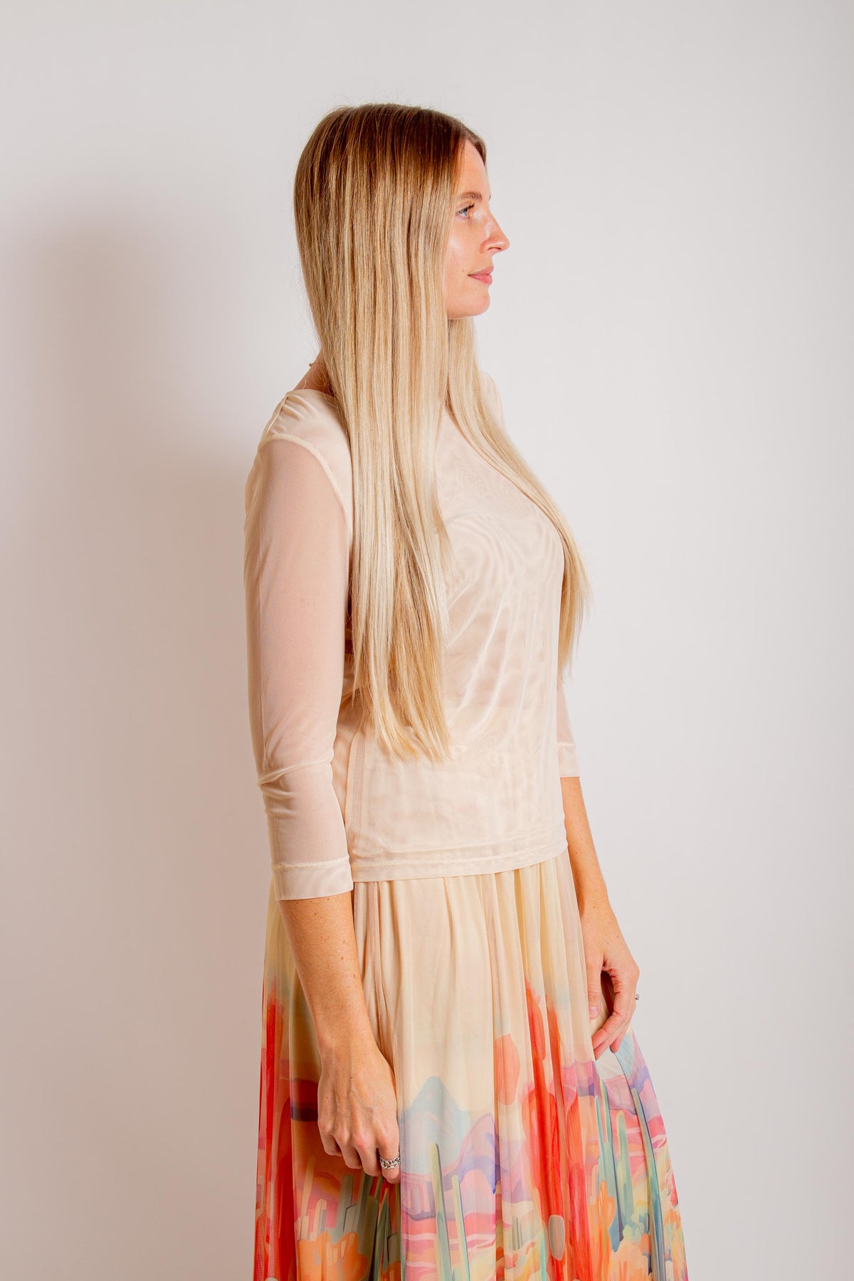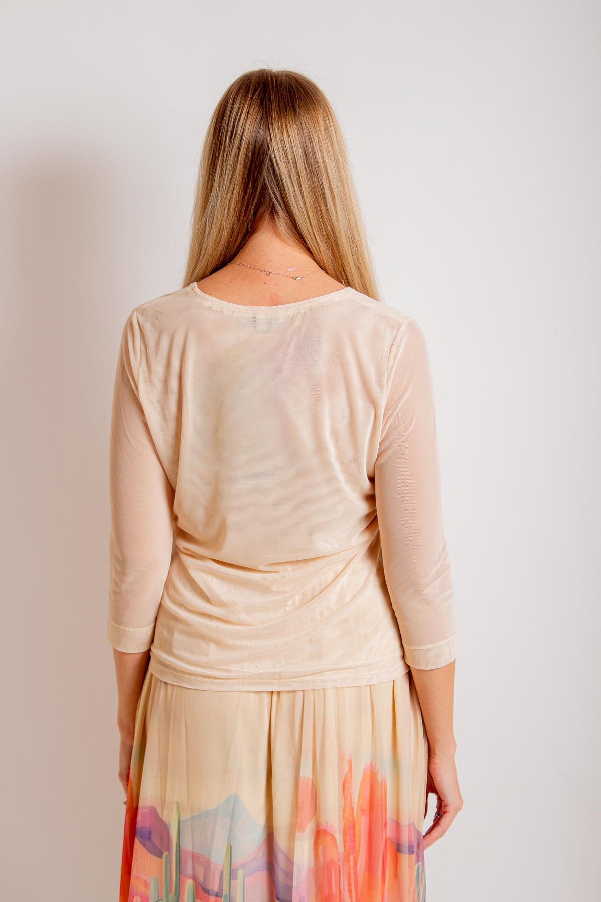 Bone Mesh 3/4 Sleeve Top with Scoop Neck. Fabric: 96% Polyester, 4% Spandex
