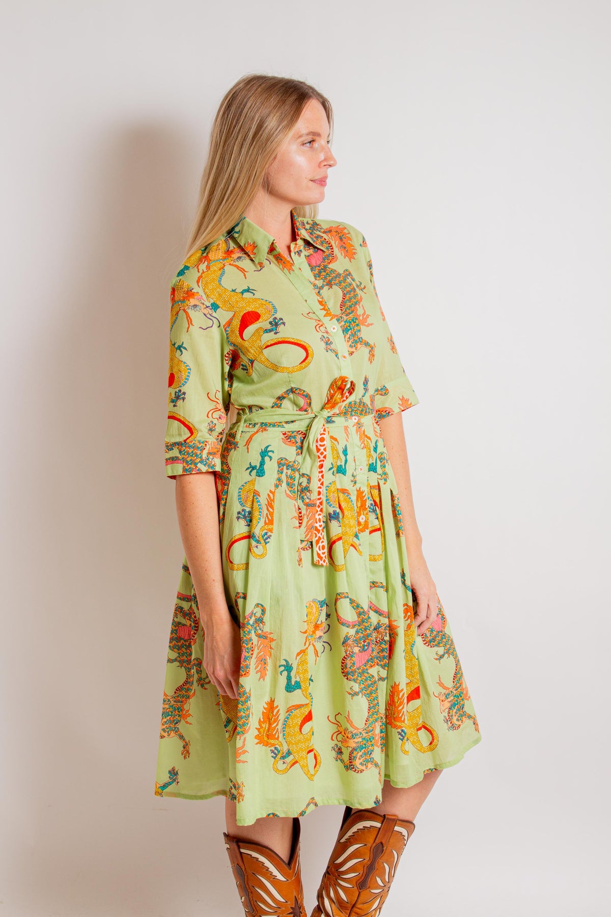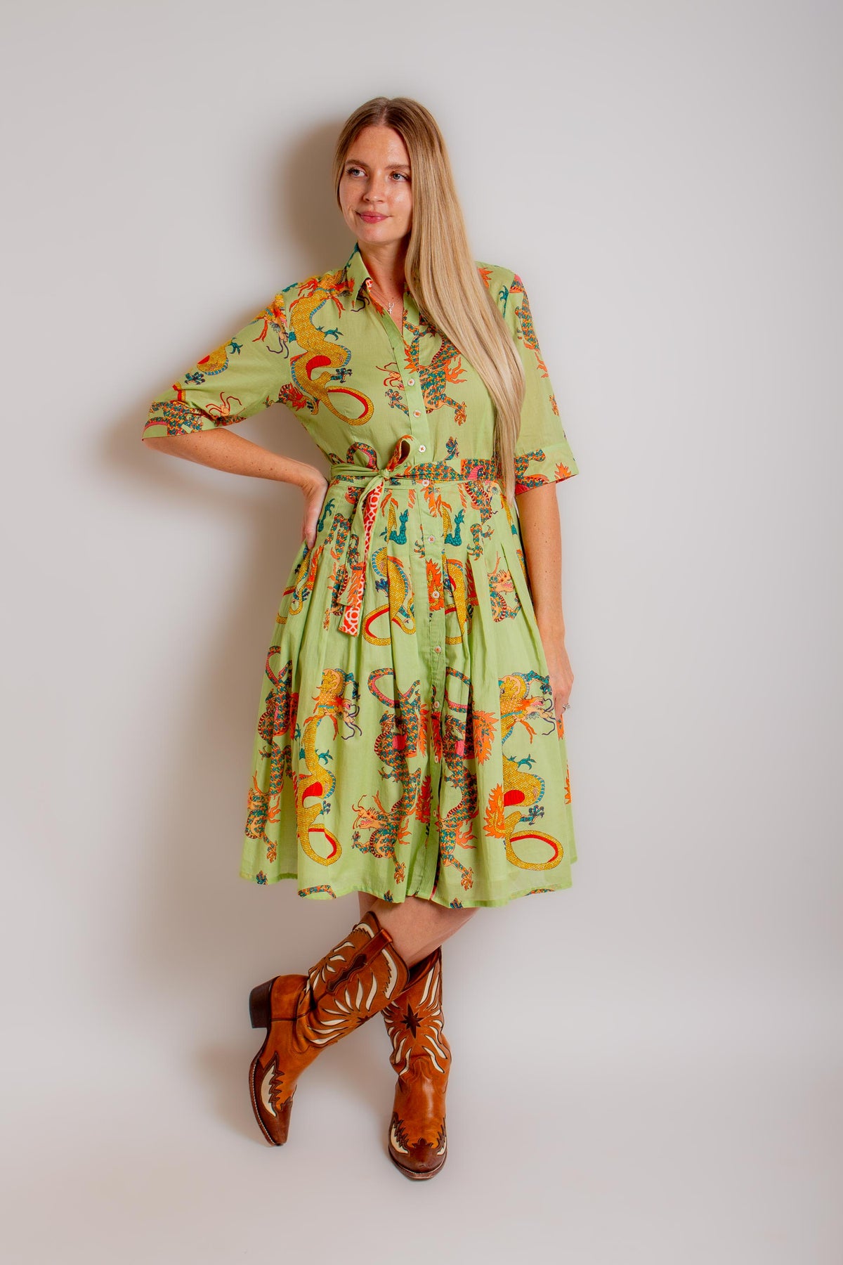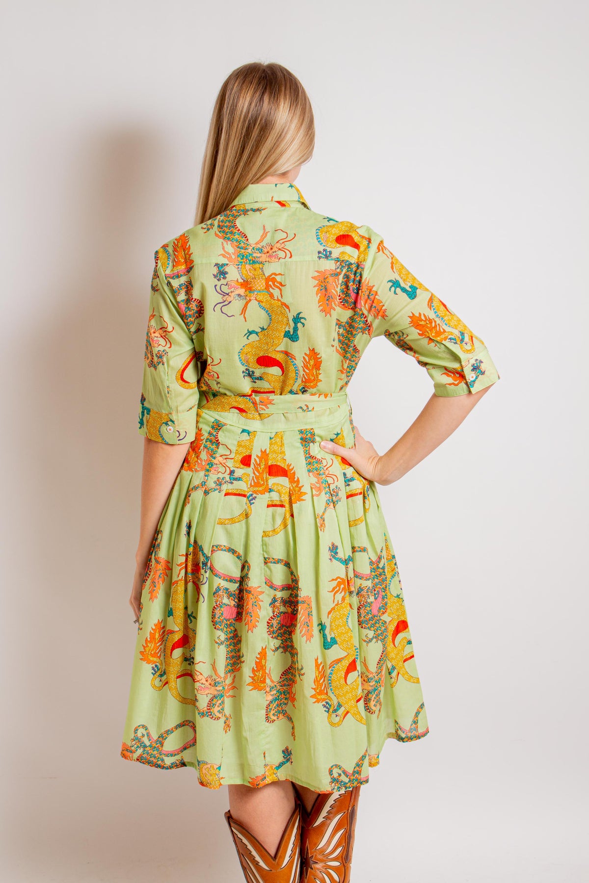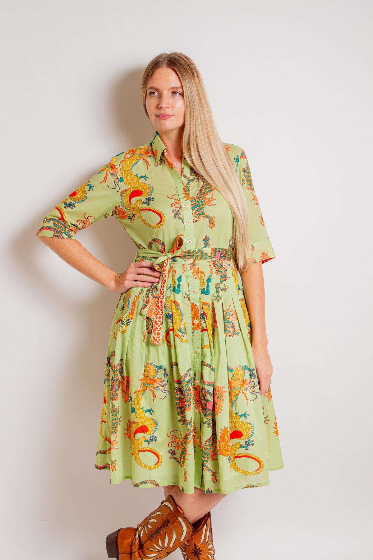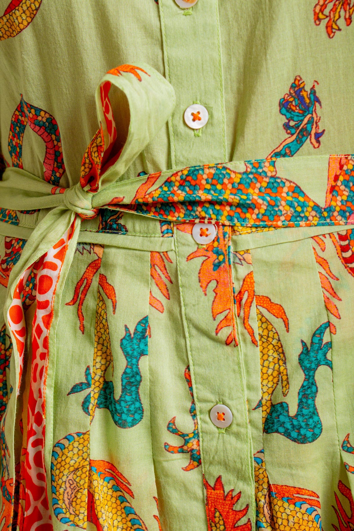Mrs. Maisel Green Dragon Dress with Front Button and Tie at Waist, Collar and 3/4 Sleeves. Fabric: 100% Cotton