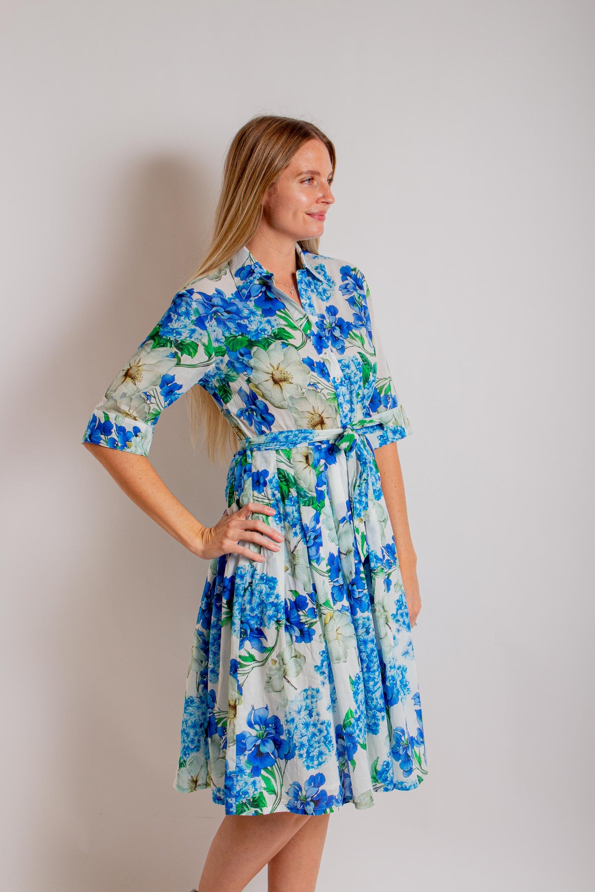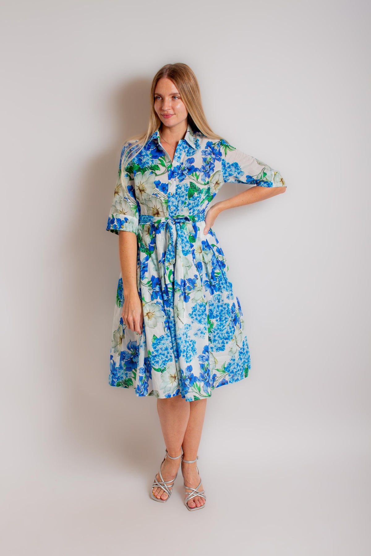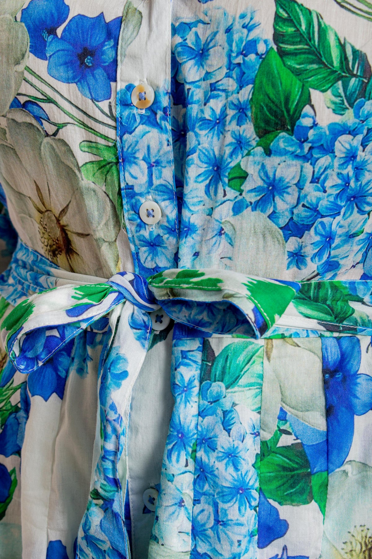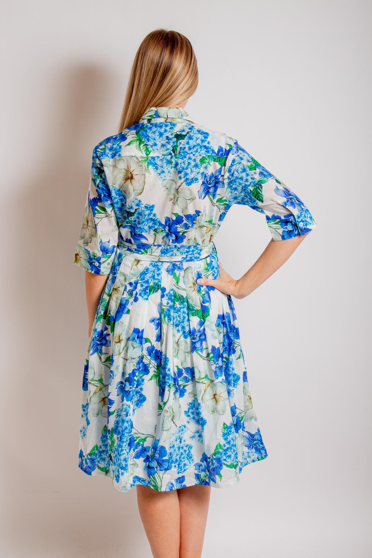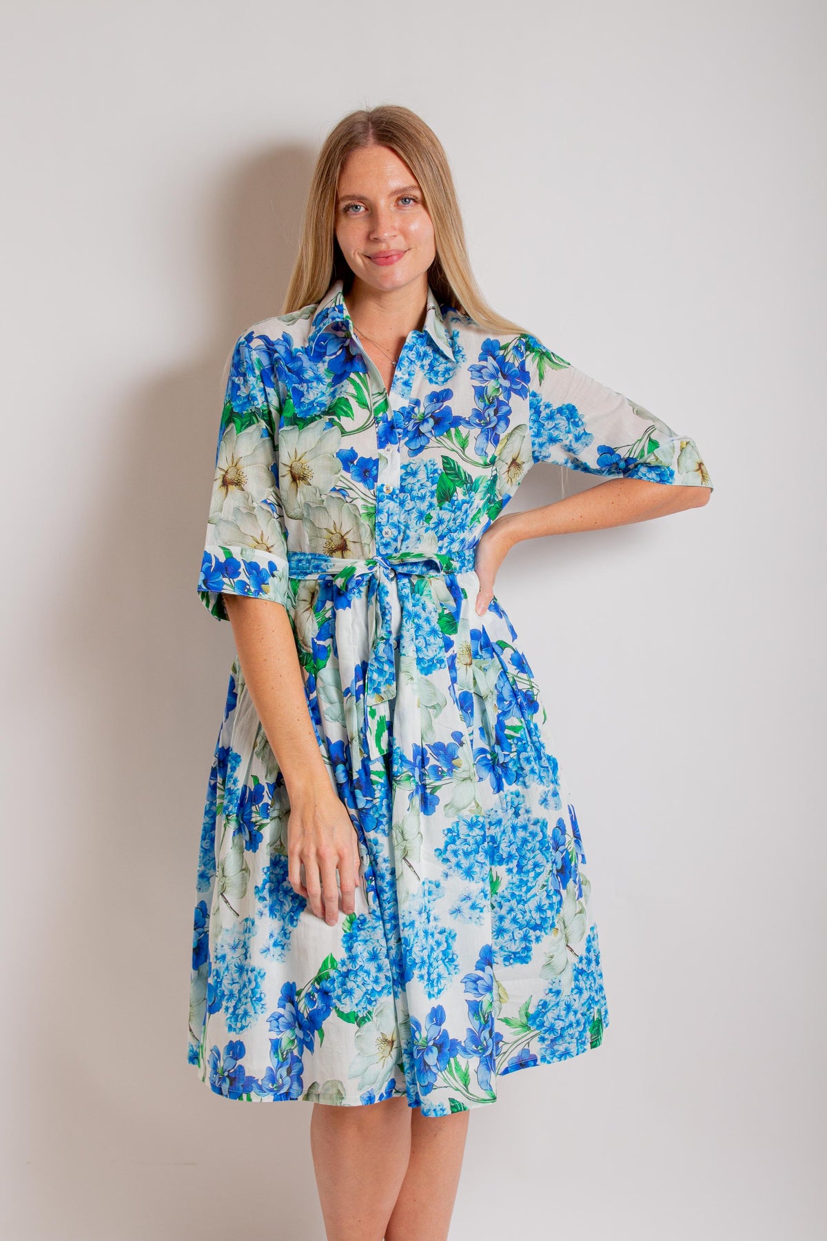 Mrs. Maisel Blue and White Floral Midi Dress with 3/4 Sleeves, Front Button Closure, Collar and Tie at Waist. Fabric: 100% Cotton