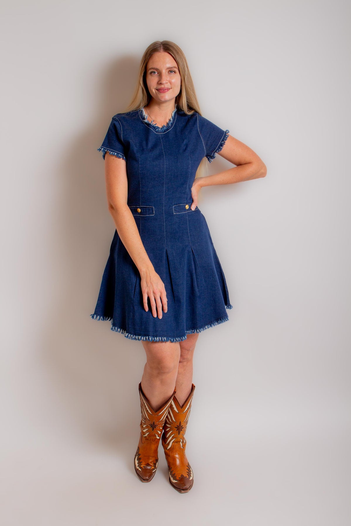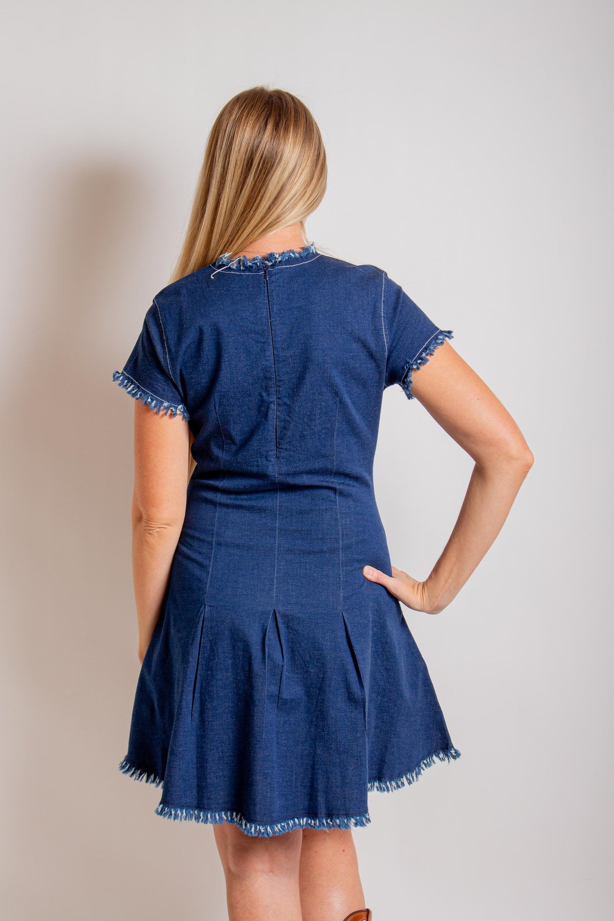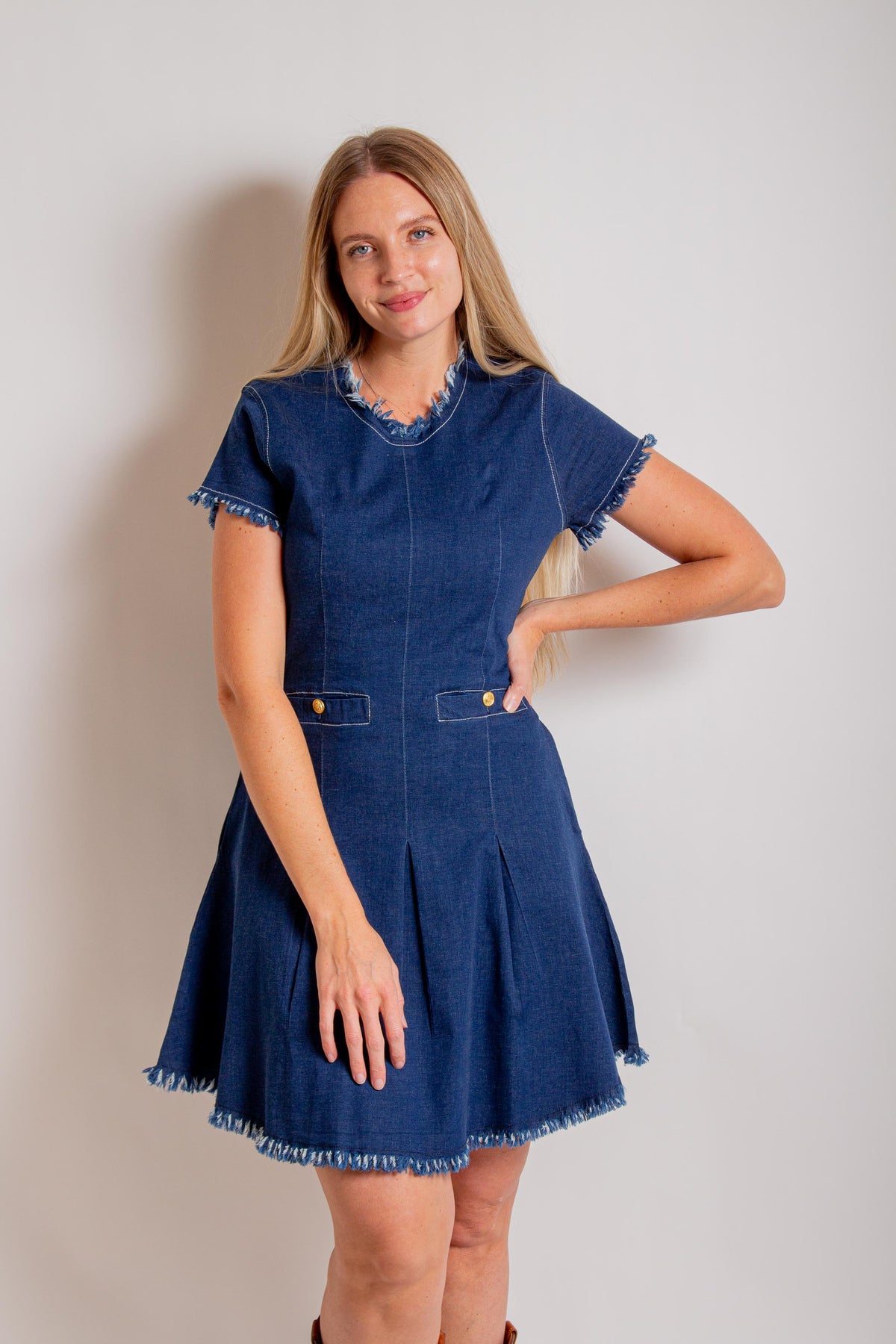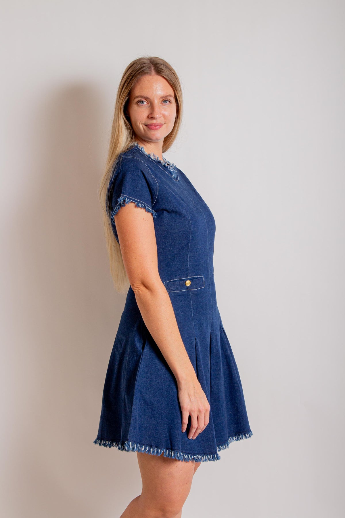 "Coco" Denim Dress with Short Cap Sleeves, Fray Scoop Neck, Pleated Front, Flare Skirting, Zip Closure at Back and Fray Hem.