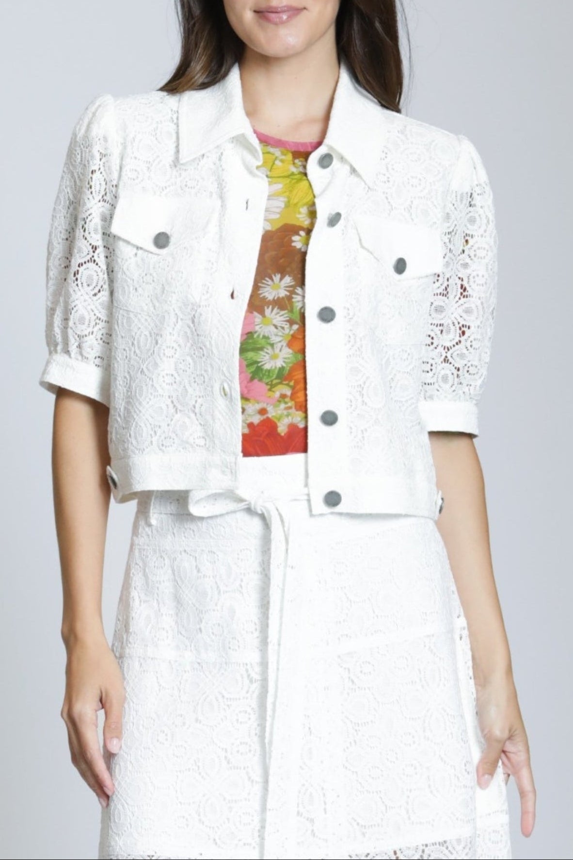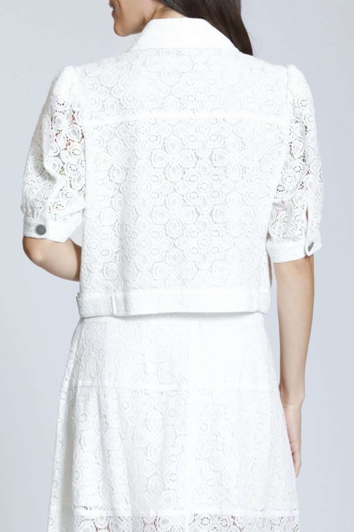 White Lace Crop Jean Jacket with Puff Sleeves, Collar, Front Button Closure and Front Button Chest Pockets.