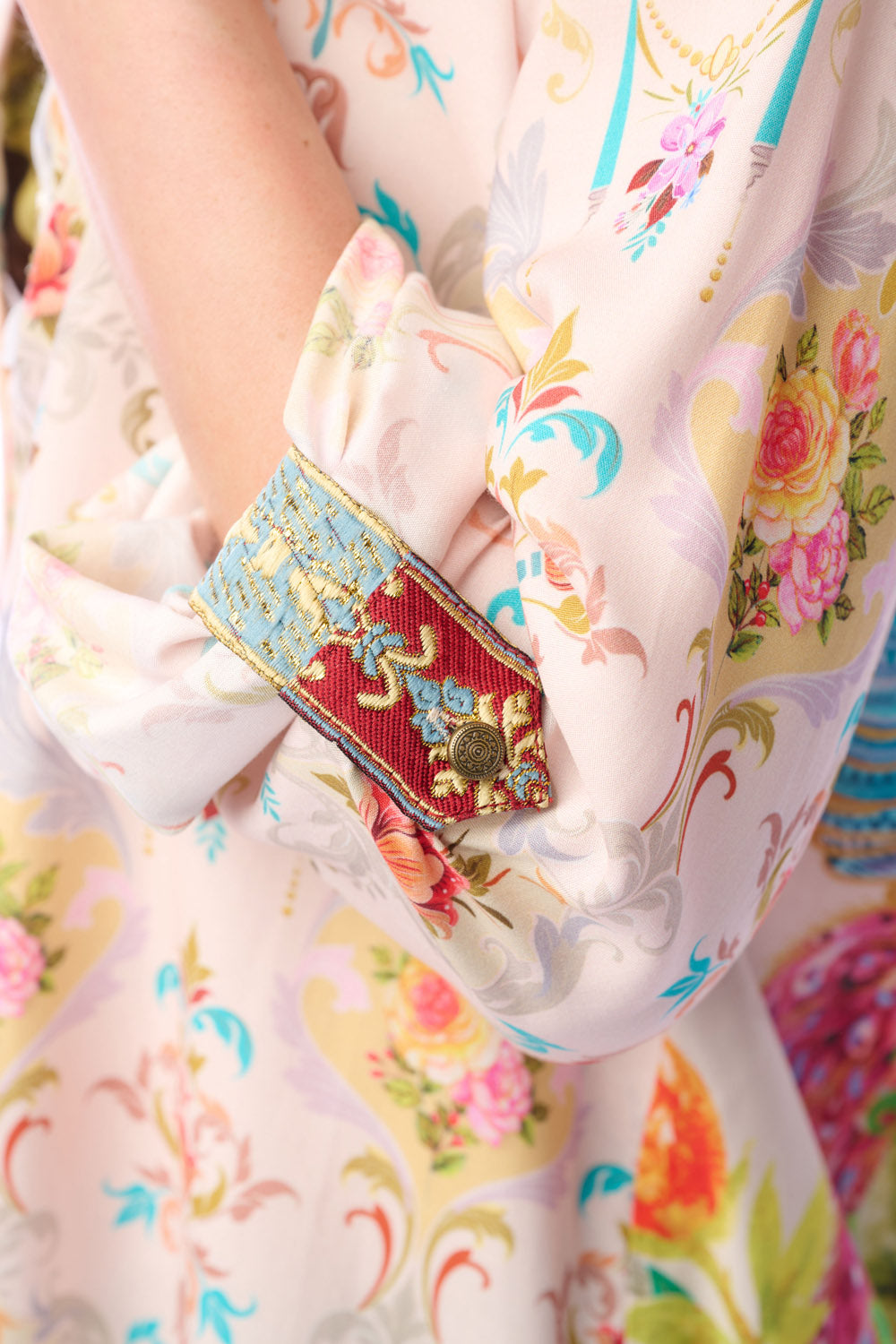 Floral/peacock print button-up shirt with beaded trim next to the upper CF placket, CF placket with 1 crystal decorative button, jacquard trim roll-over sleeve tabs, high-low hem