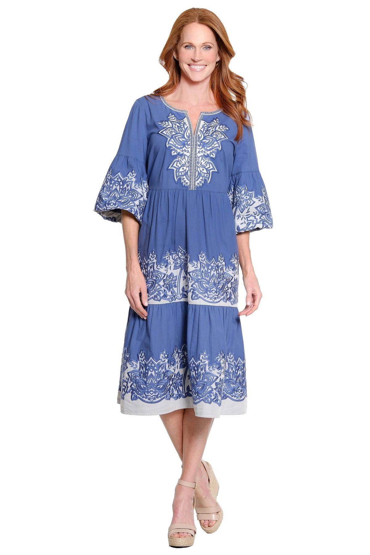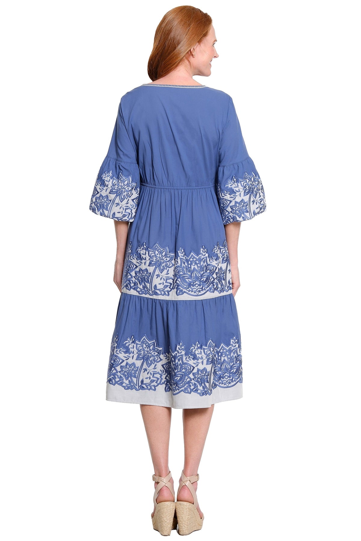 This tiered dress is crafted from soft cotton for a breathable and comfortable feel. Designed with embroidered detailing and 3/4 length bubble sleeves, it features a relaxed silhouette with gentle structure for easy, everyday wear.