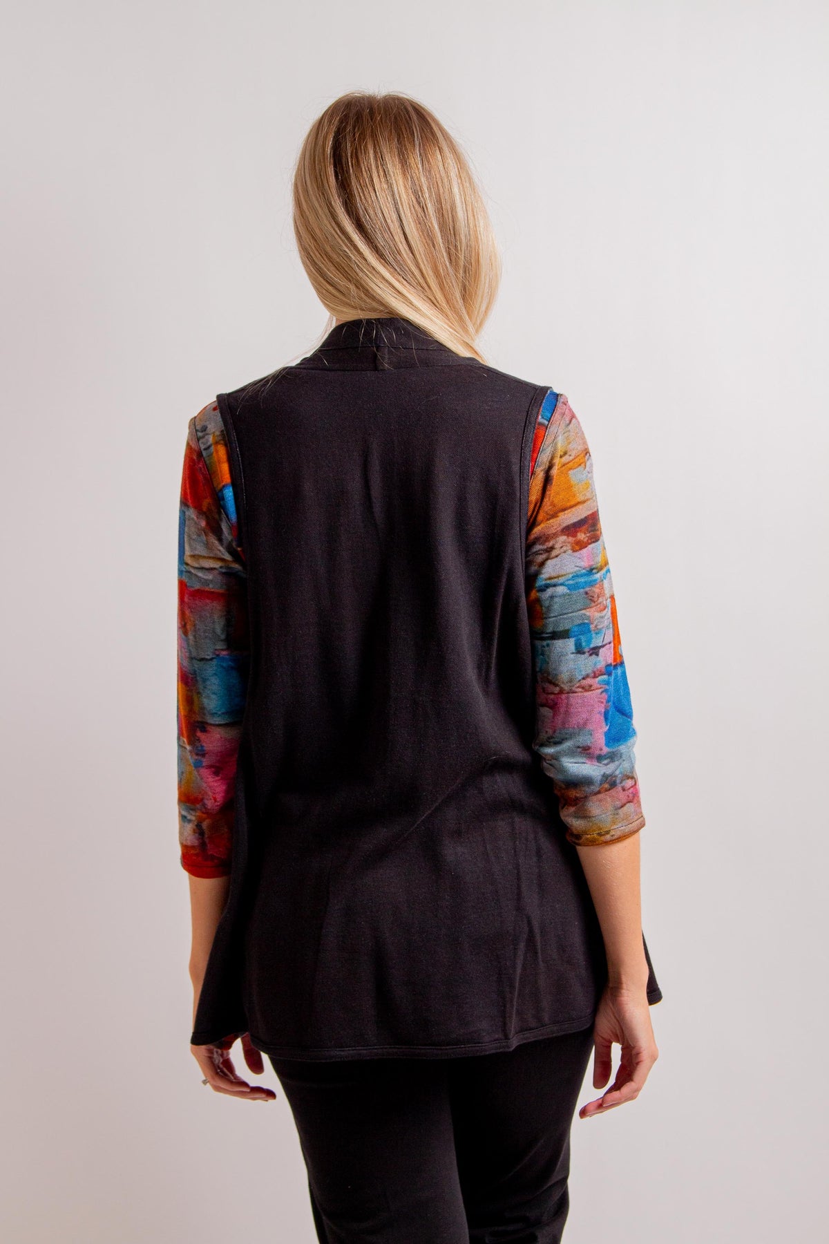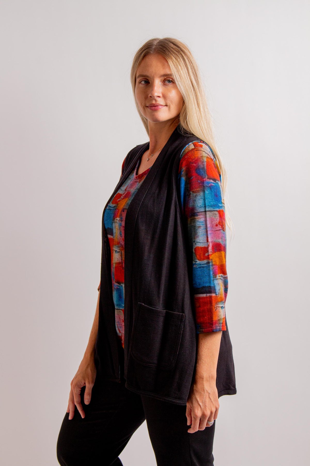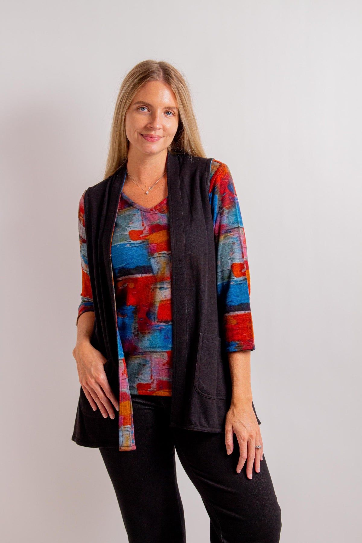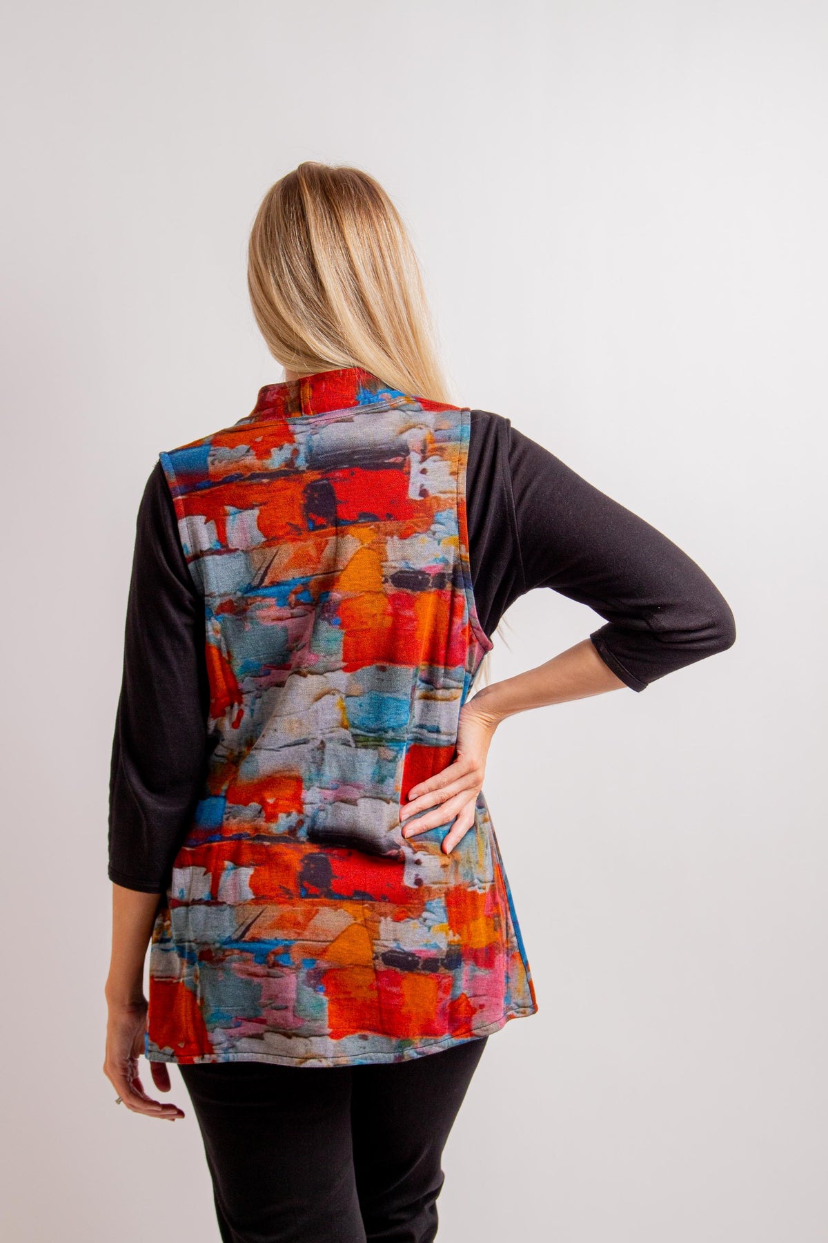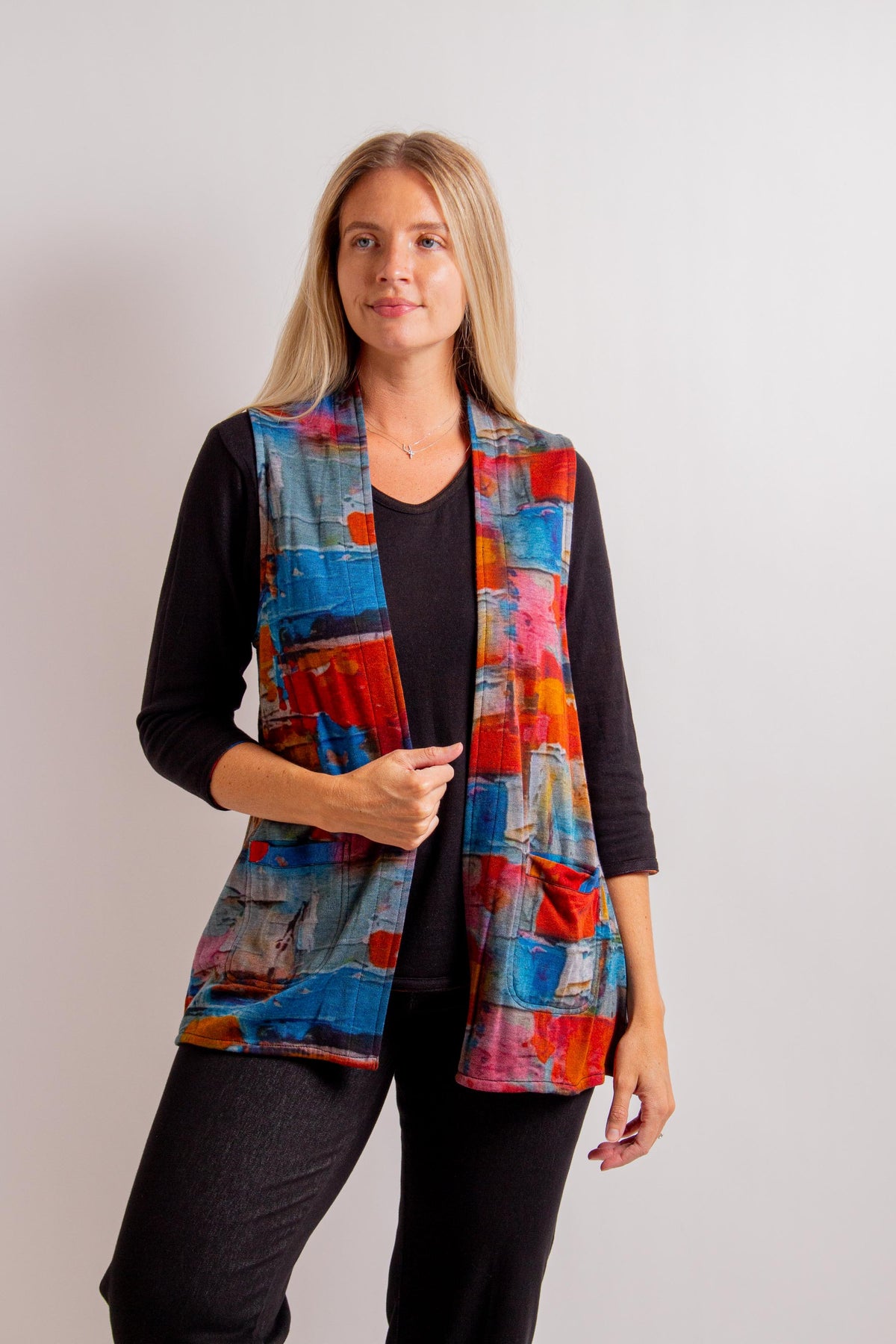"Alana" Rev Vest with Red, Blue, Orange Abstract Patch Print and Open Front. Fabric: 60% Cotton, 40% Rayon