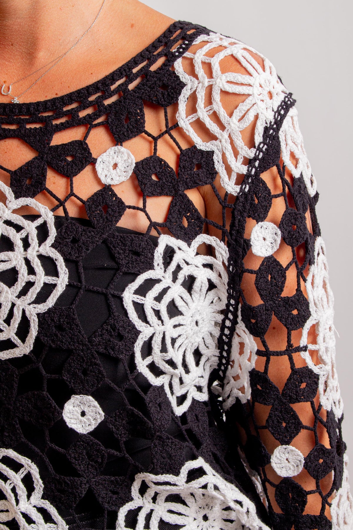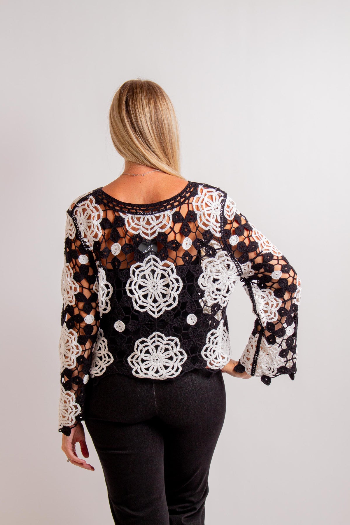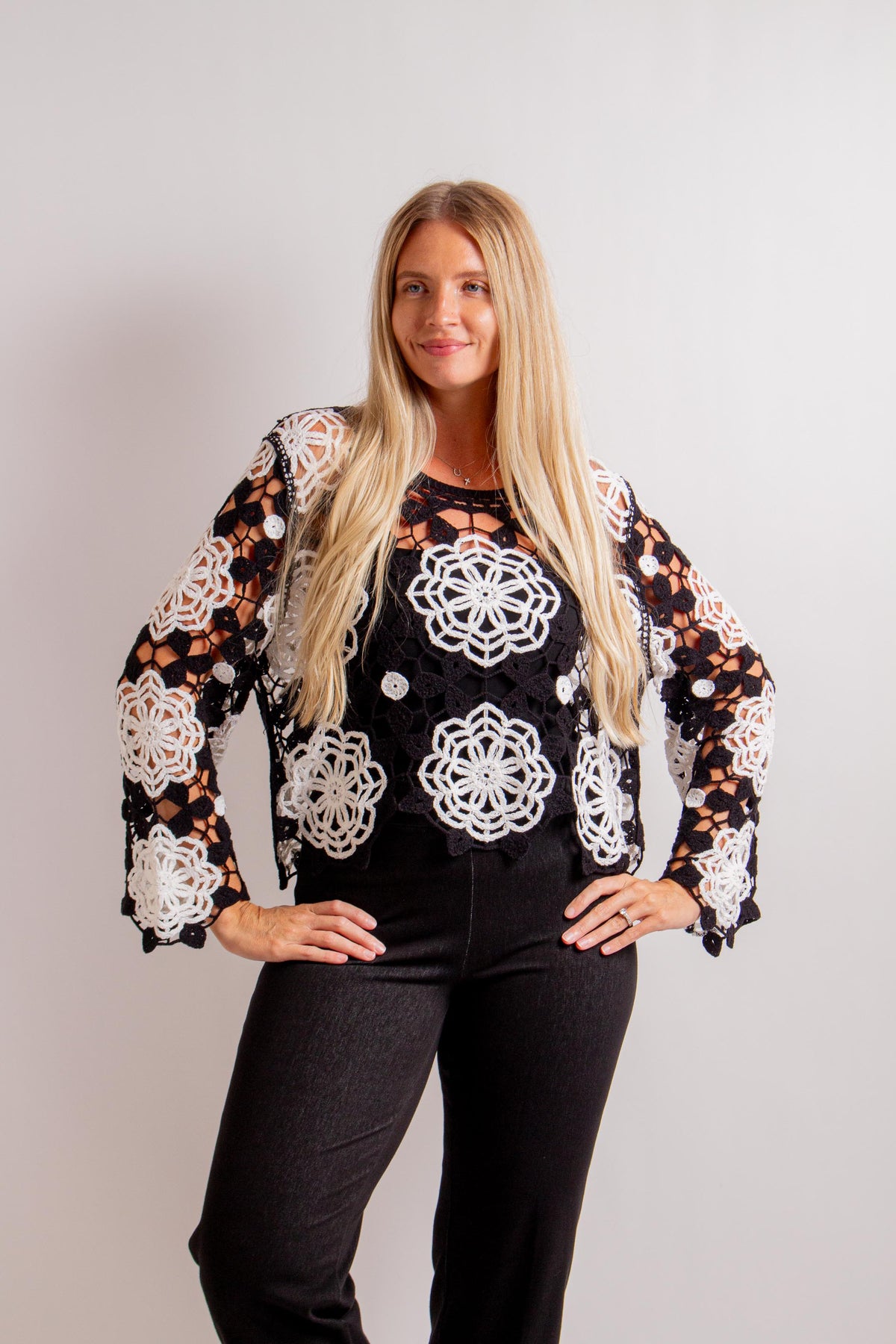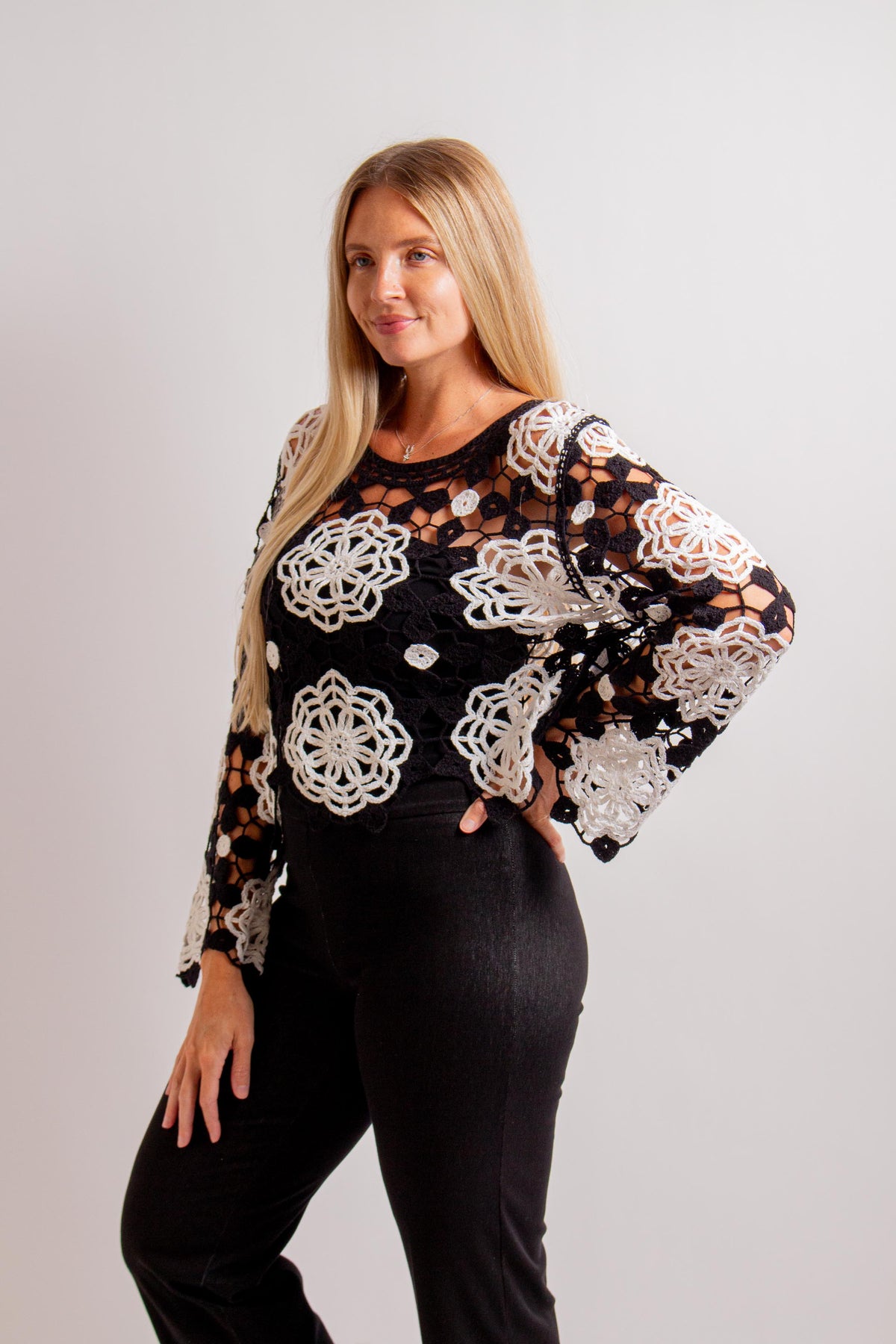 Black & Ivory Floral Crochet Top with Long Sleeves. Fabric: 60% Cotton, 40% Acrylic