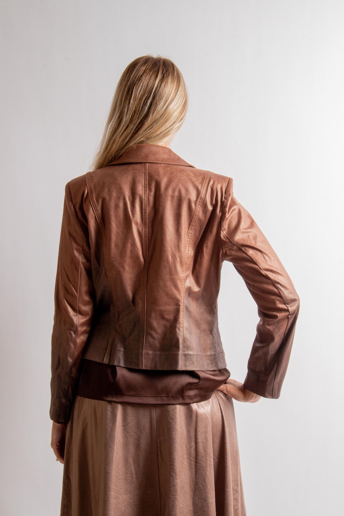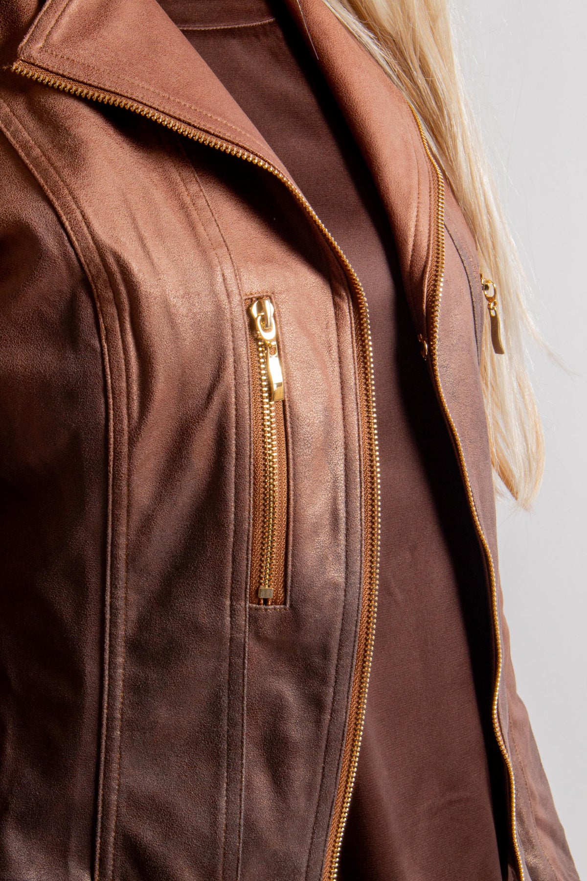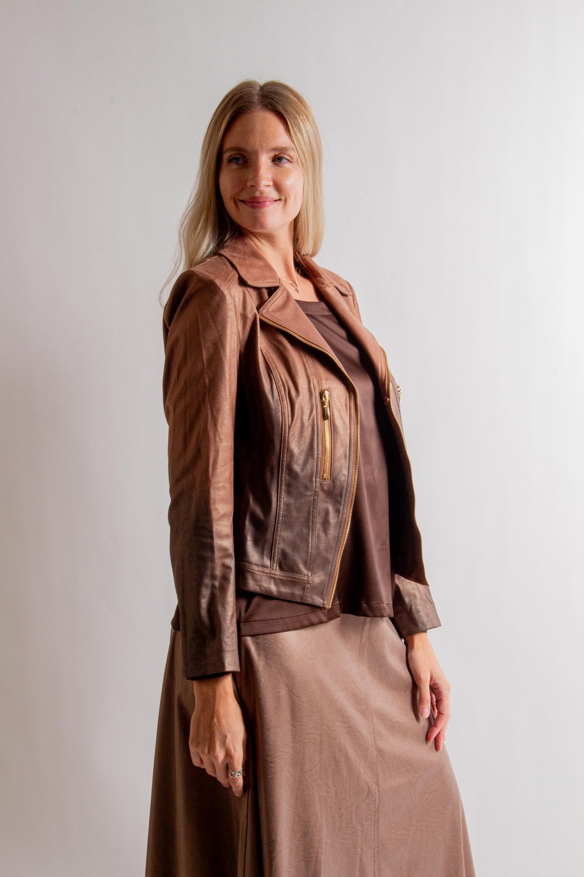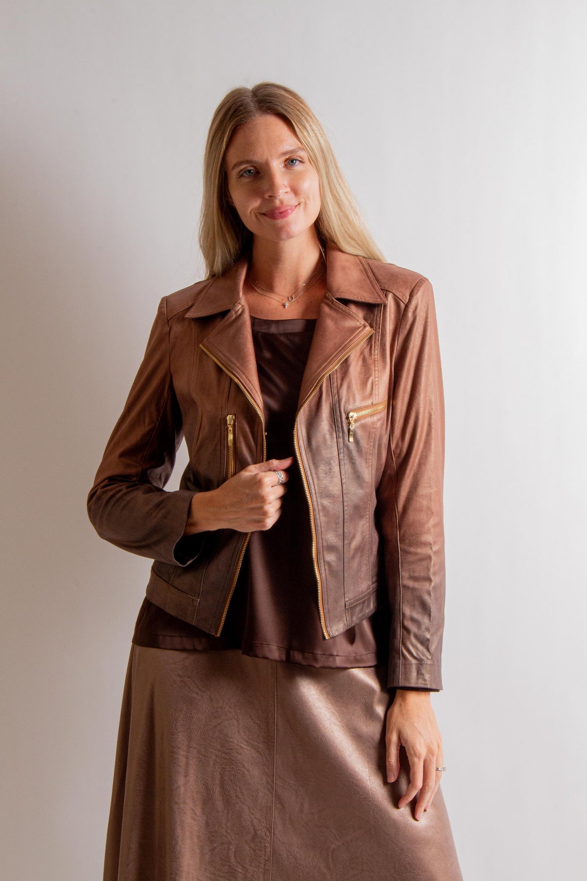 Brown Shades Ombre Print Vegan Leather Moto Jacket with Long Sleeves and Collar. Fabric: 90% Polyester, 10% Spandex