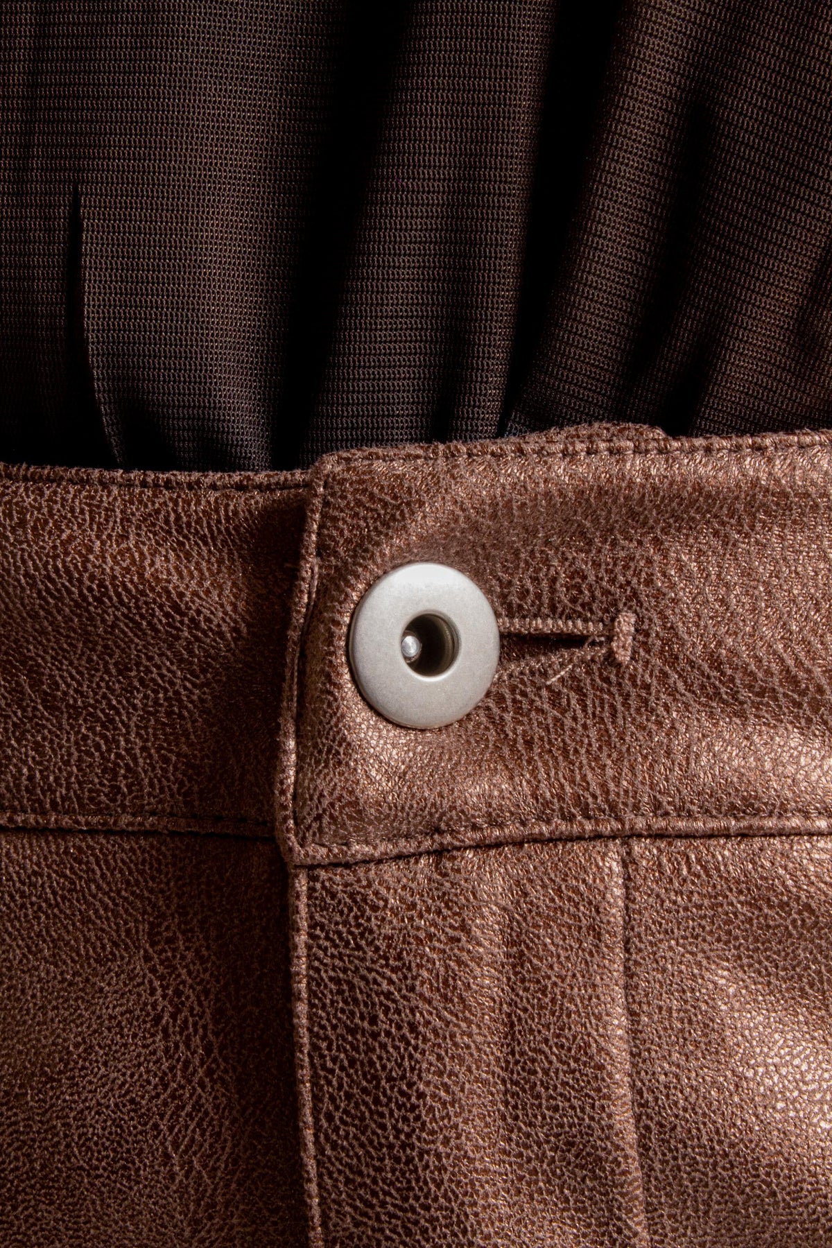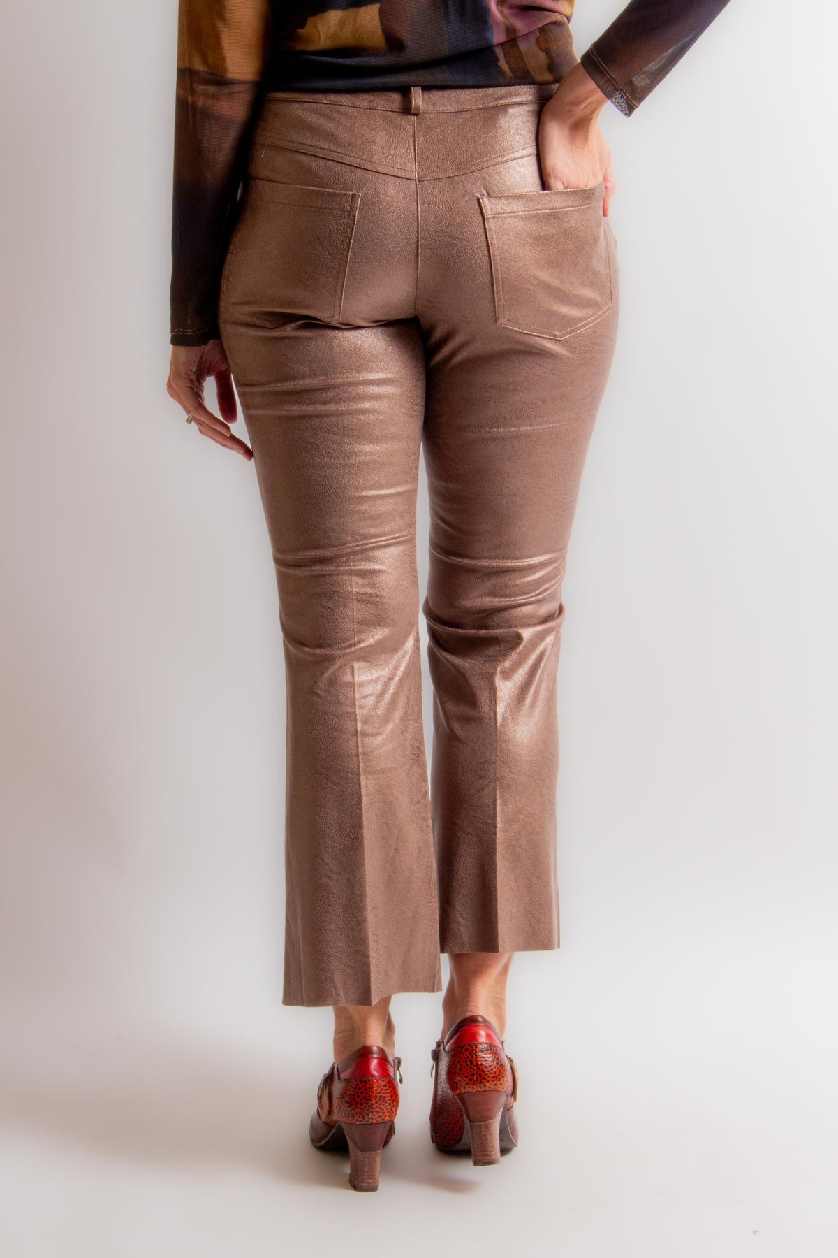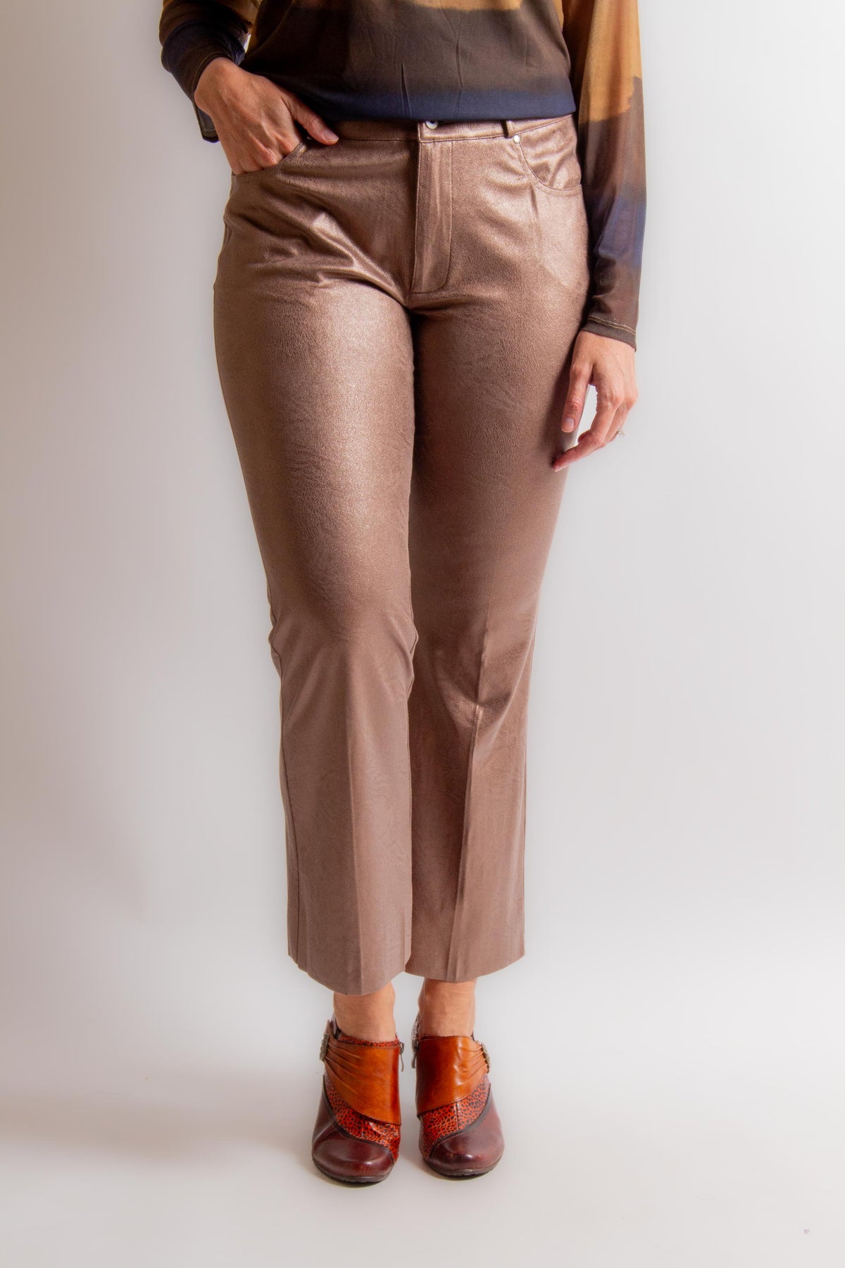 Bronze Vegan Leather Metallic Pant with Front Zip and Button Fly, Front and Back Pockets. Fabric: 90% Polyester, 10% Spandex