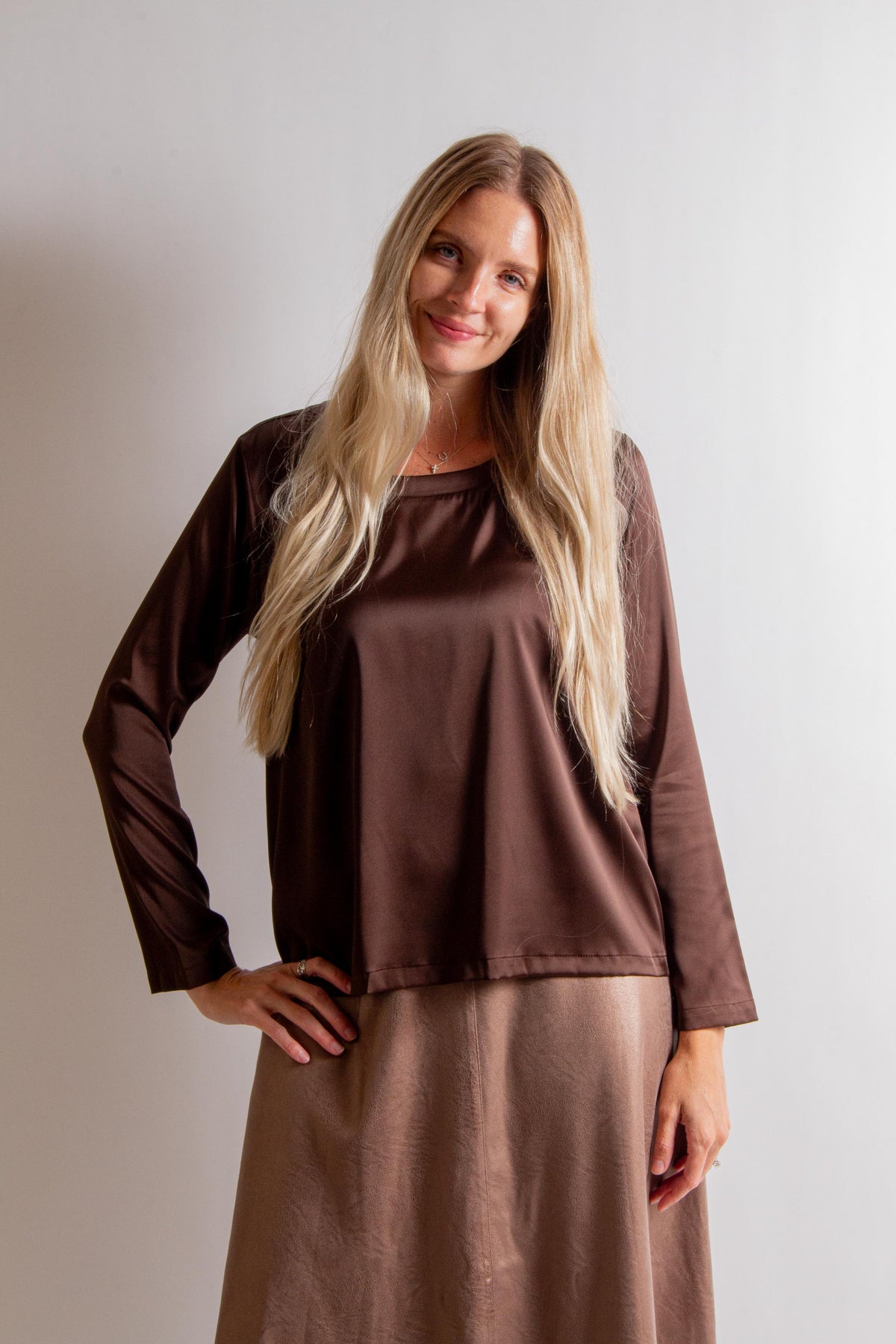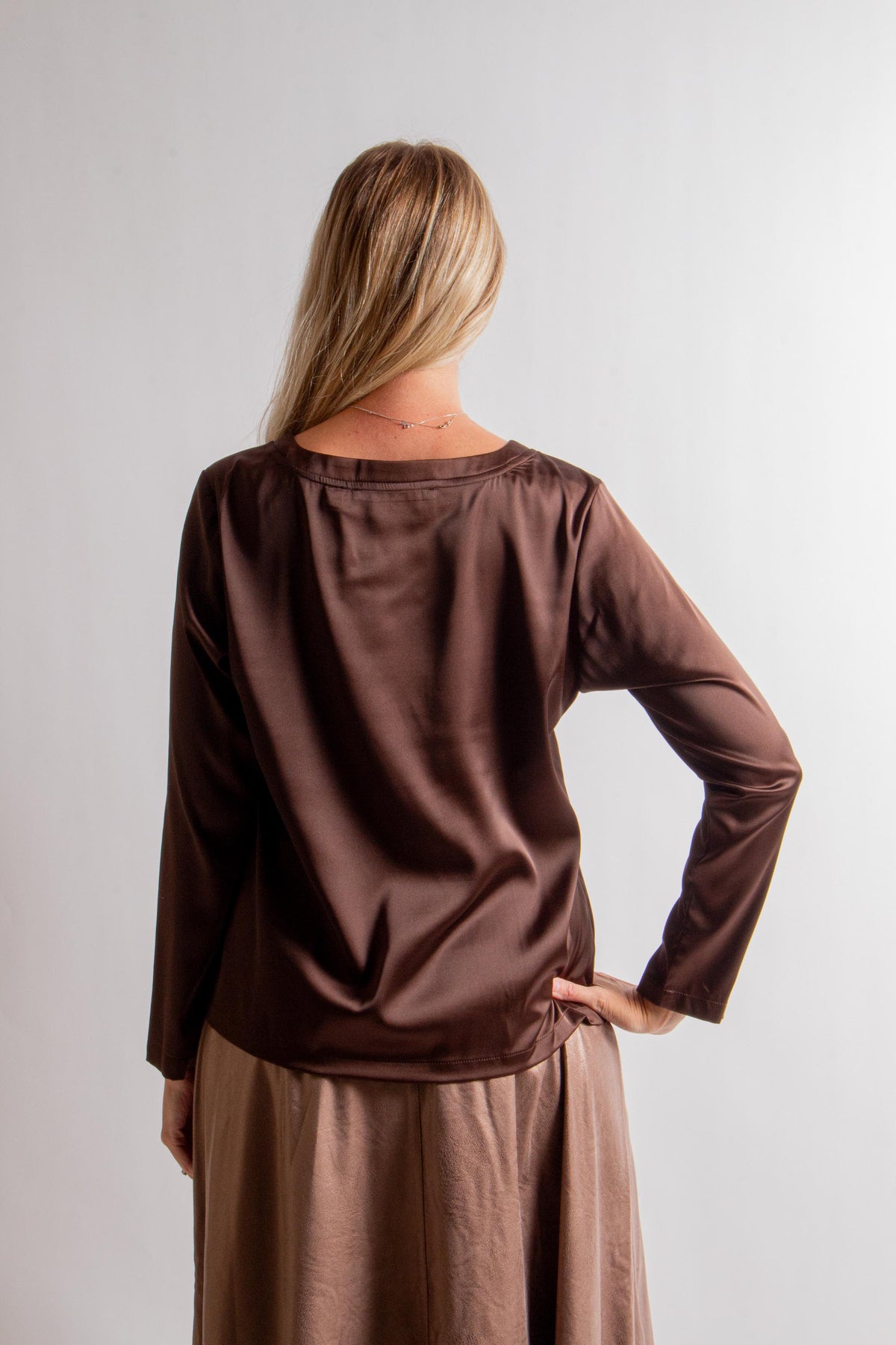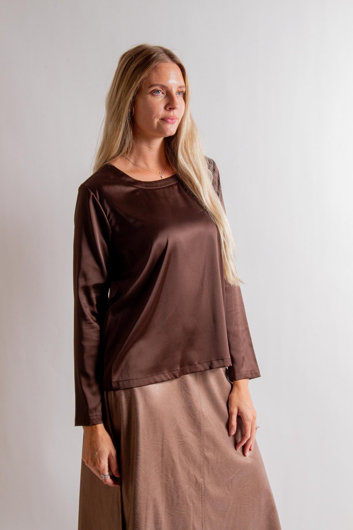 Solid Long Sleeve Chocolate Brown Top with Scoop Neck. Fabric: 96% Polyester, 4% Spandex