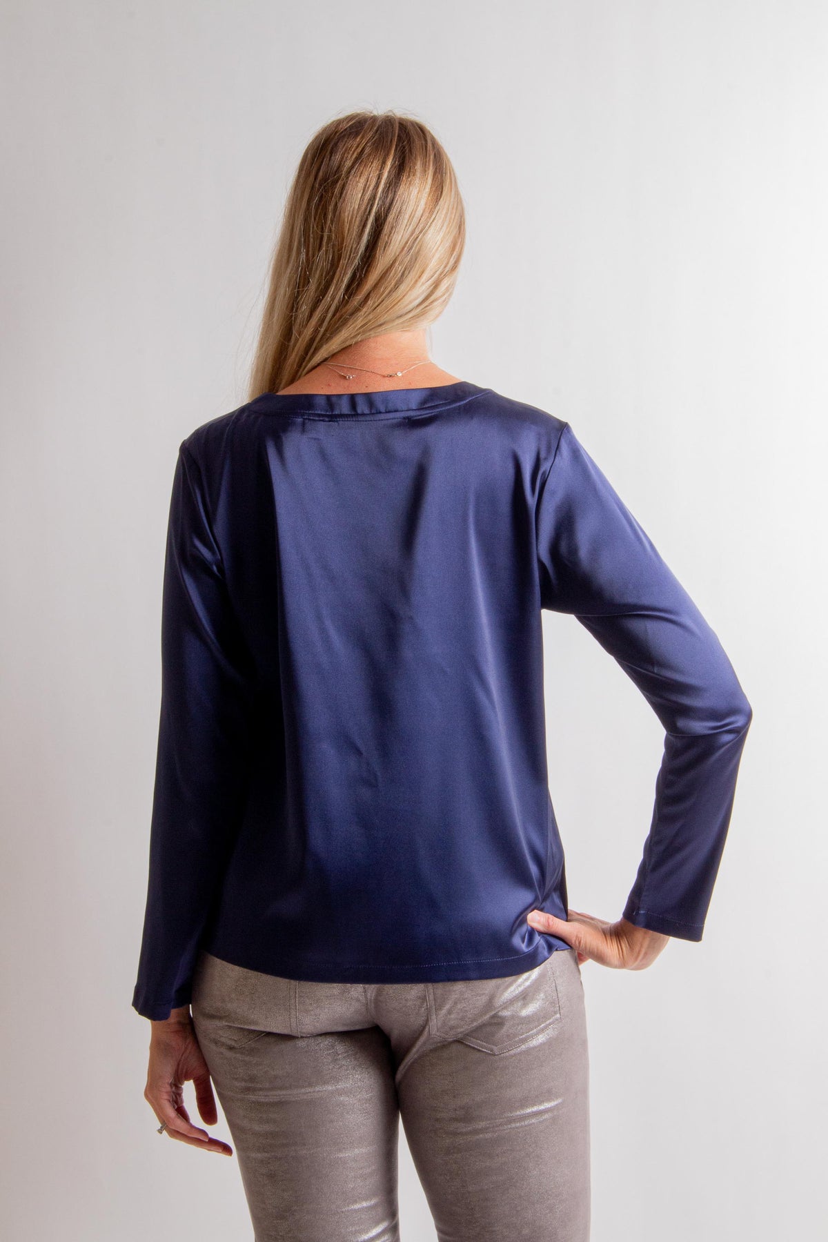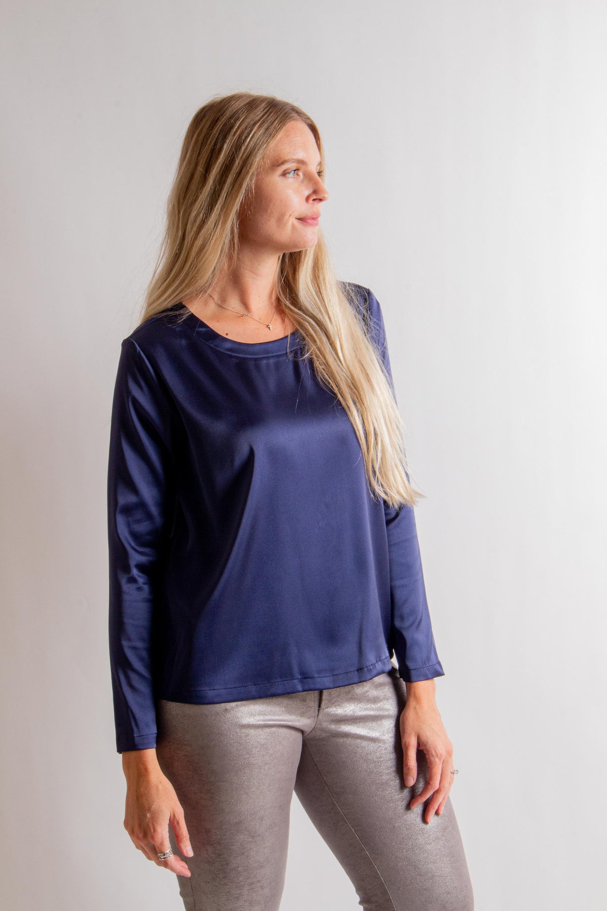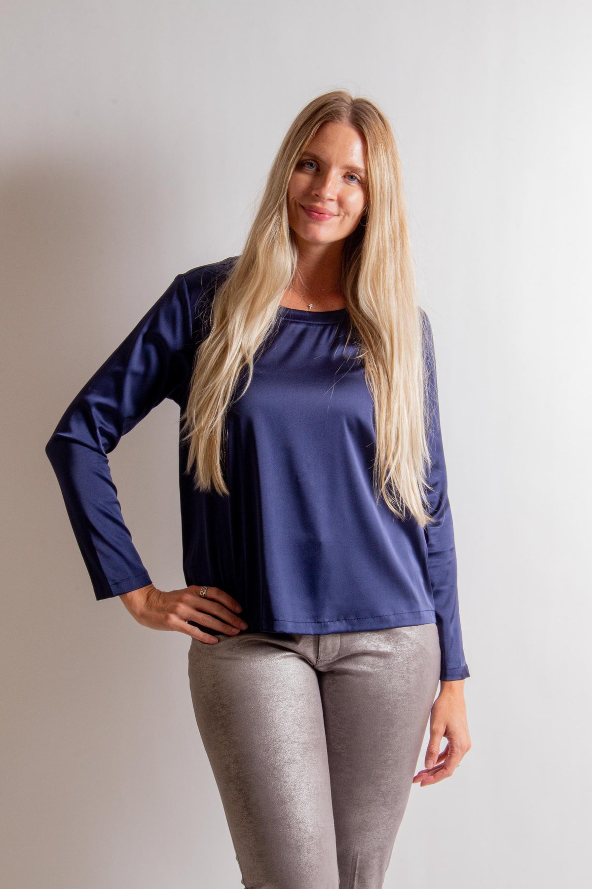 Solid Long Sleeve Navy "Future Dusk" Top with Scoop Neck. Fabric: 96% Polyester, 4% Spandex