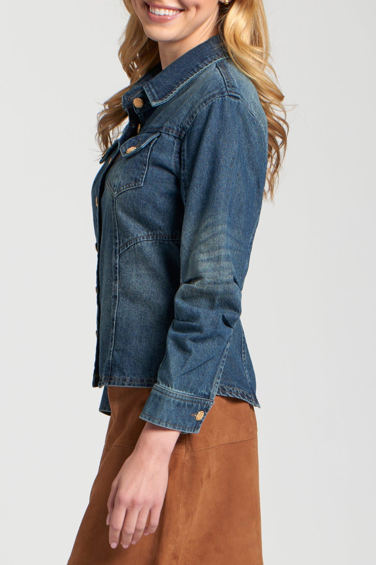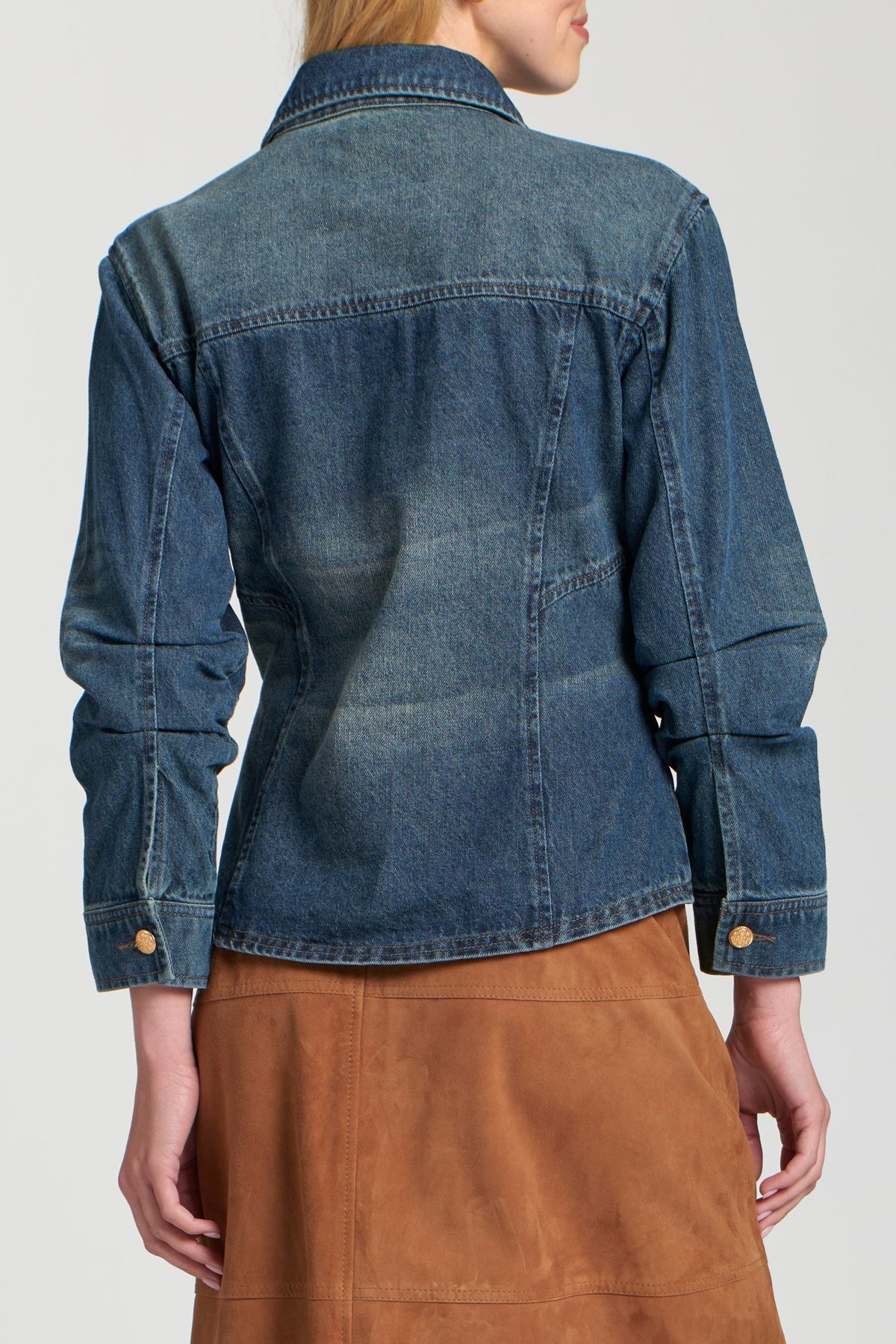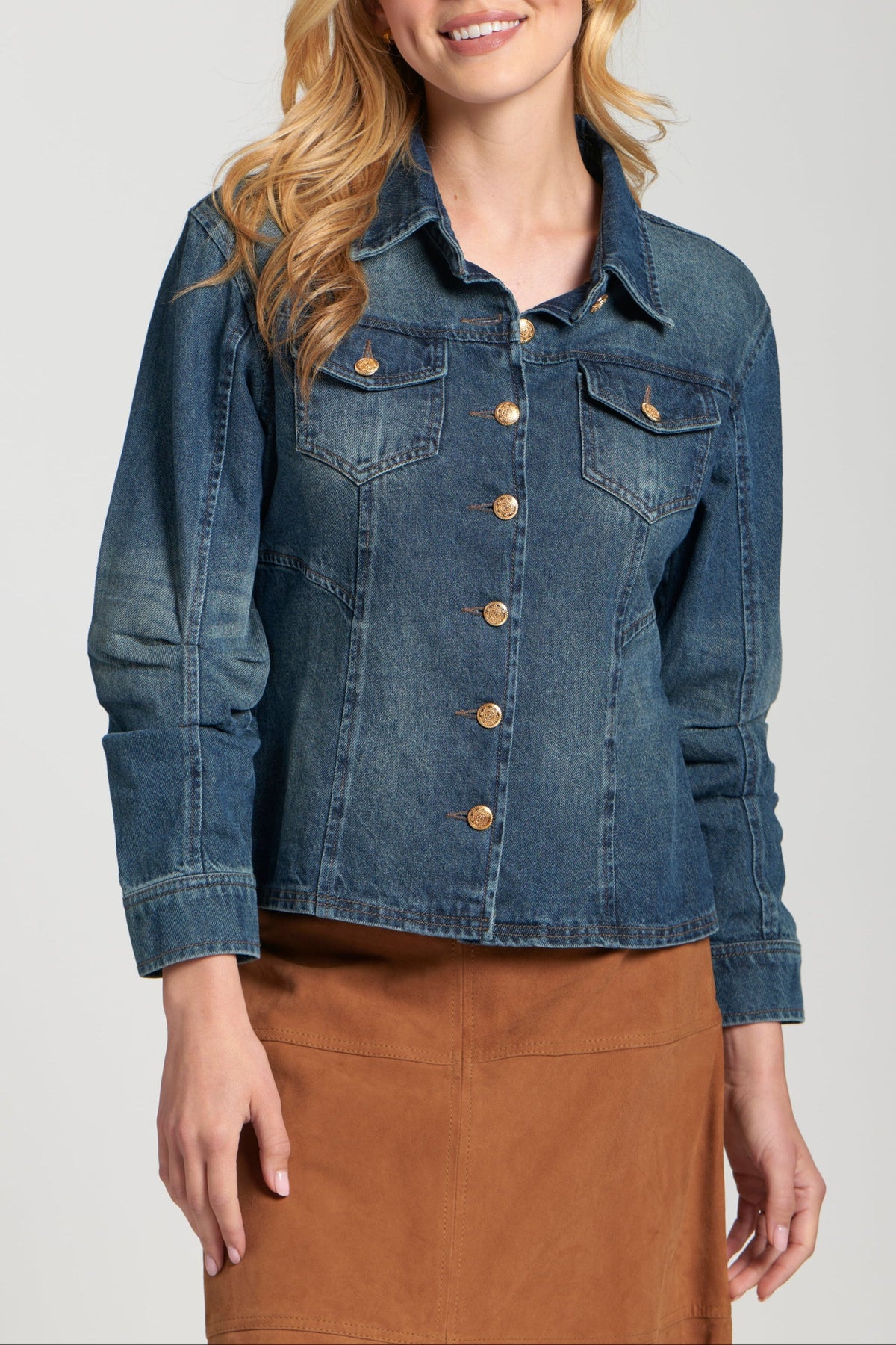 Scrunched Sleeves. This versatile jacket features a traditional point collar, a full button-front closure with elegant gold-tone buttons, and functional chest flap pockets. The unique scrunch detailing on the long sleeves adds a touch of modern flair and comfort, making this medium-wash denim jacket a perfect and effortlessly chic addition to any casual ensemble.