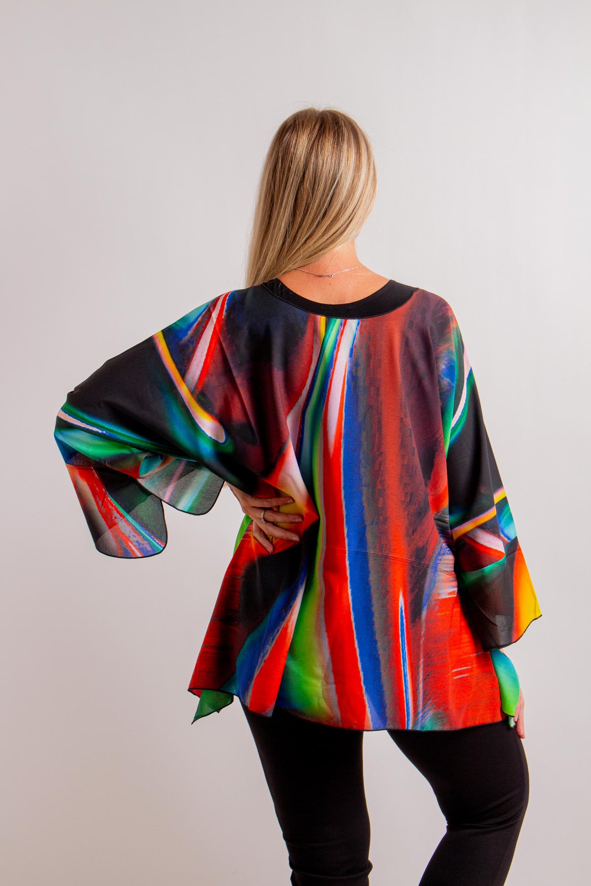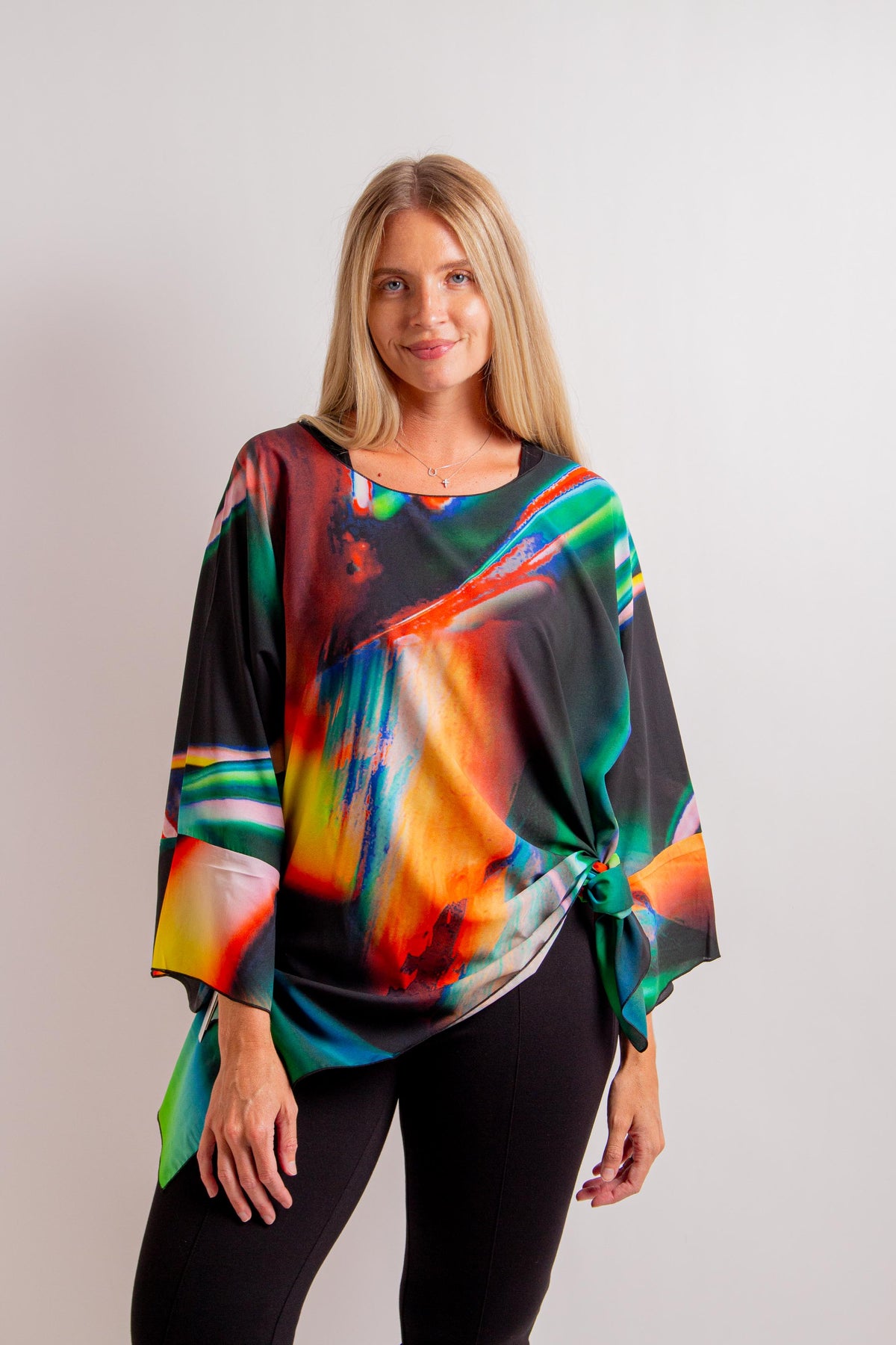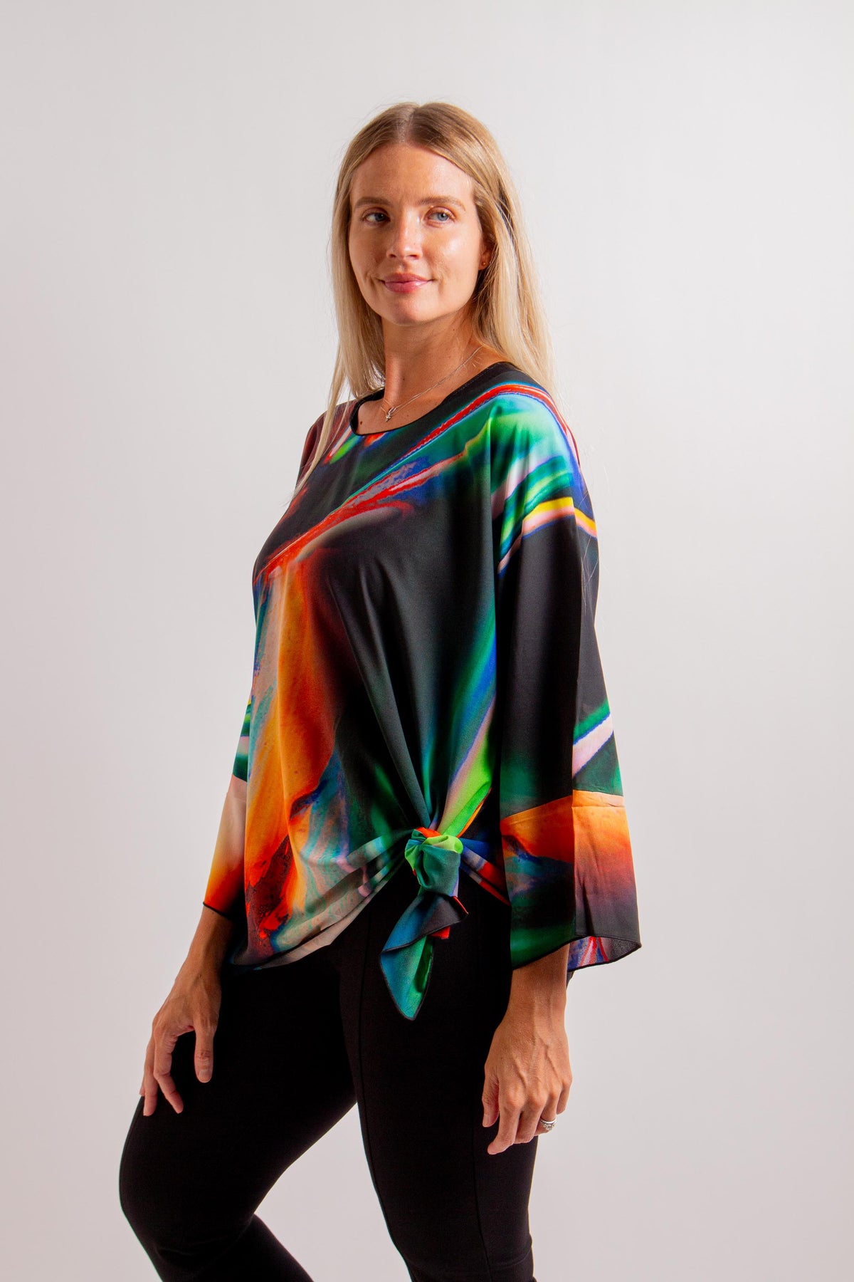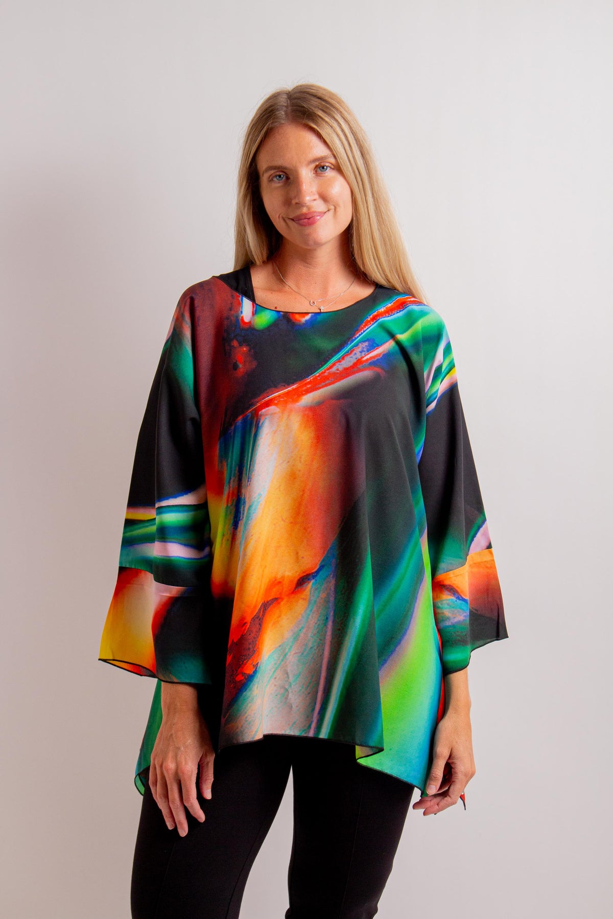 Bright Watercolor Swirl Tunic with Sharkbite Hem, 3/4 Sleeves and Scoop Neck. Fabric: 100% Polyester