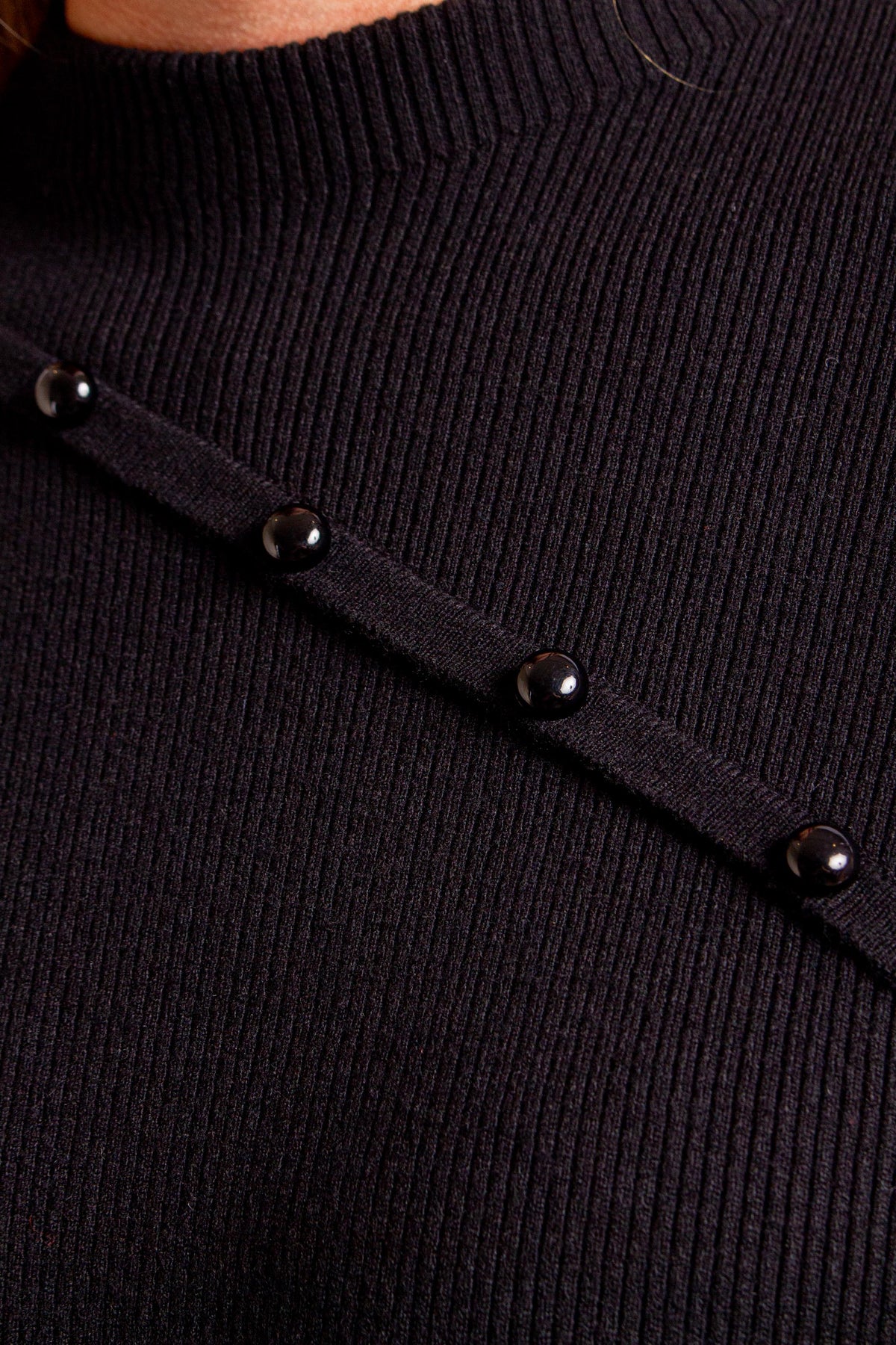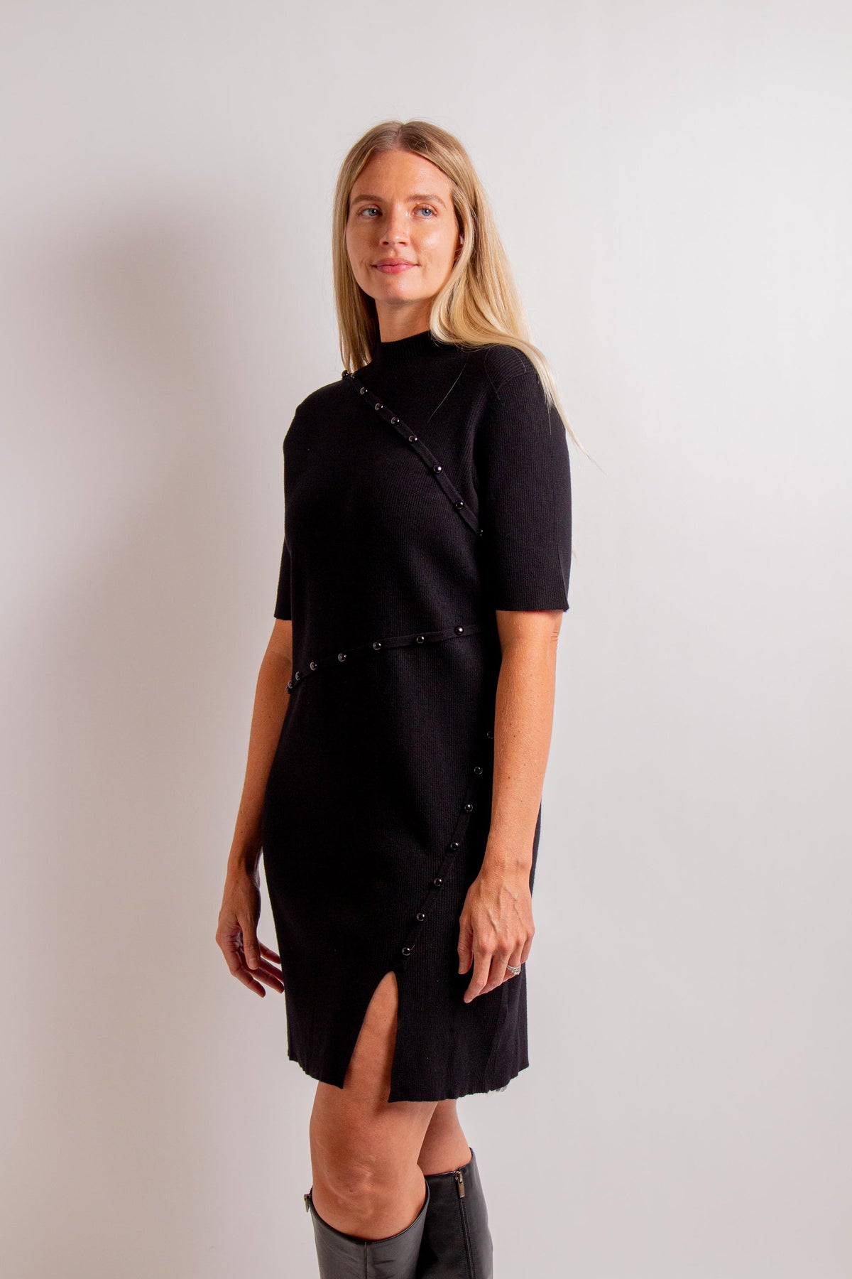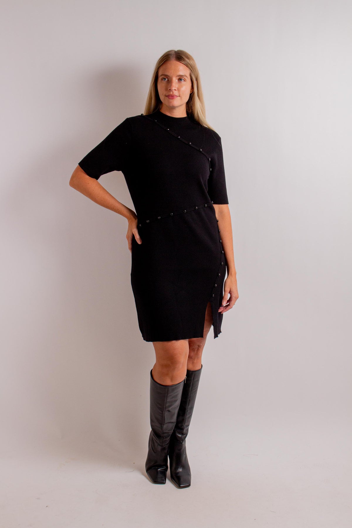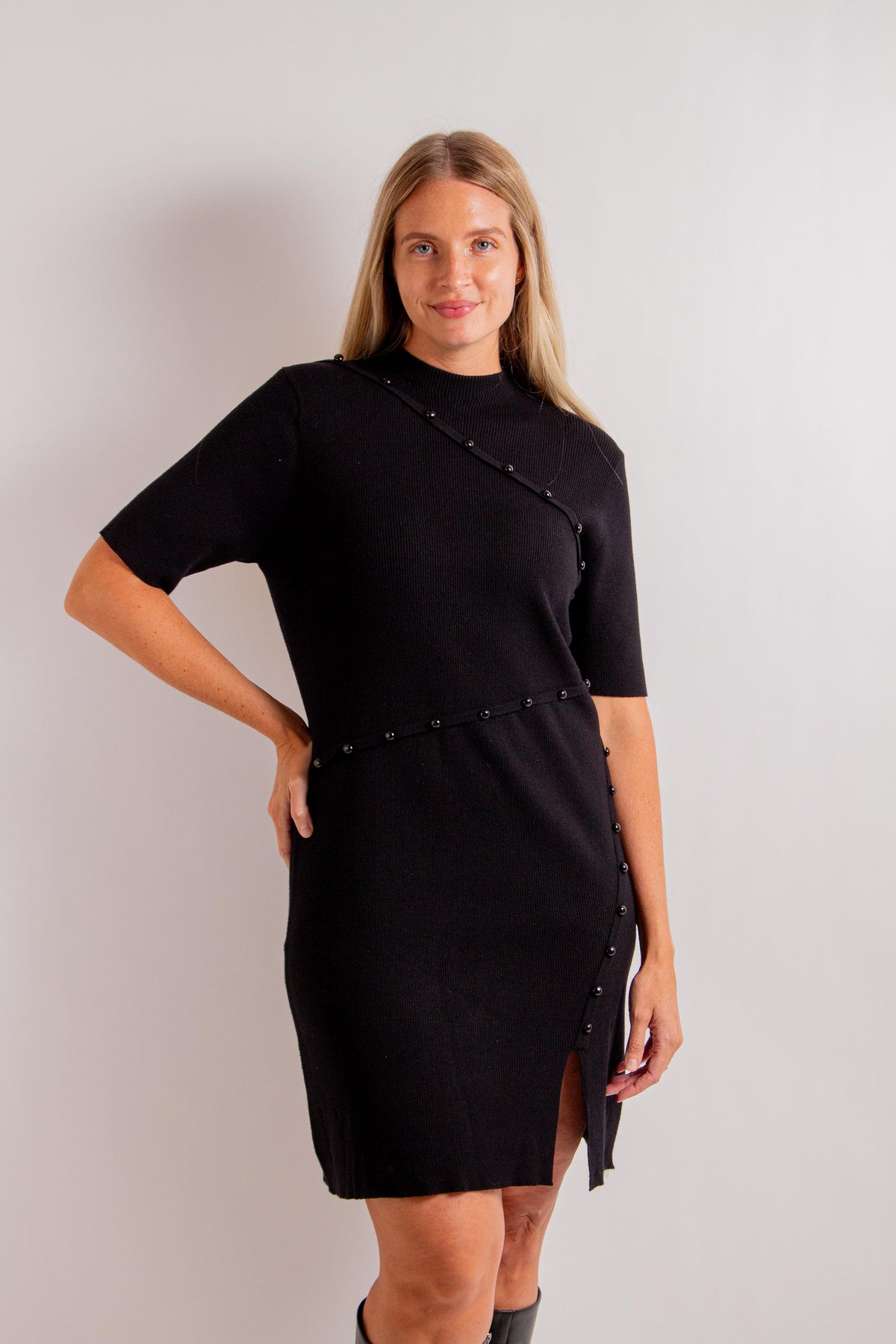 Black Asymmetrical Sweater Dress with Seam Detail. Fabric: 50% Viscose, 28% Polyester, 22% Nylon