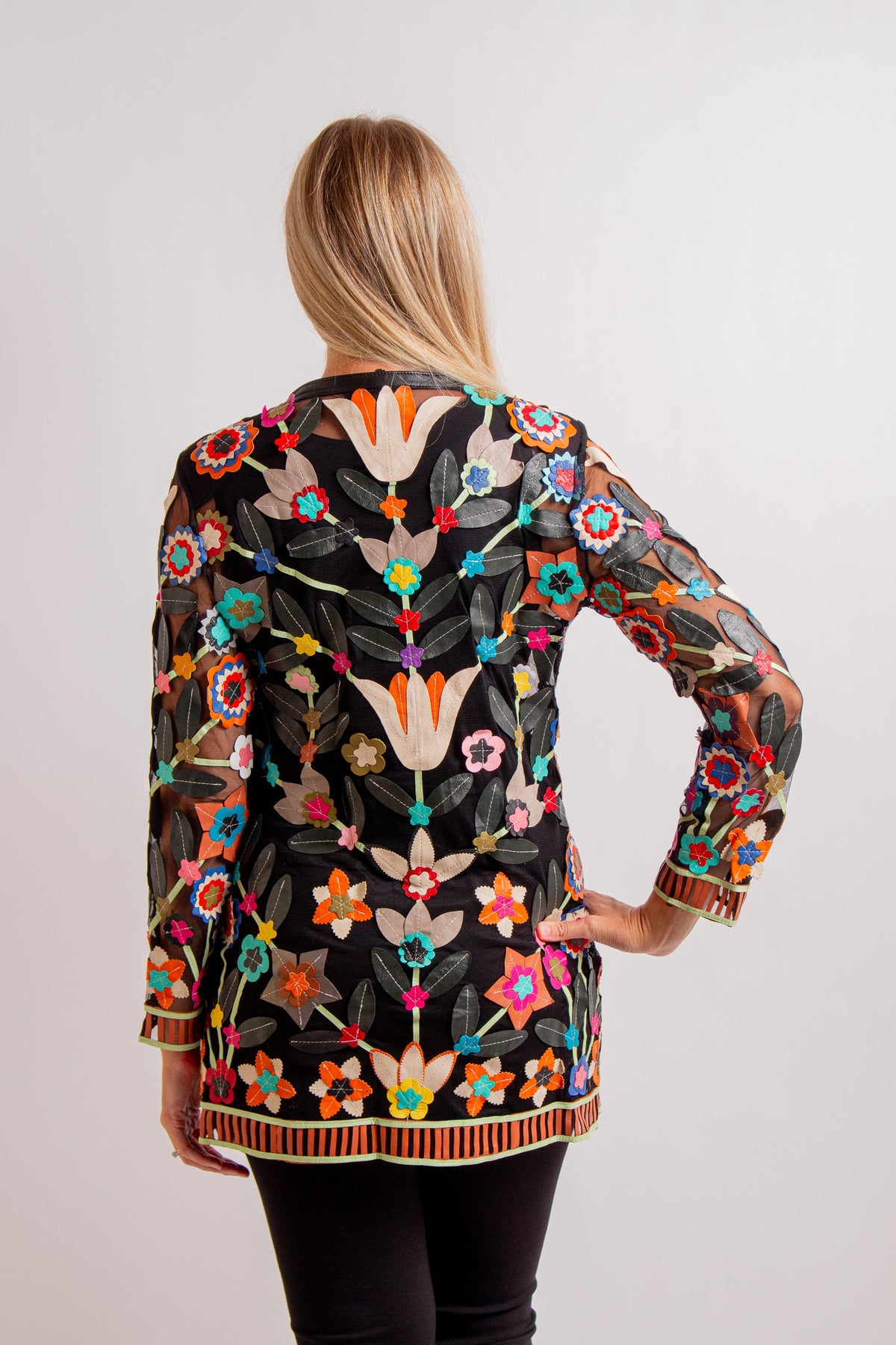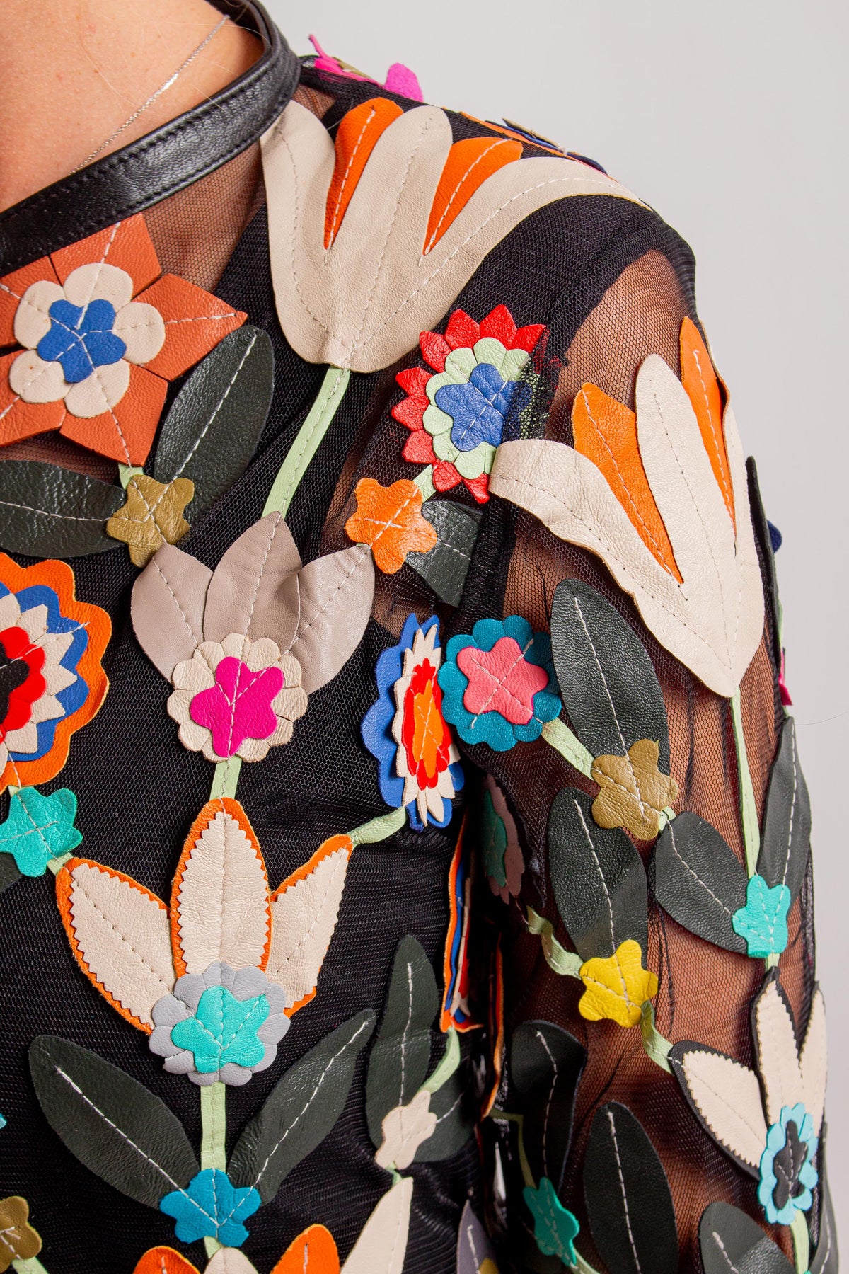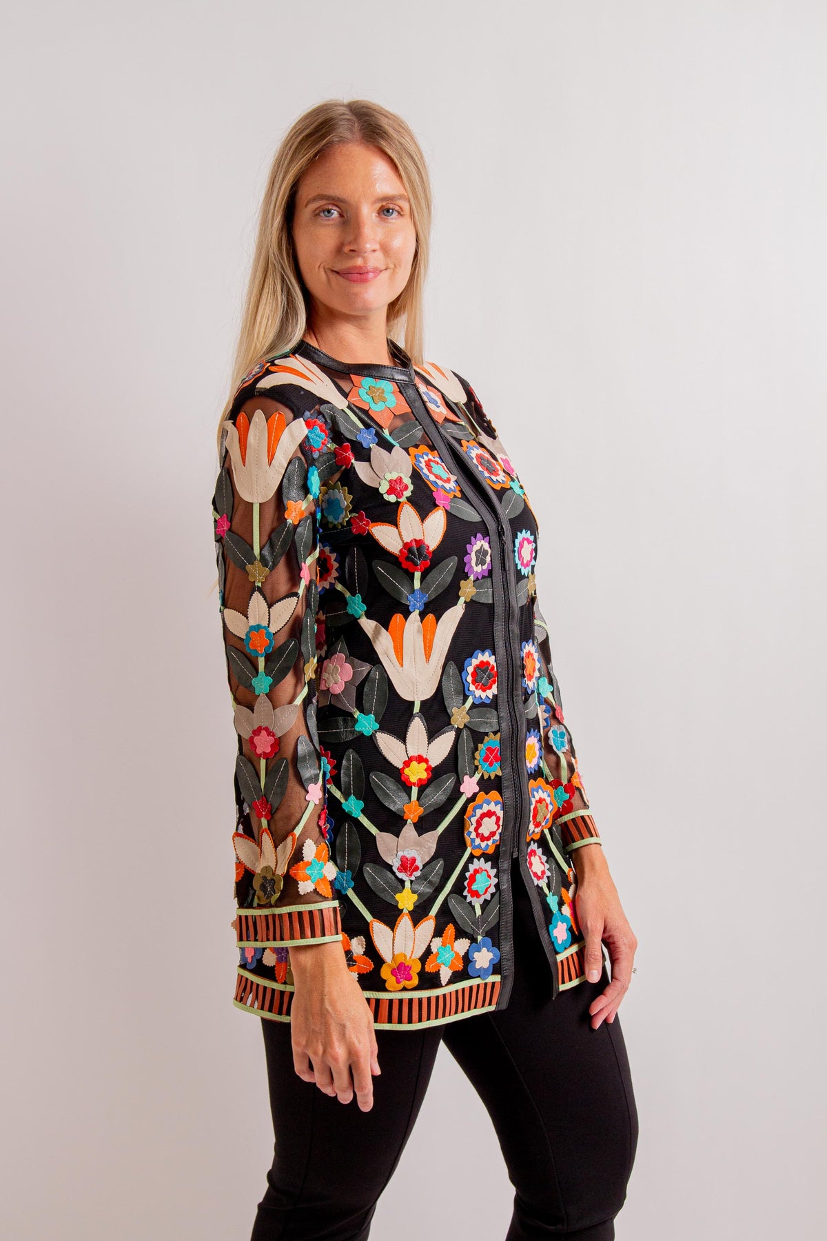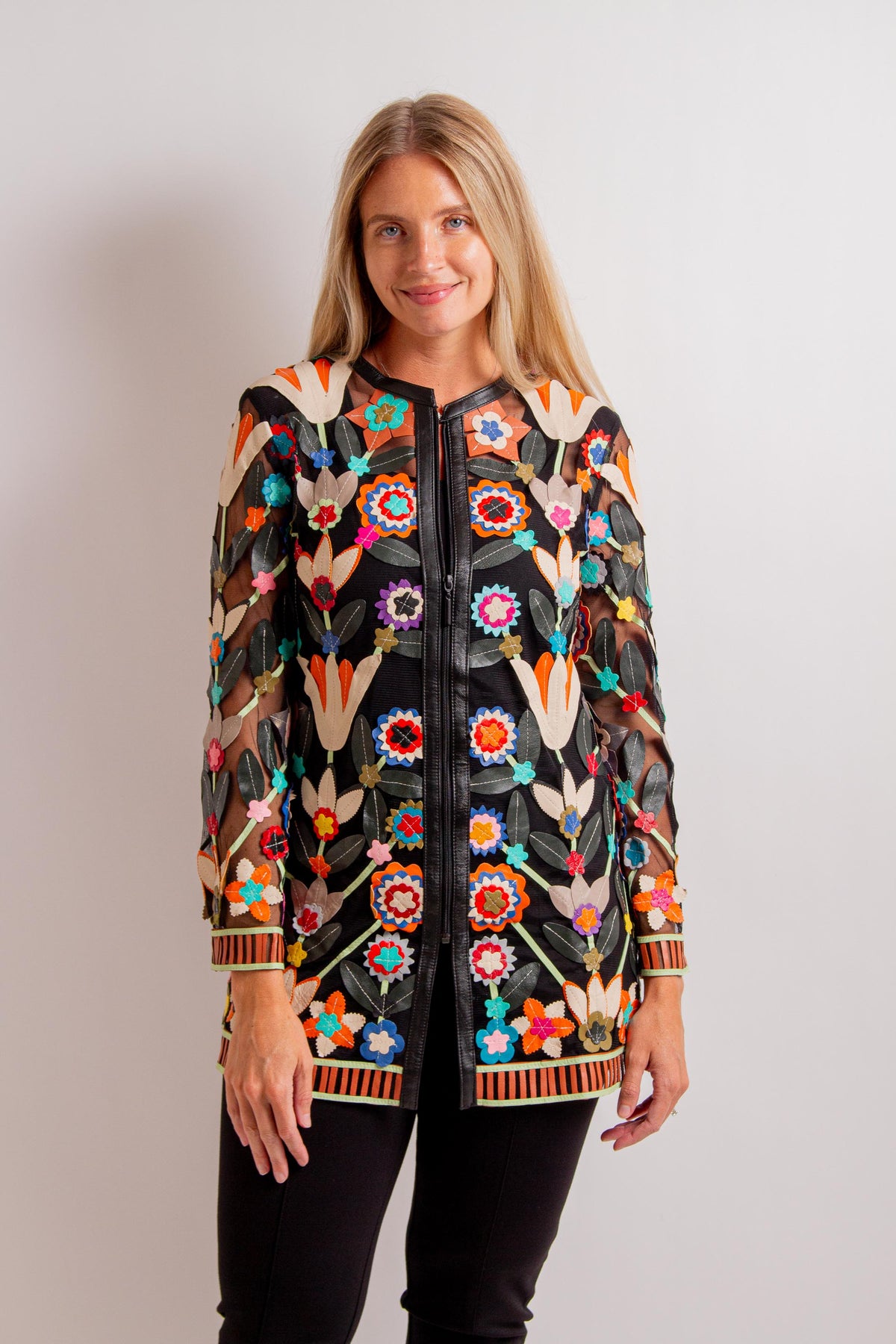 "Halian" 32inch Long Multicolor Laser Floral Mesh Leather Jacket with Zip Closure. Fabric: Genuine Leather