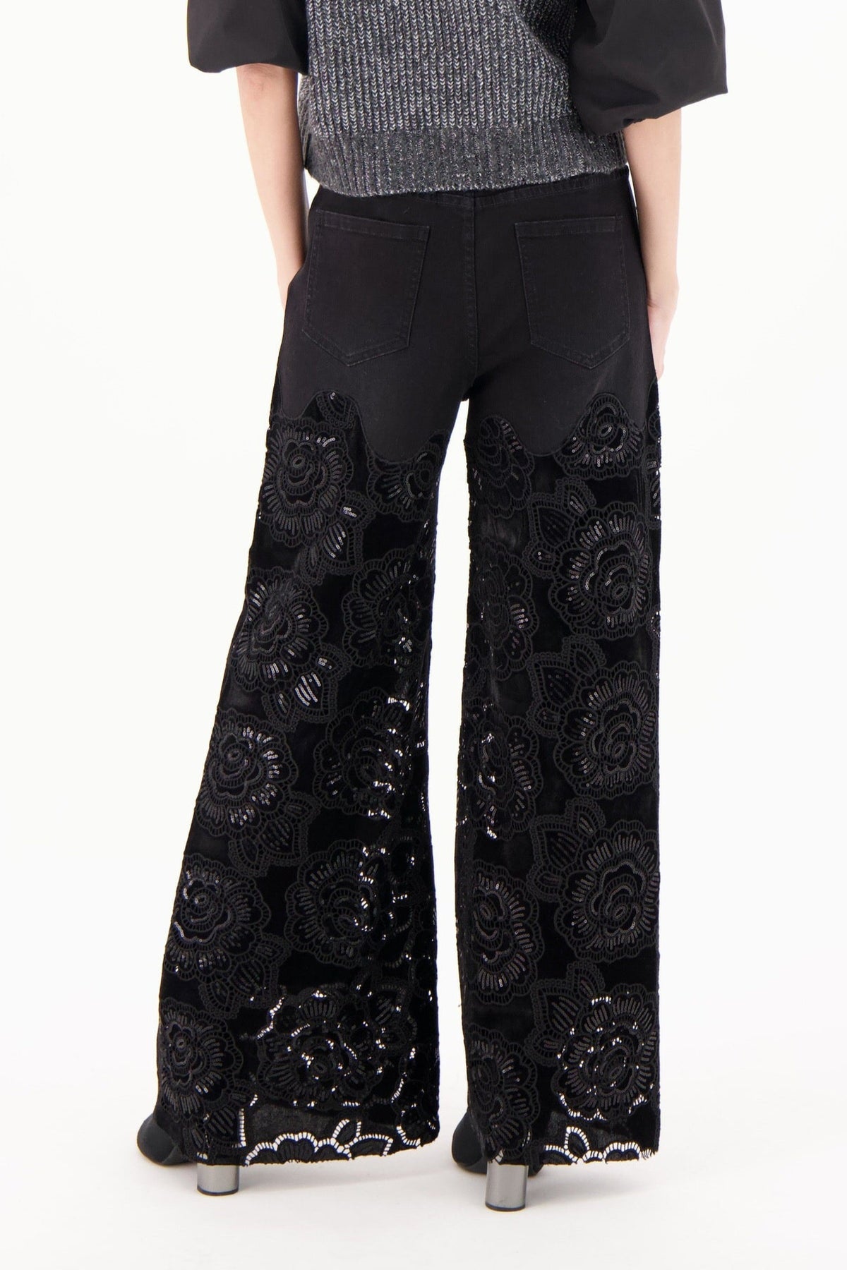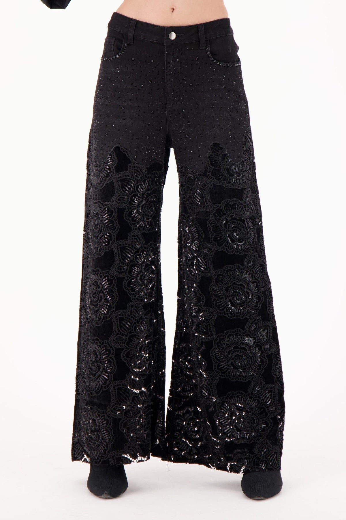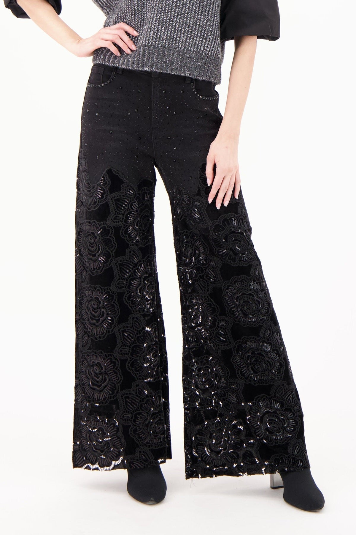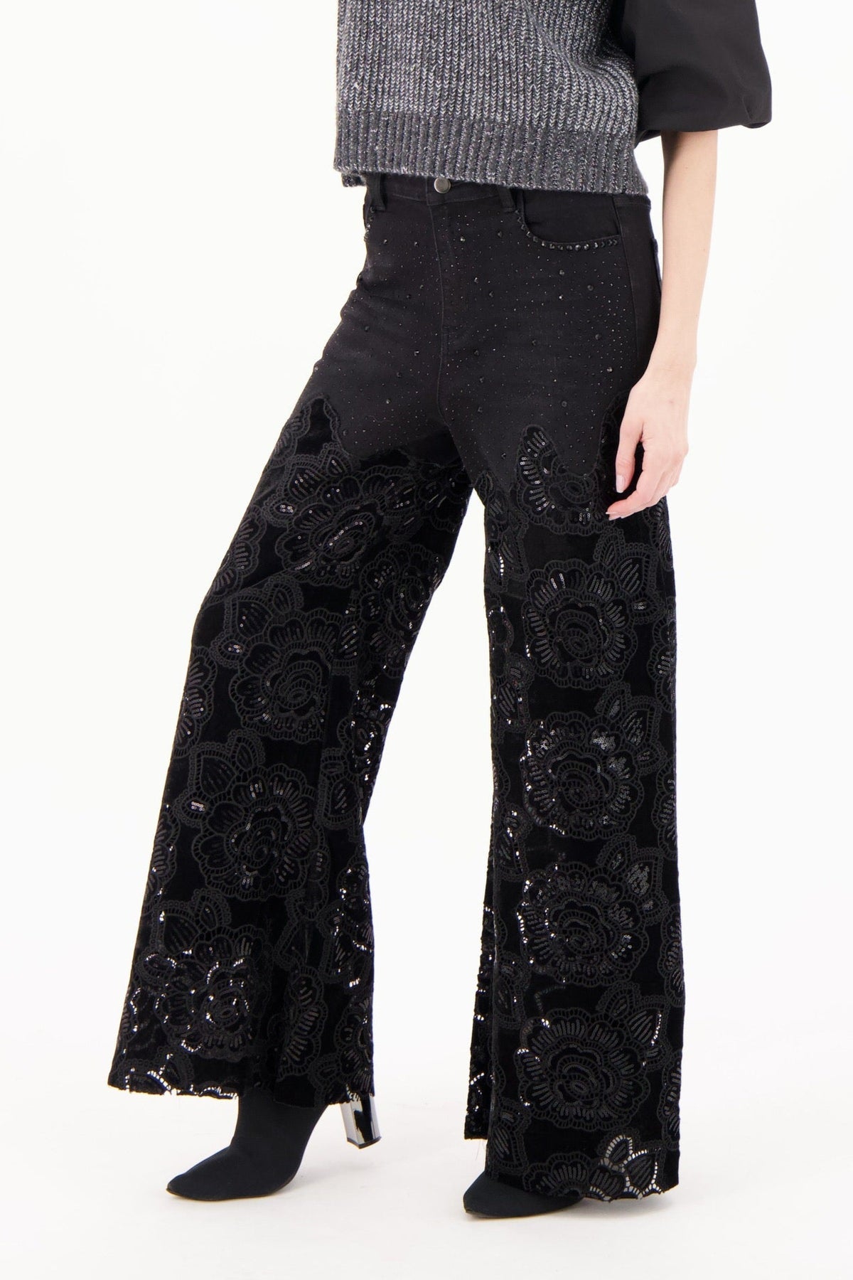 Floral Cutout Velour Denim Pant 30" Inseam, Front Zip and Button Fly, Front and Back Pockets, Wide Leg. Fabric: 85% Cotton, 13% Polyester, 2% Spandex