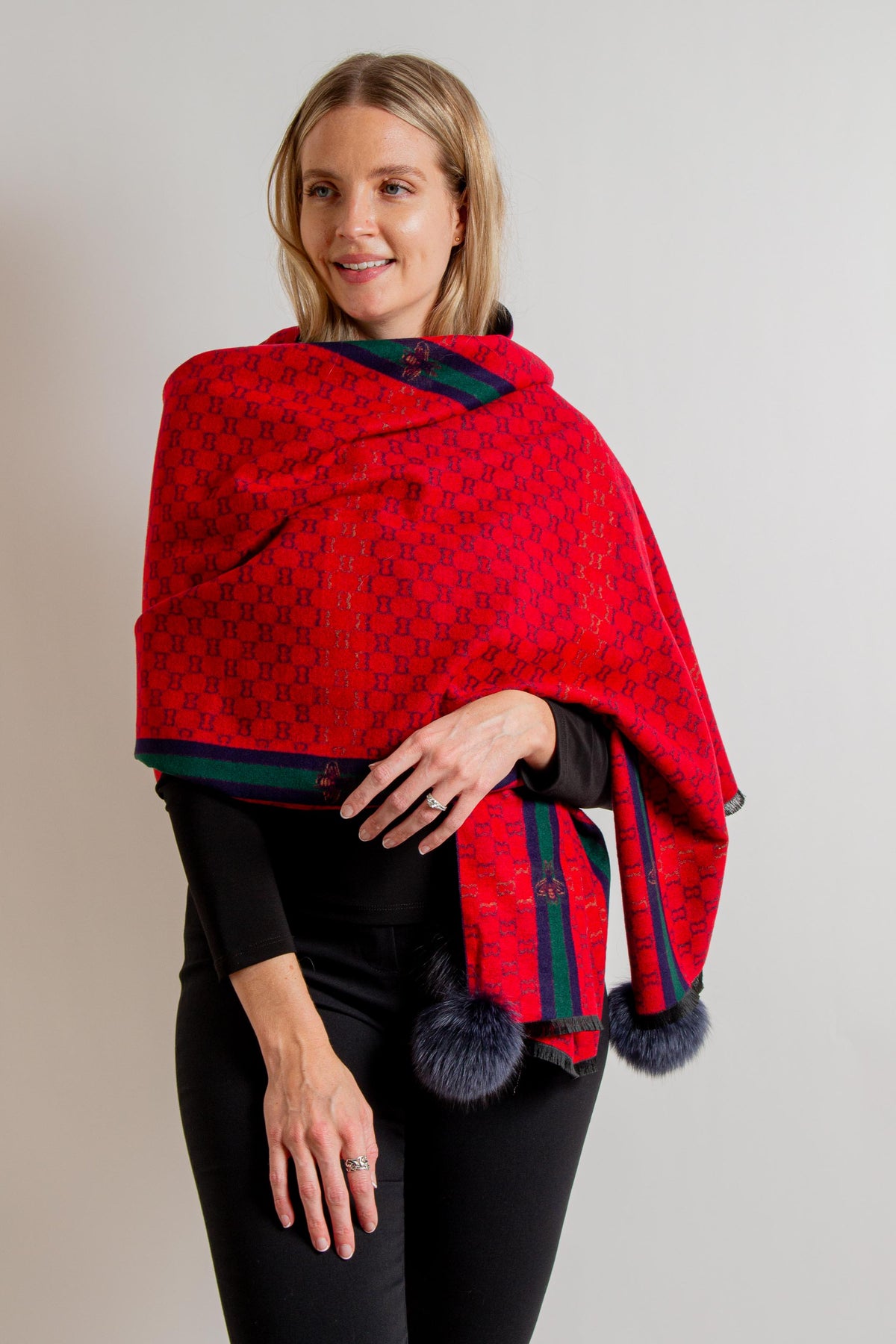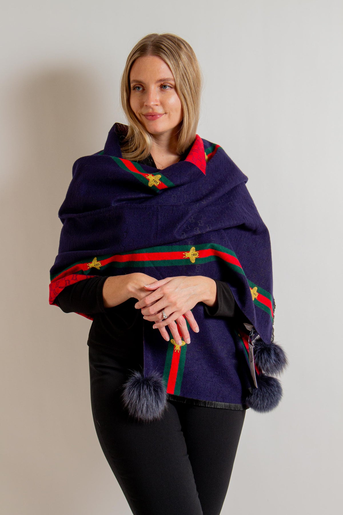 Navy Woven Scarf with Red/ Green Stripe, Bee Print and Monogram Pattern with Pom Poms at Trim.