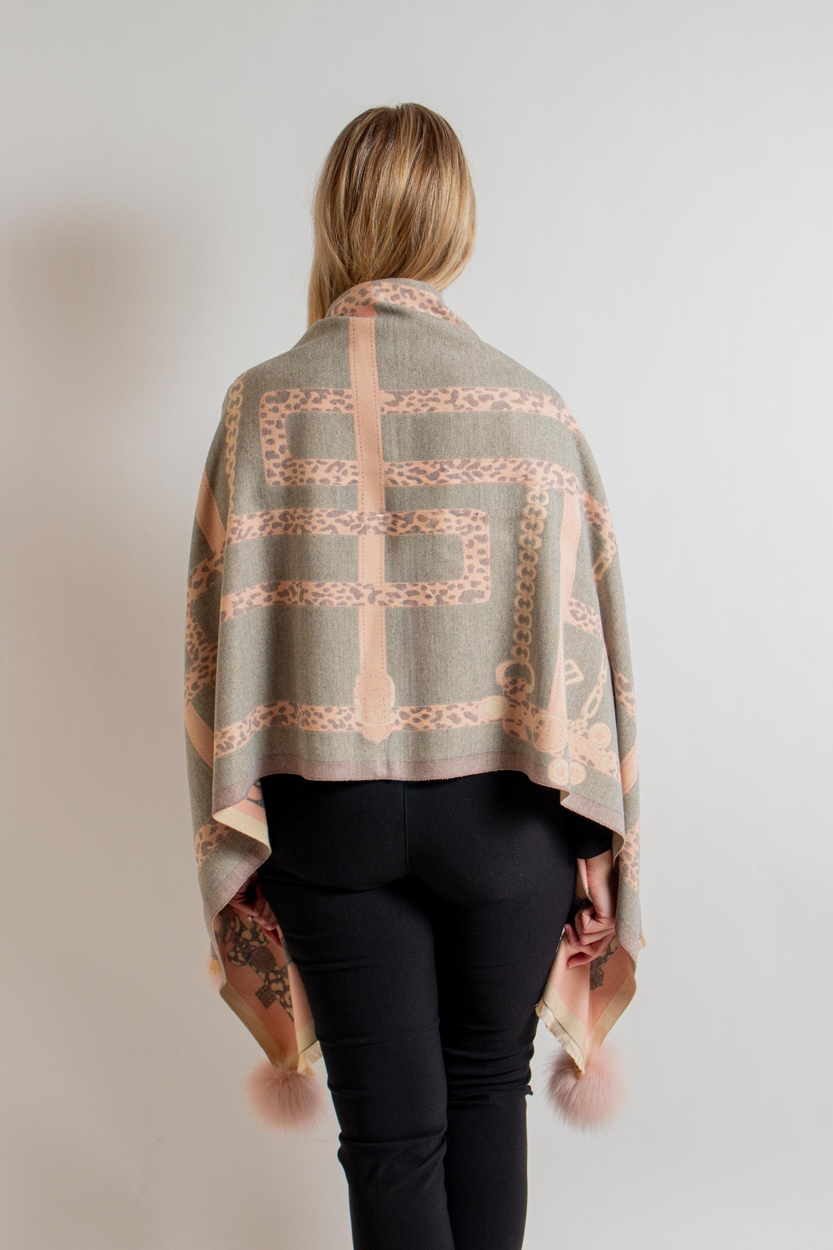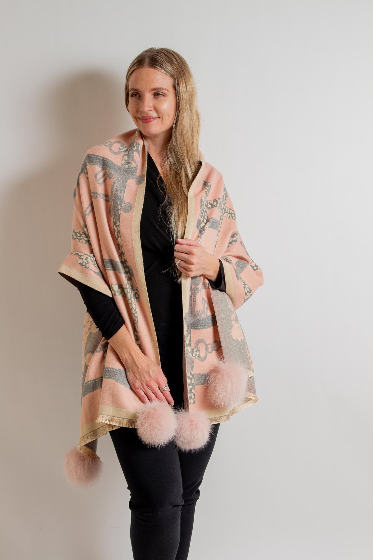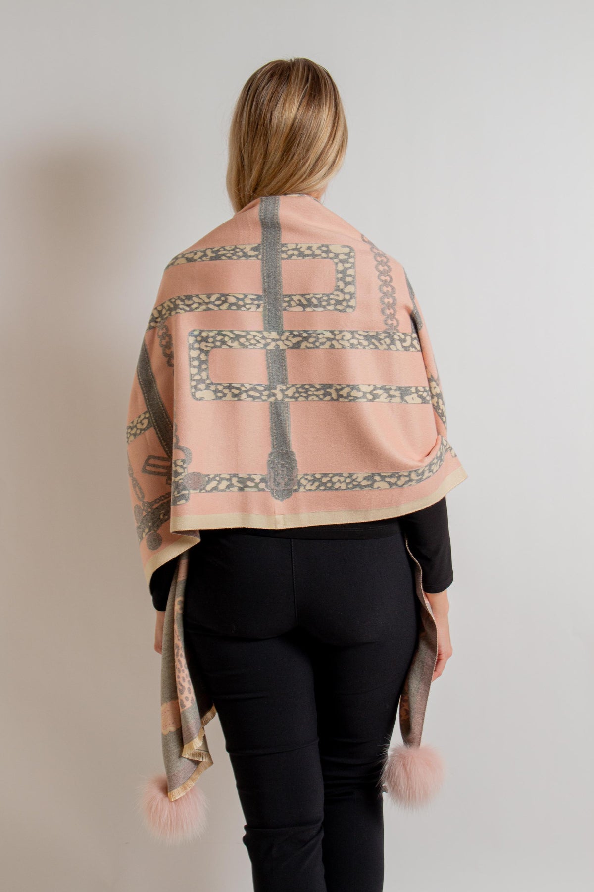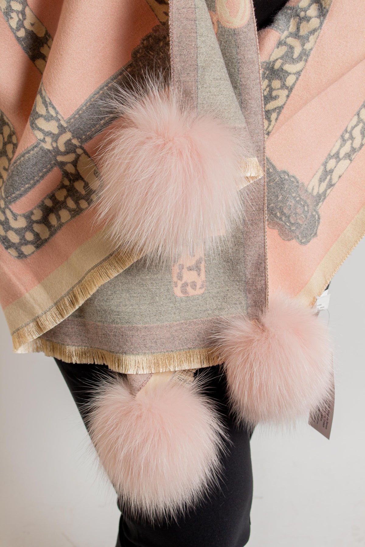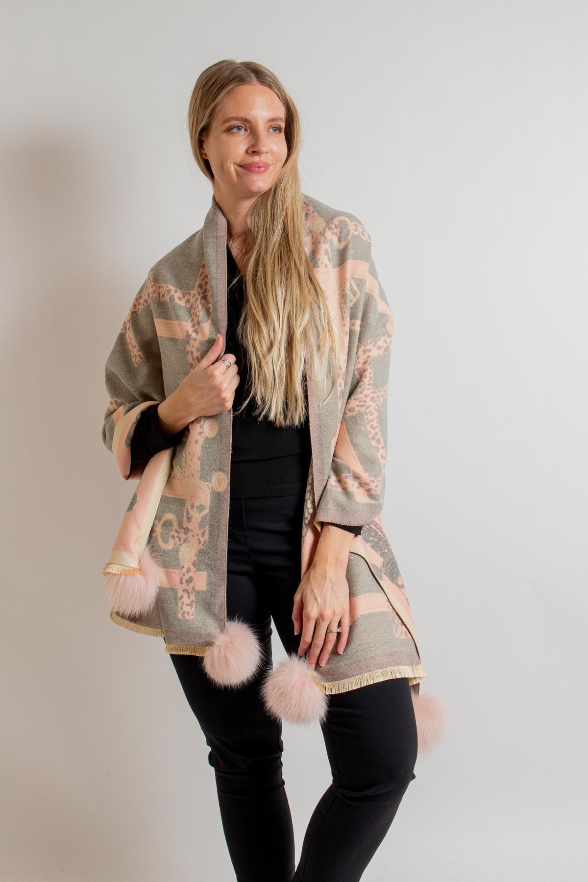 Soft Pink & Grey Animal Print Scarf with Pink Pom Poms and Fringe Accents