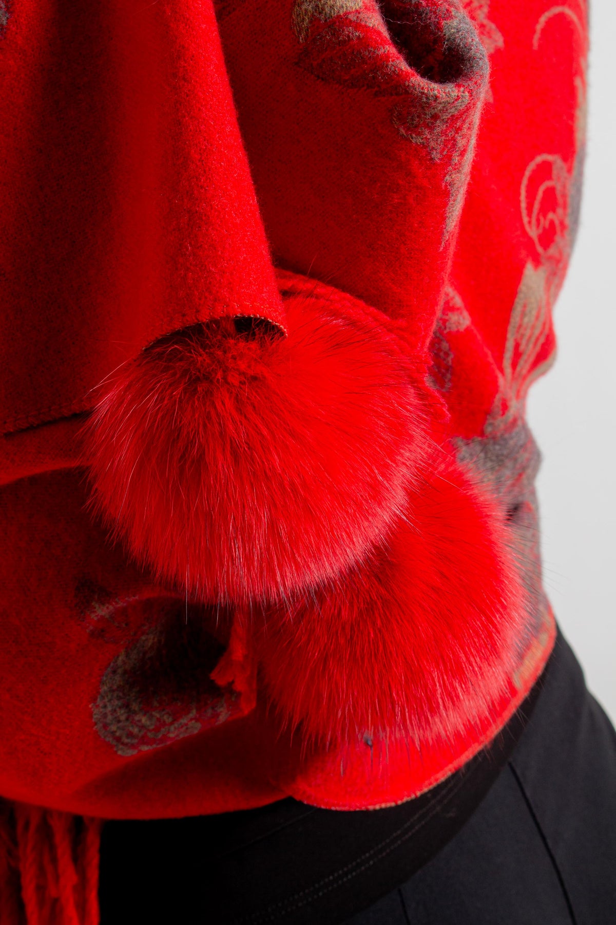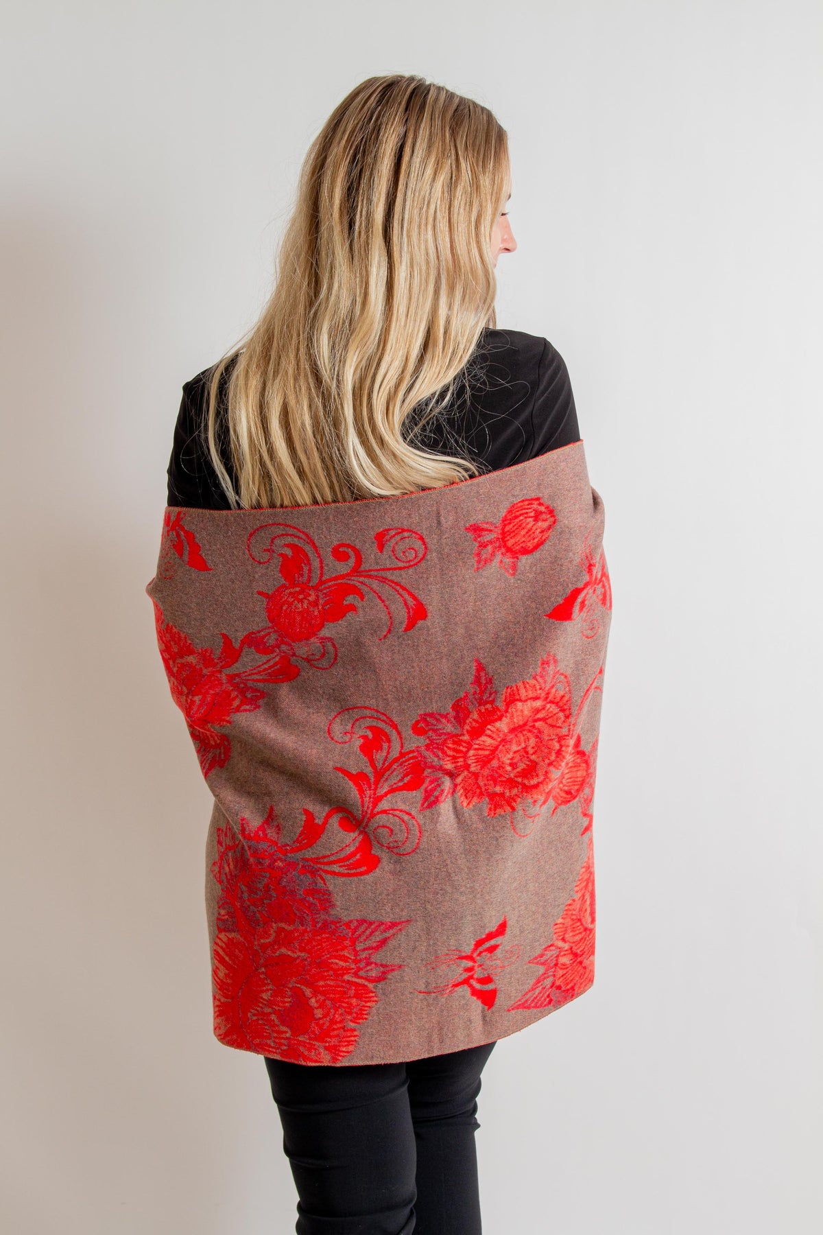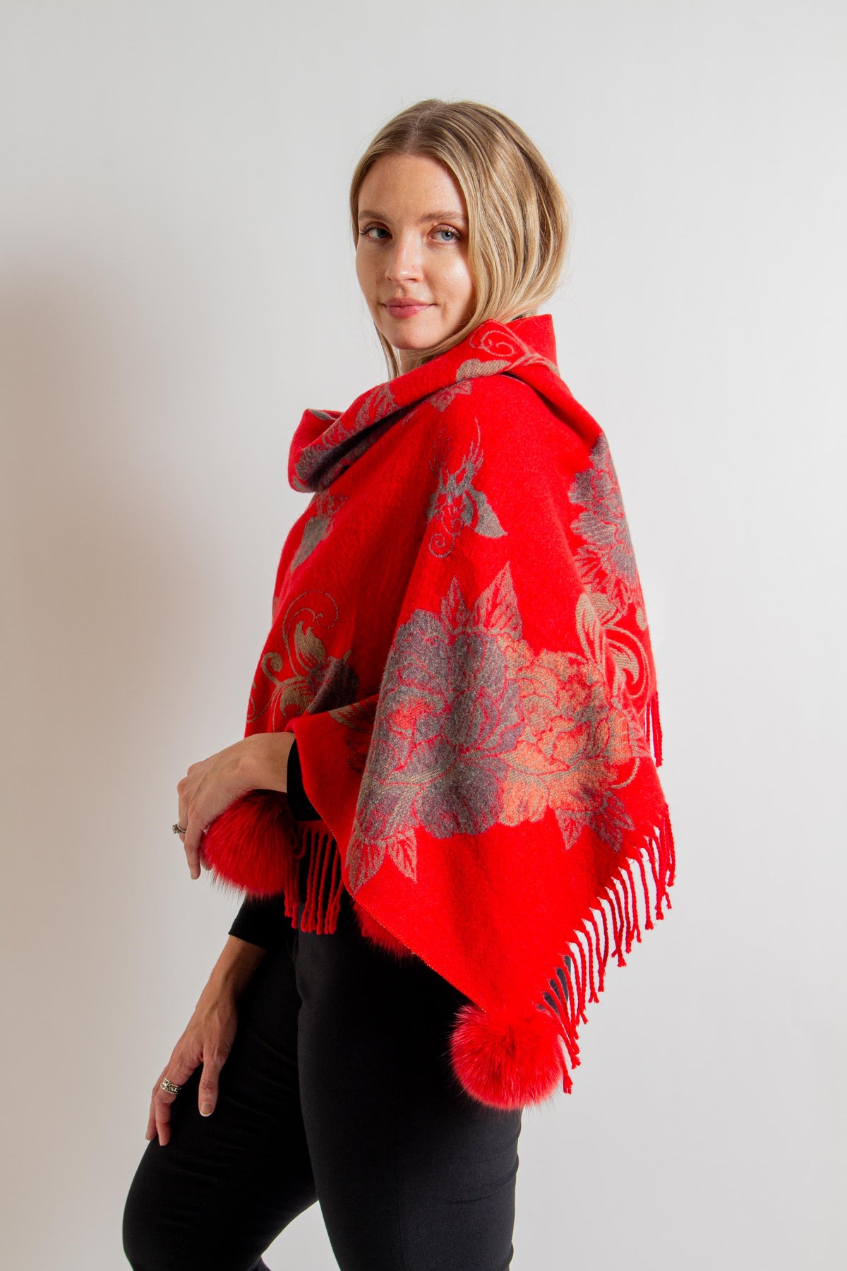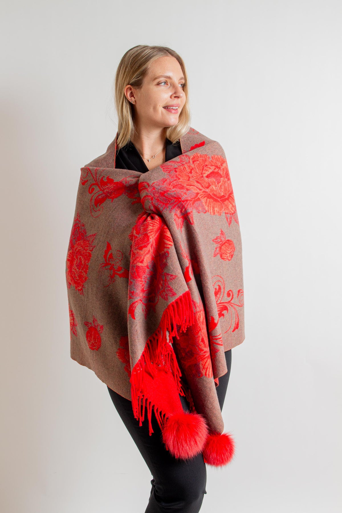 Red/ Grey Floral Print Scarf with Fringe and Pom Poms