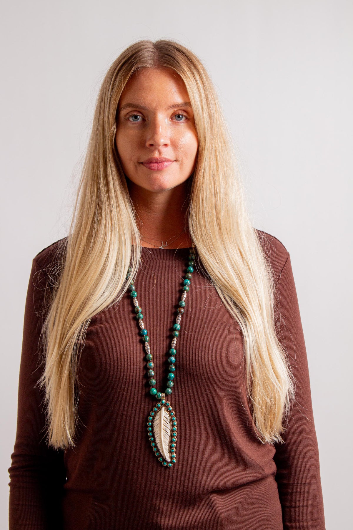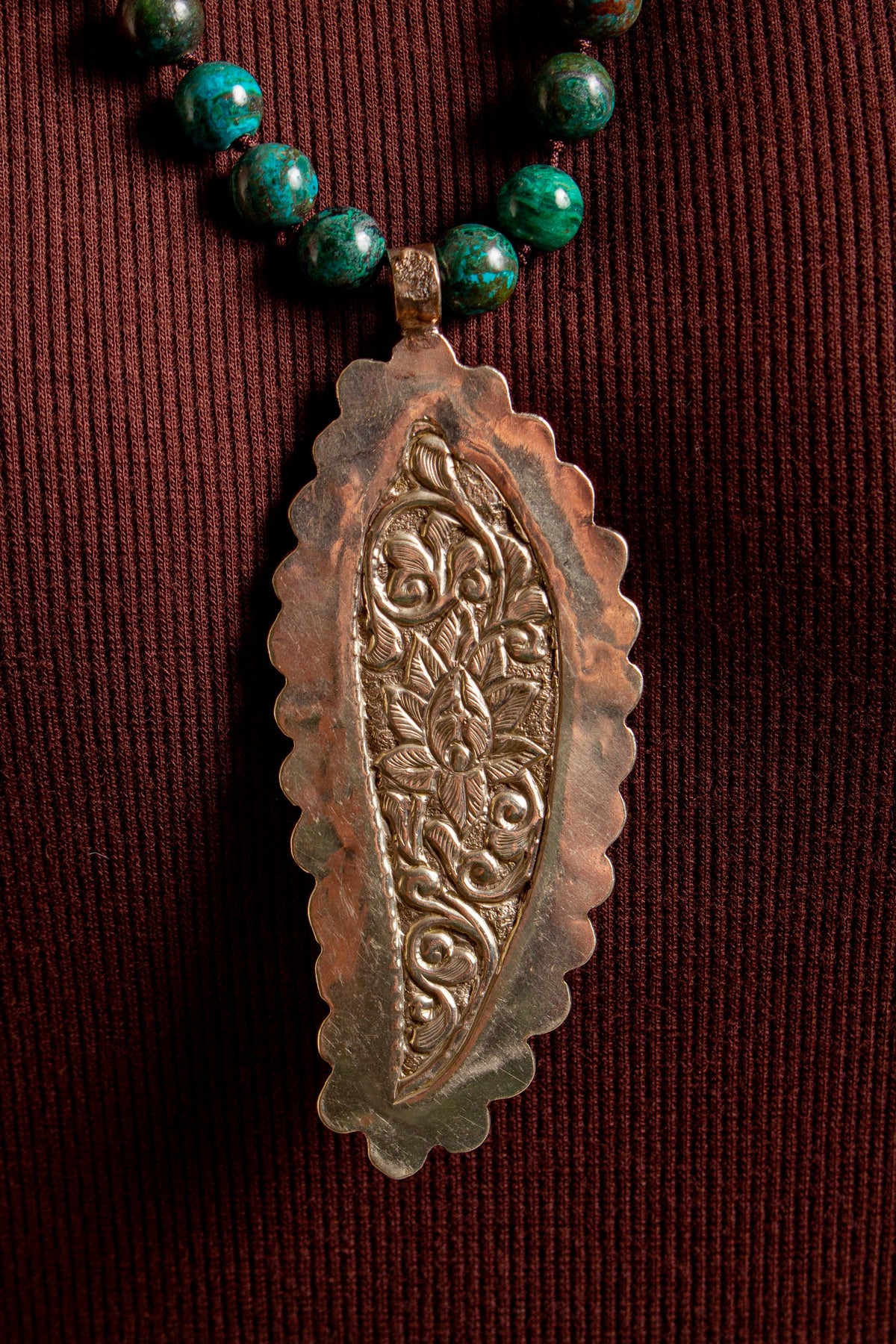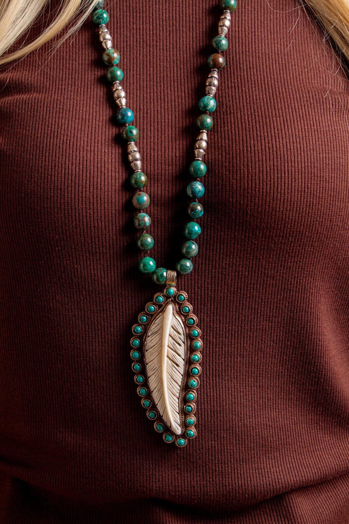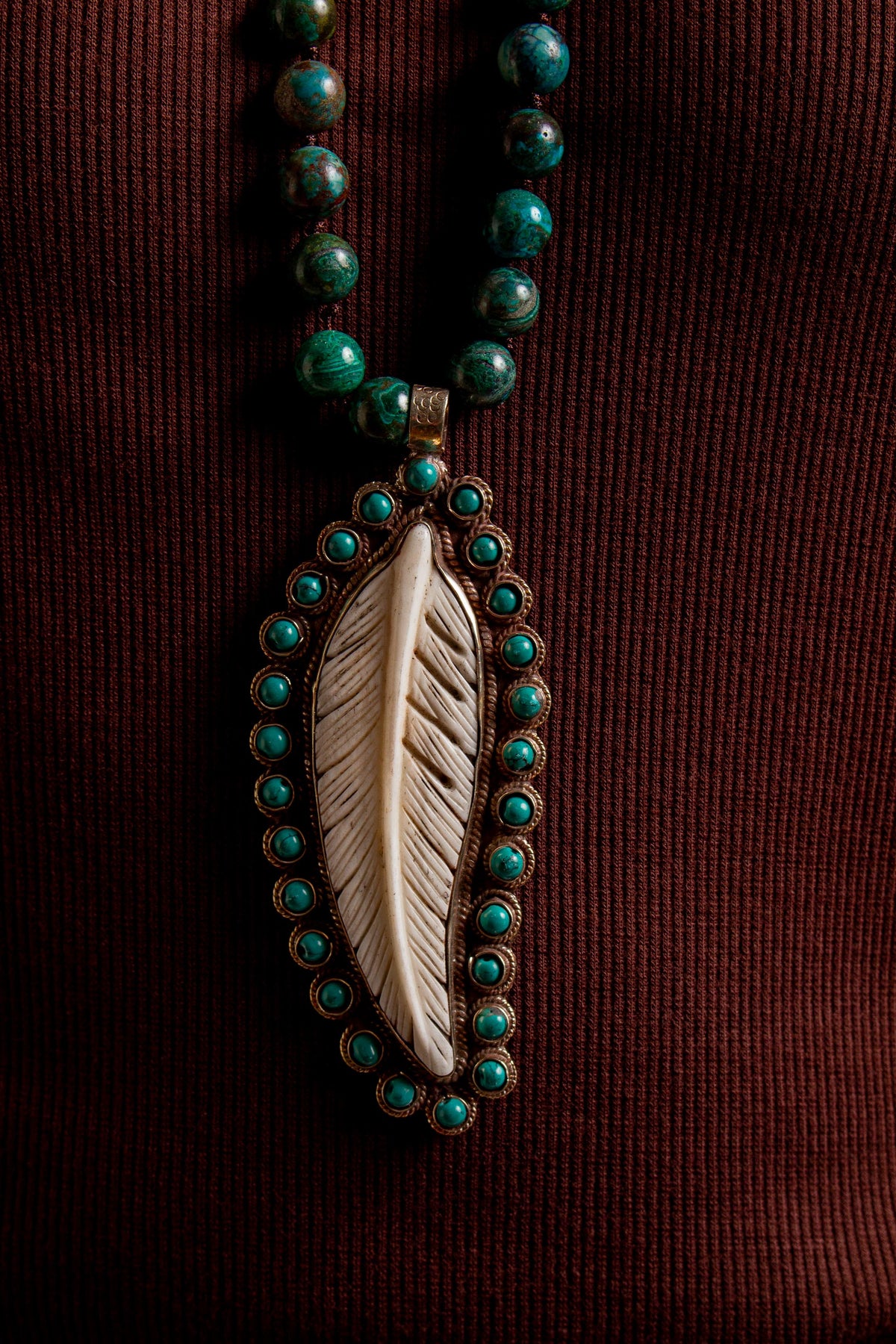 Hand Knotted Jasper Necklace with Carved Bone Feather with Tibetan Silver and Turquoise