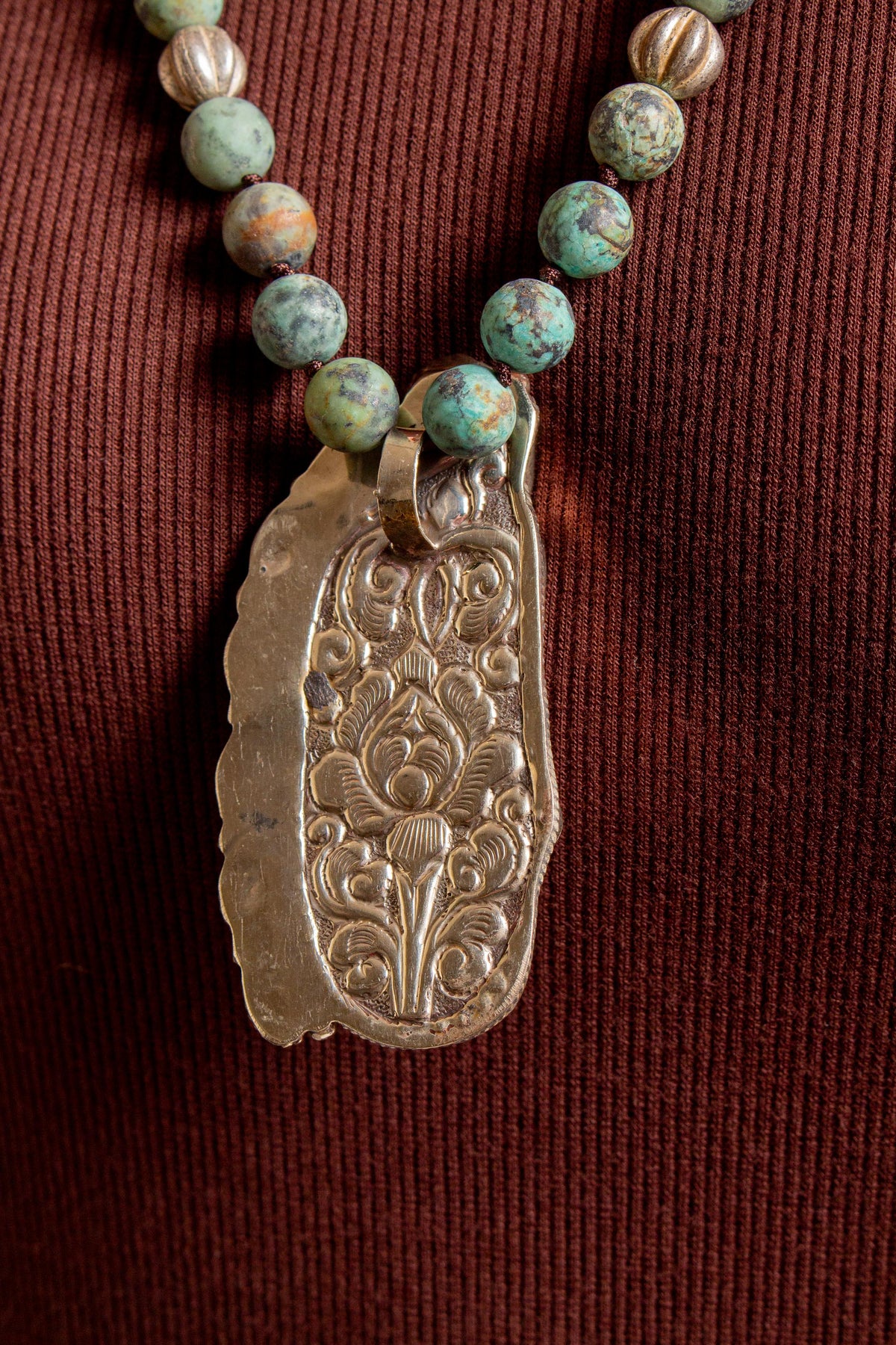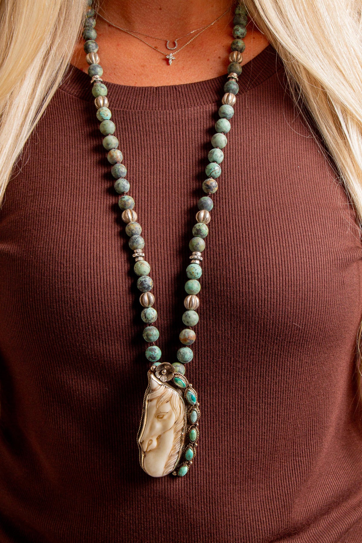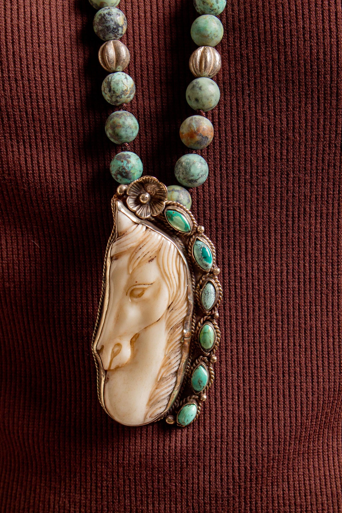 Hand Knotted African Turquoise Necklace with Vintage Beads and Carved Bone Horse with Turquoise