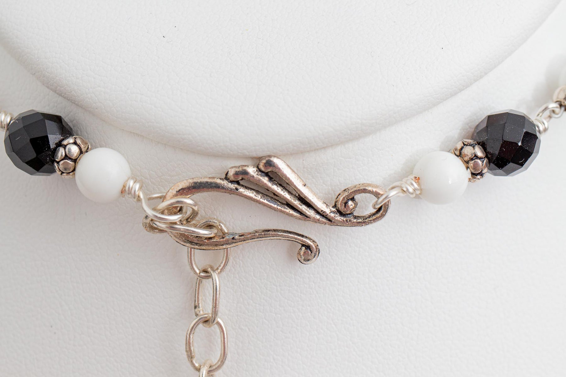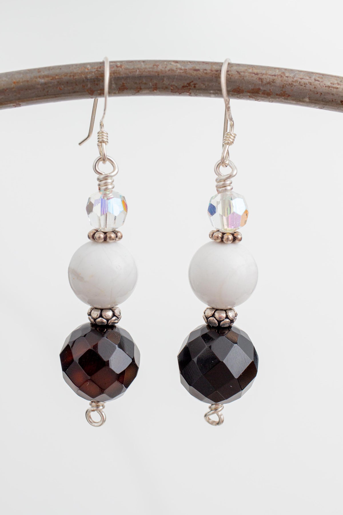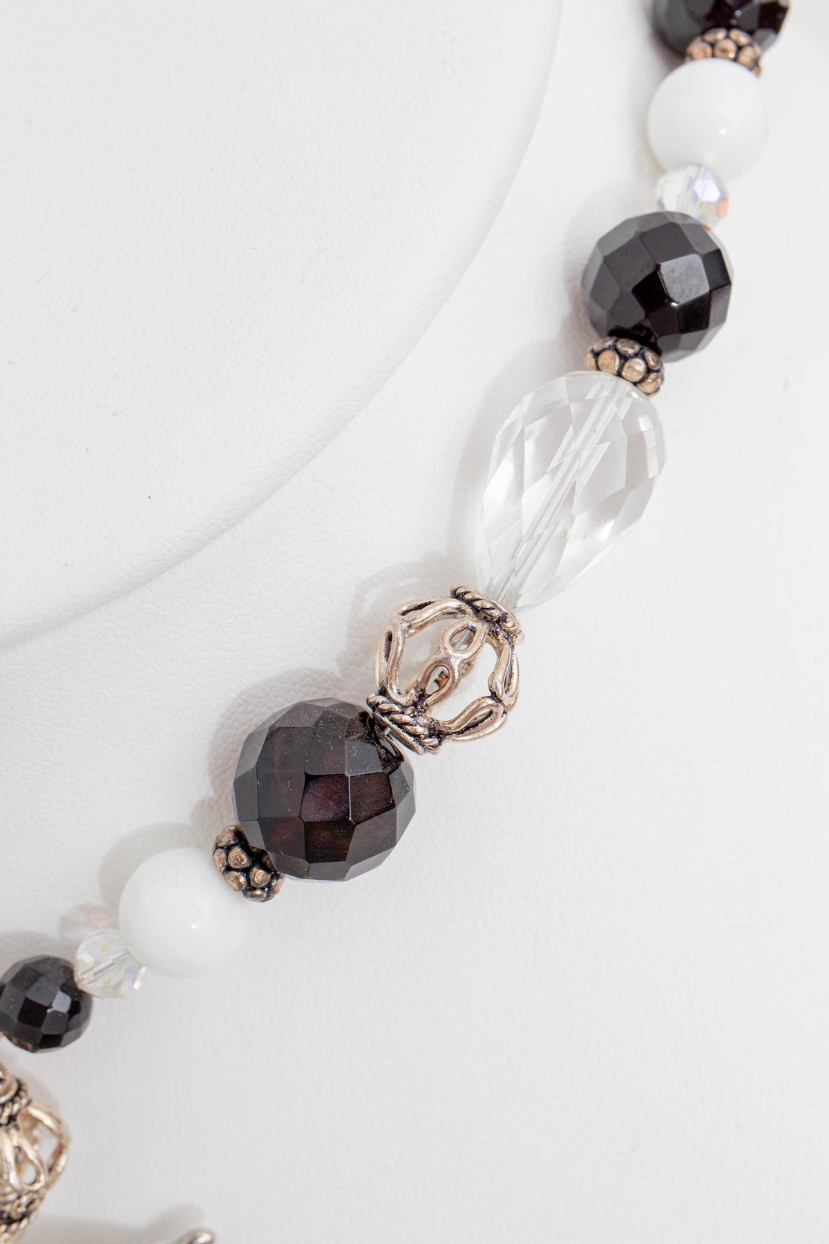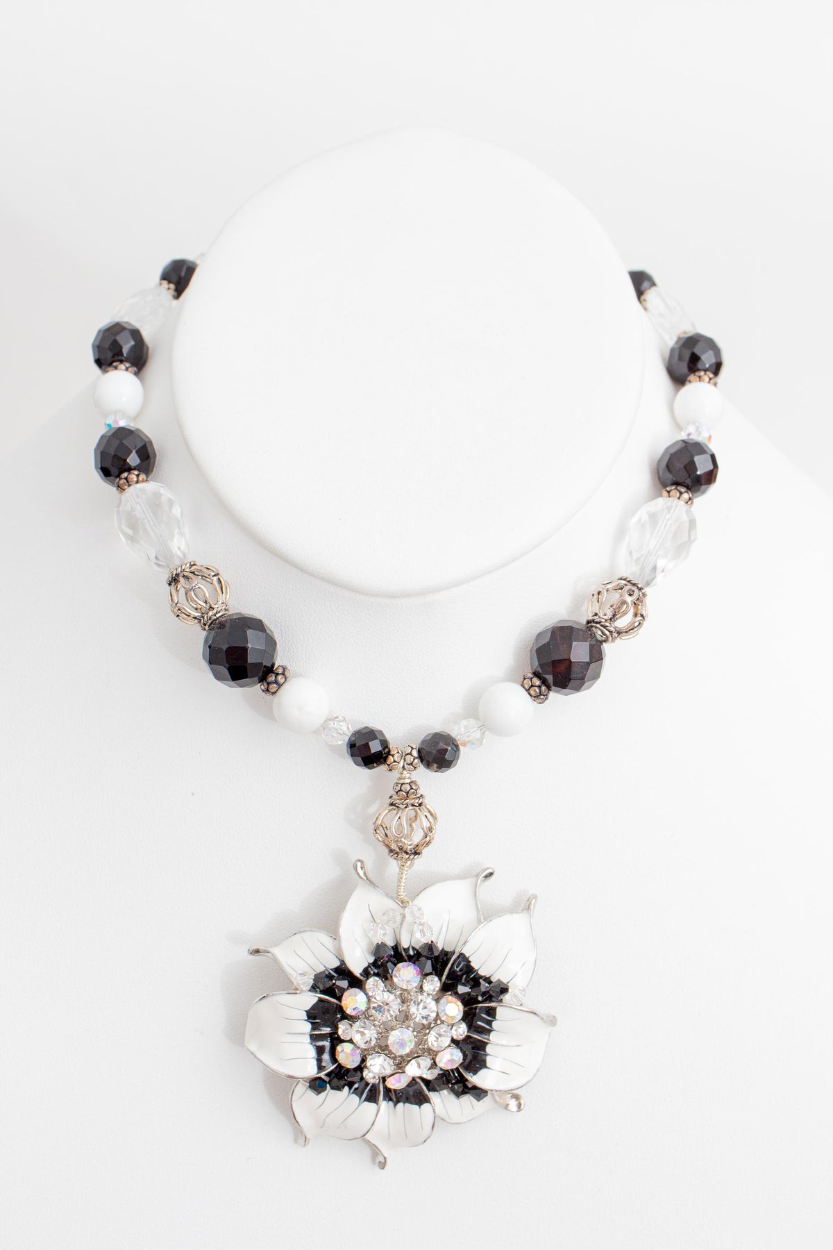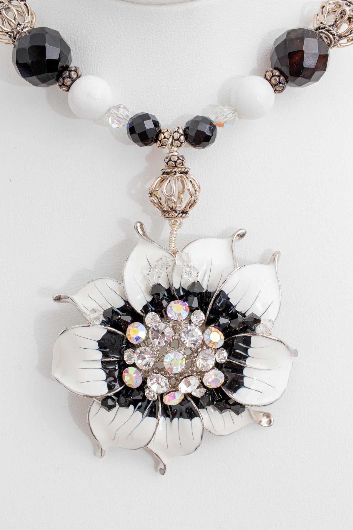 White and Black Enamel Flower Necklace with Rhinestones, Black Agate, Howlite, Crystal and Sterling Silver Beads. Comes with Matching Earrings