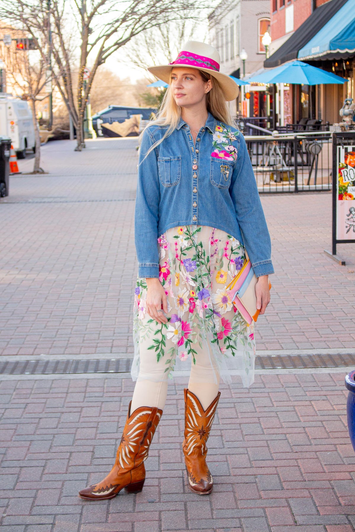 Denim/embroidered mesh long sleeve button-up duster with 2 contrast velvet elbow patches, upper left front with floral embroidered patch, 2 front pockets, 1 crystal button attached to CF placket