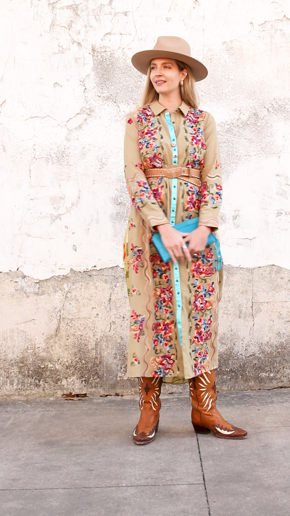 Embroidered button-up duster with peacock floral print on the back, 2 side pockets, 2 crystal buttons attached to CF placket, side slits