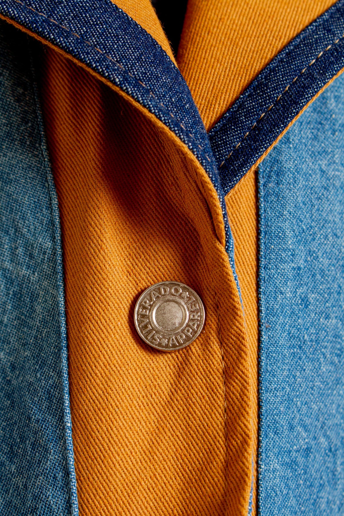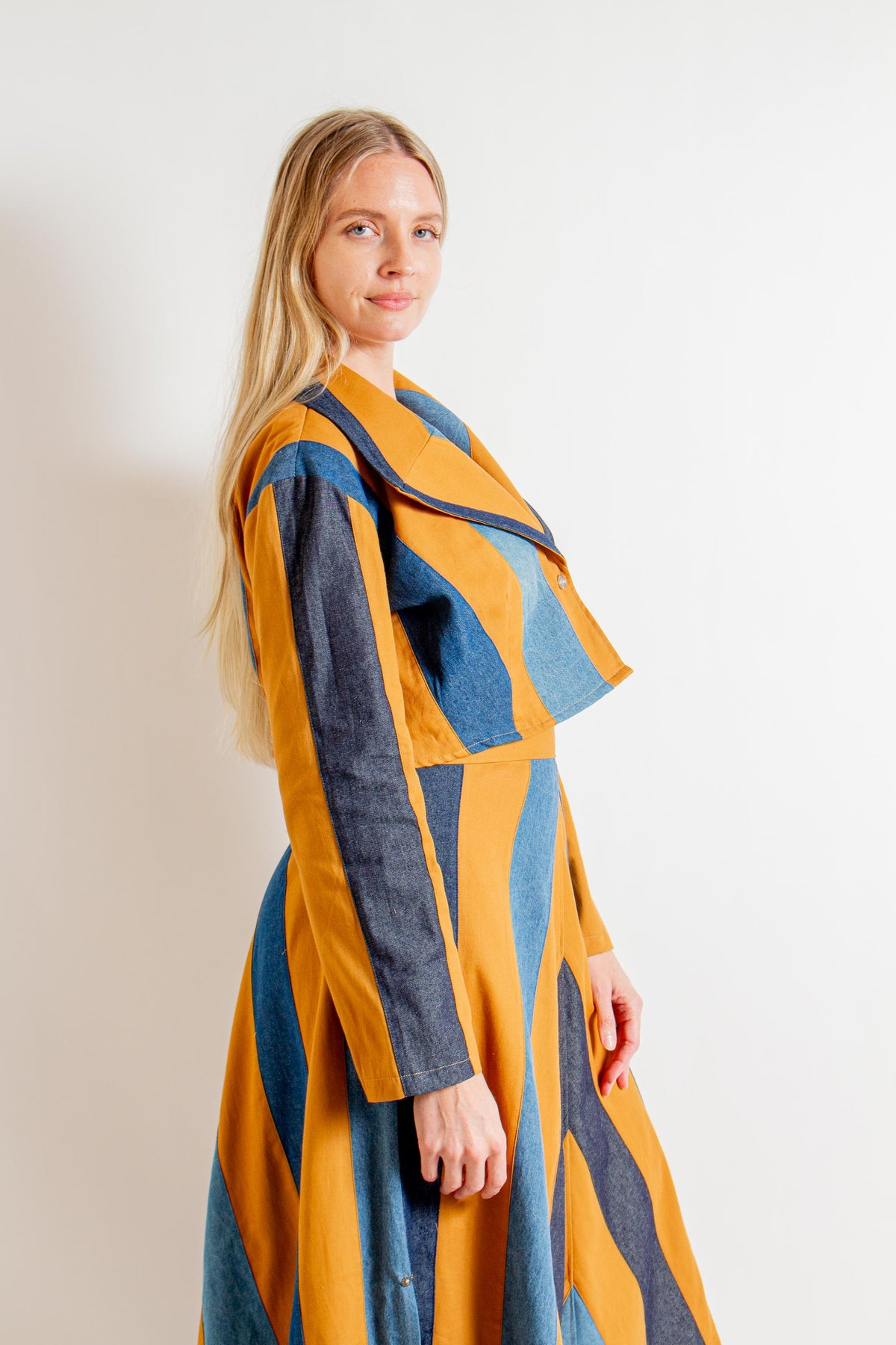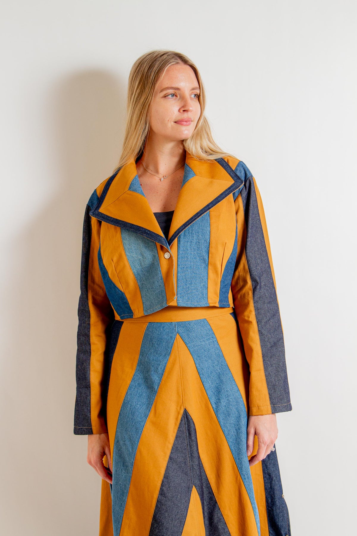 "Iris" Laramie Tan and Blue Denim Print Crop Jacket with V-Neck, Collar and Front Button Closure. Fabric: 100% Cotton. Dry Clean Only